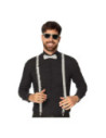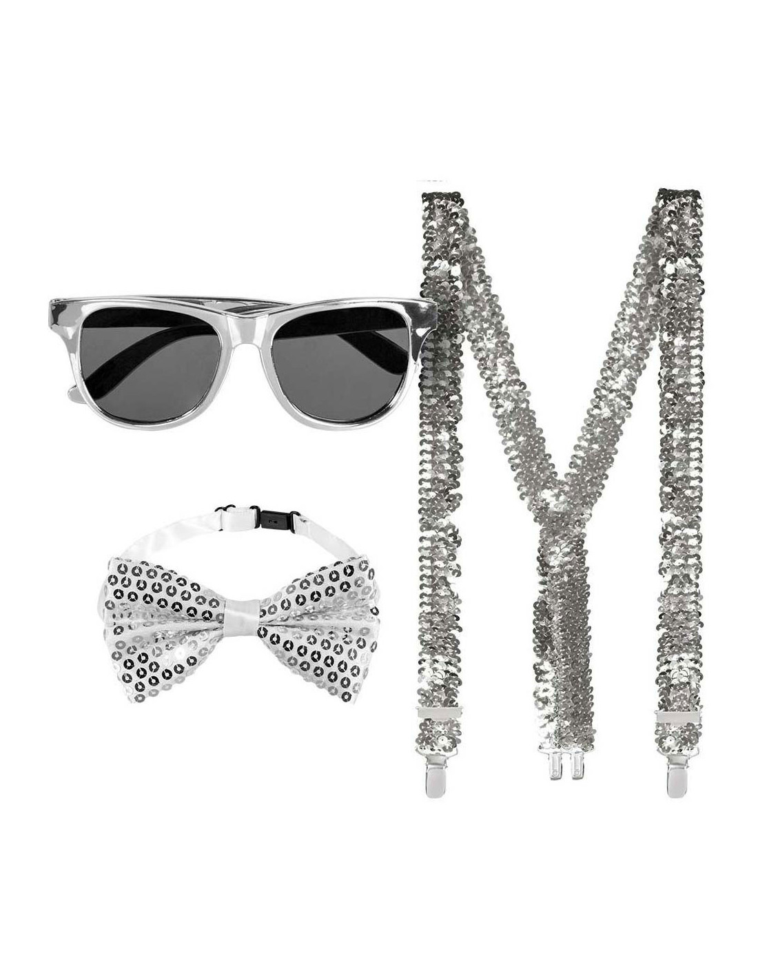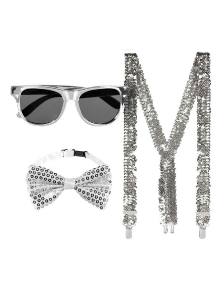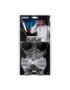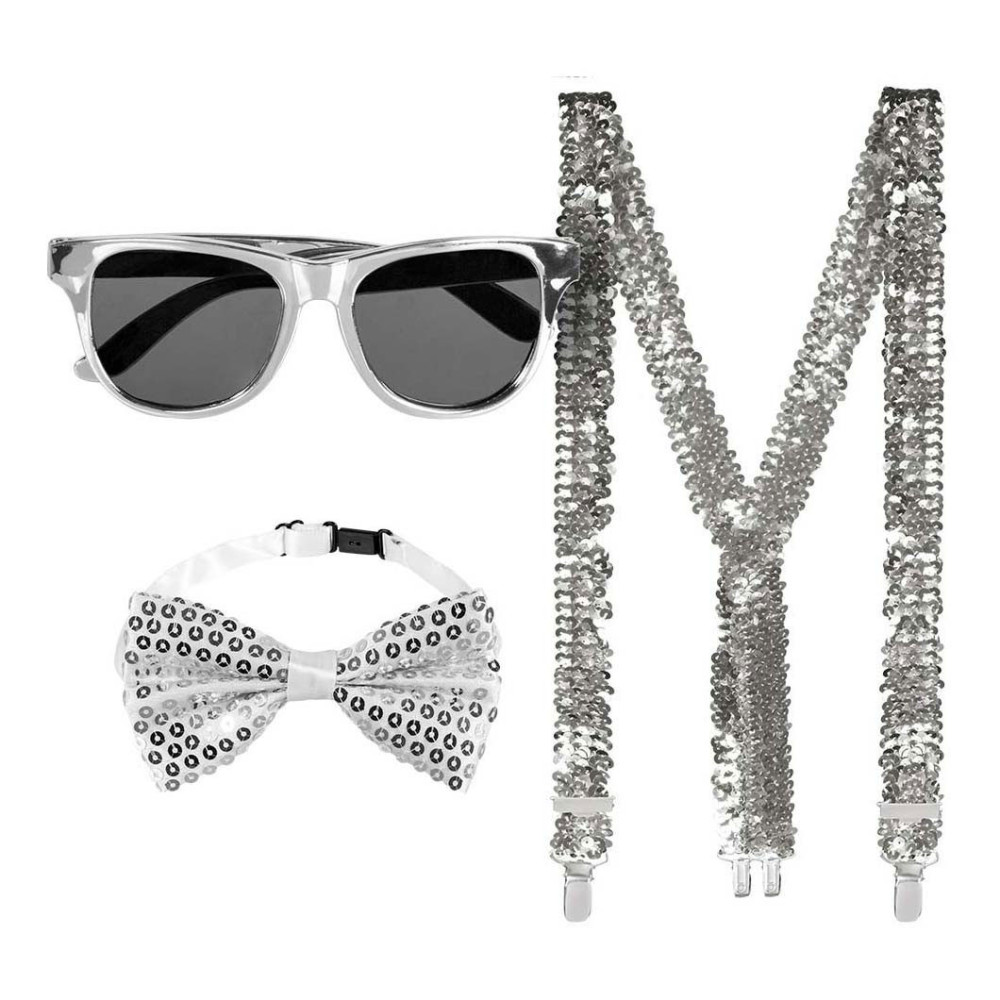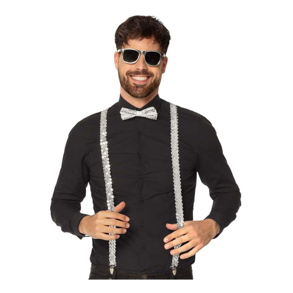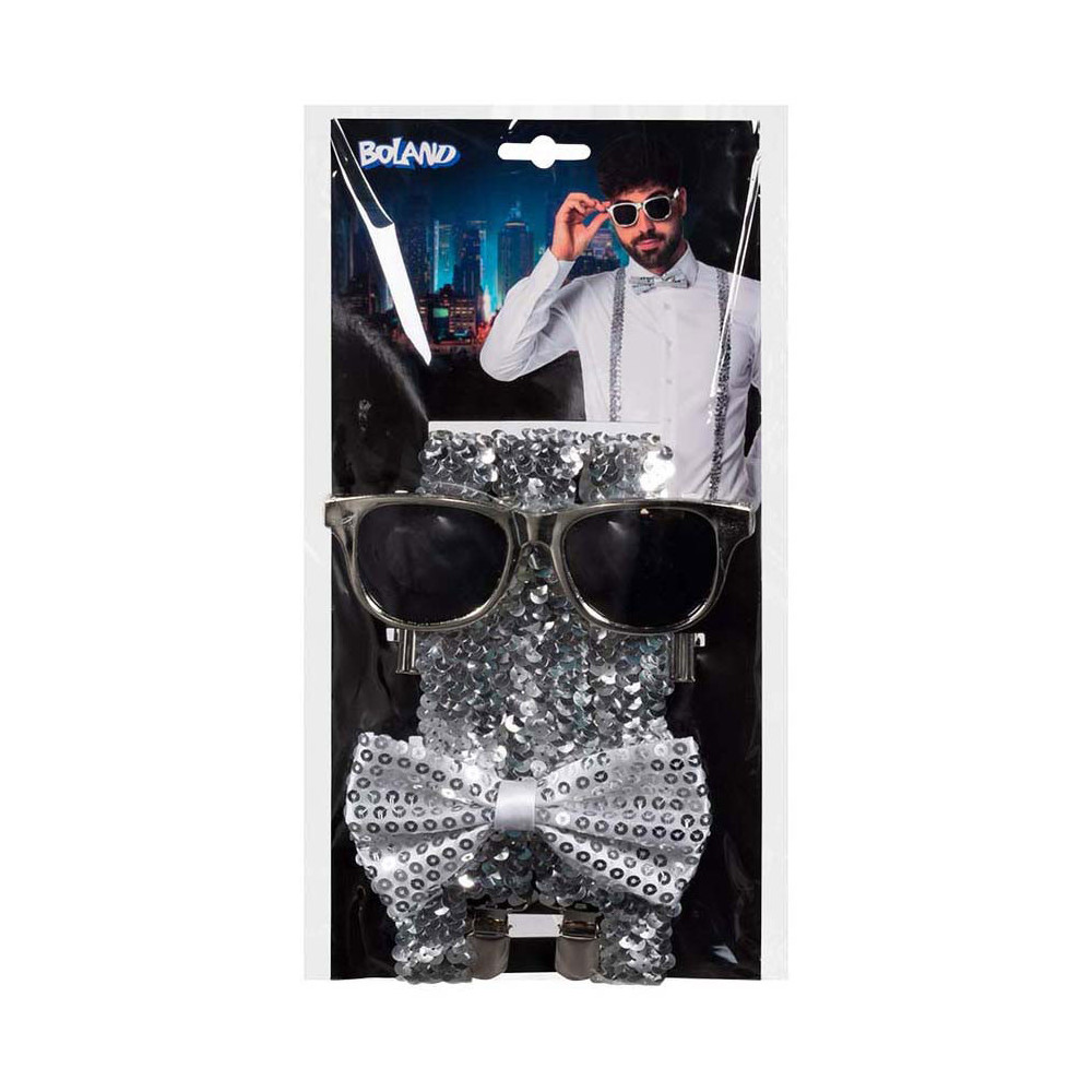 Zilveren accessoireset bestaande uit partybril, vlinderstrik en bretels. Gemaakt van diverse materialen. Geschikt vanaf 14 jaar.