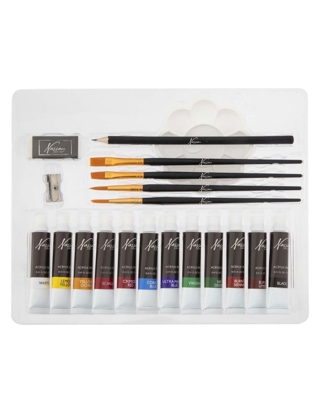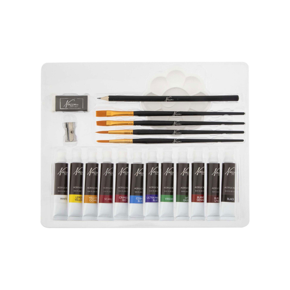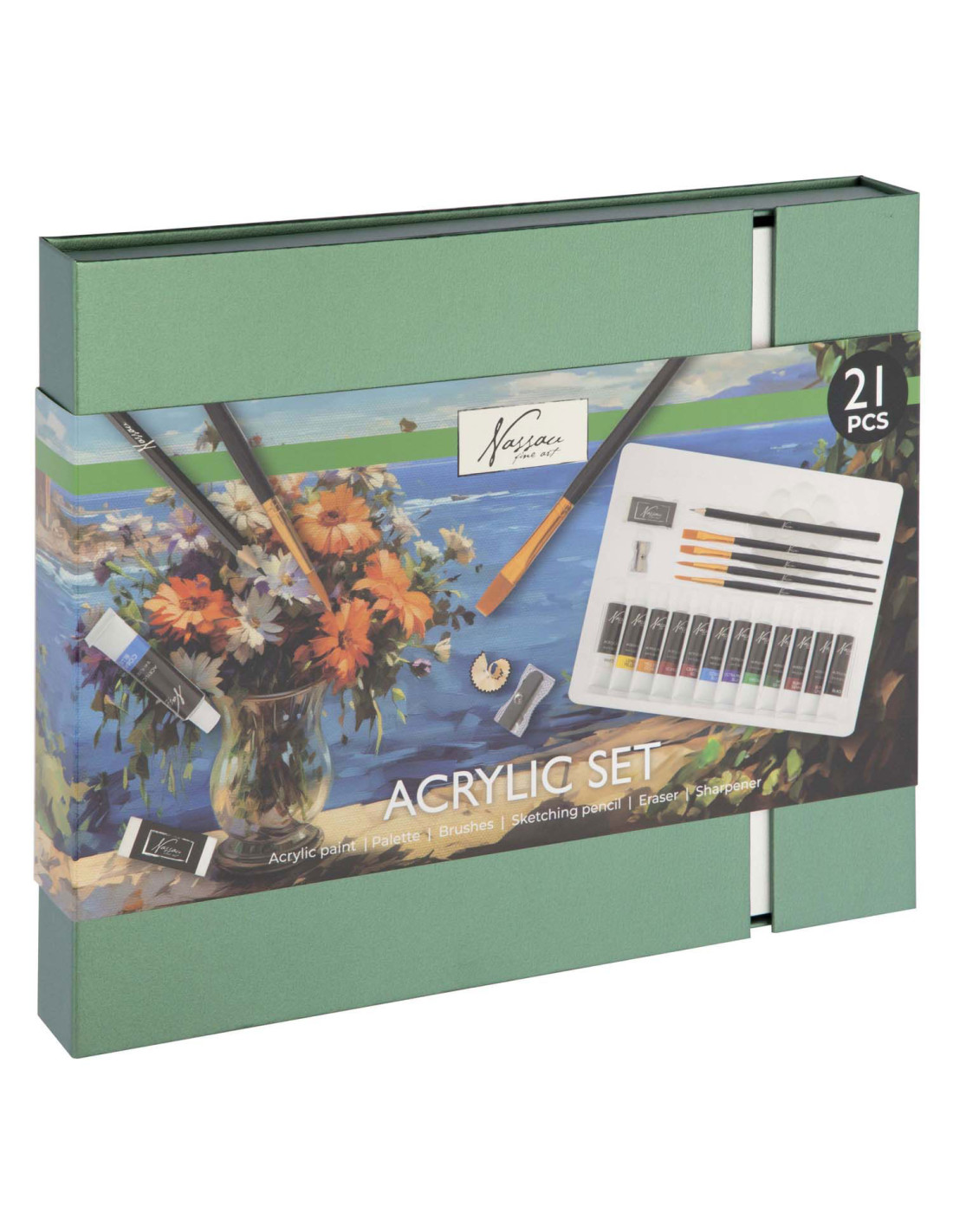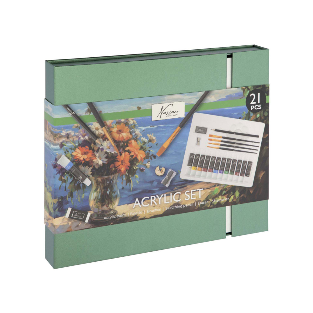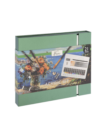 Acrylic 21-delige set. Deze set bevat acrylverf, een palette, schetspotlood, gum en een slijper.