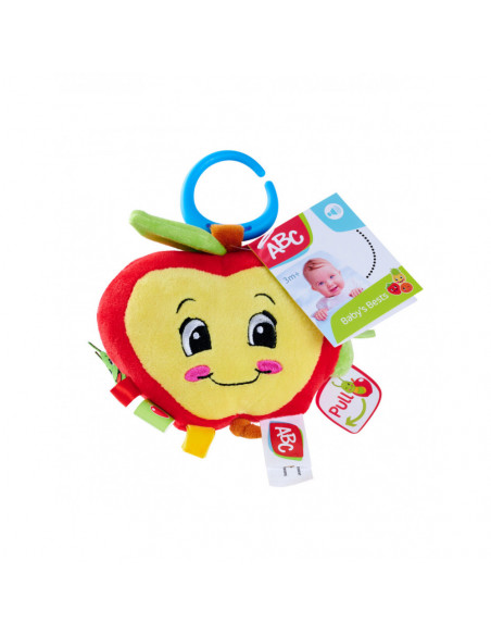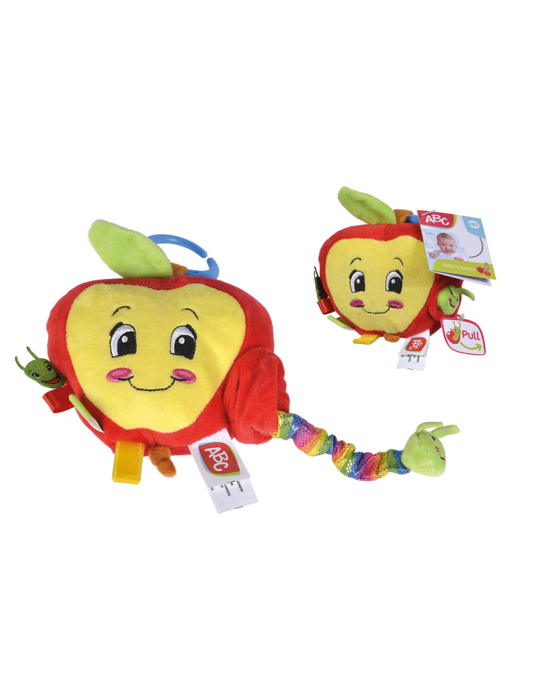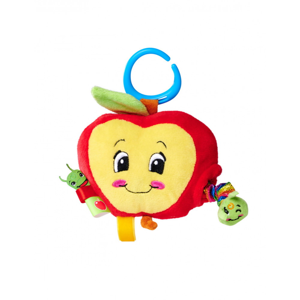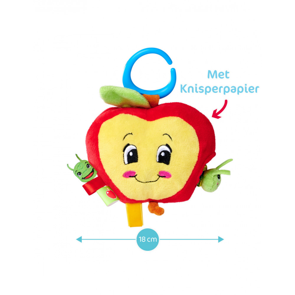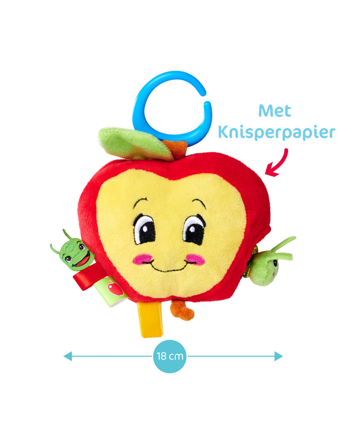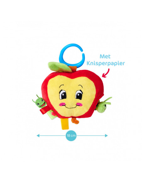 Knuffel appel met rups met pullback functie. Aan de appel zit een grote haak om het speeltje ergens aan vast te maken, bijvoorbeeld een kinderwagen. Geschikt voor baby's vanaf 3 maanden.