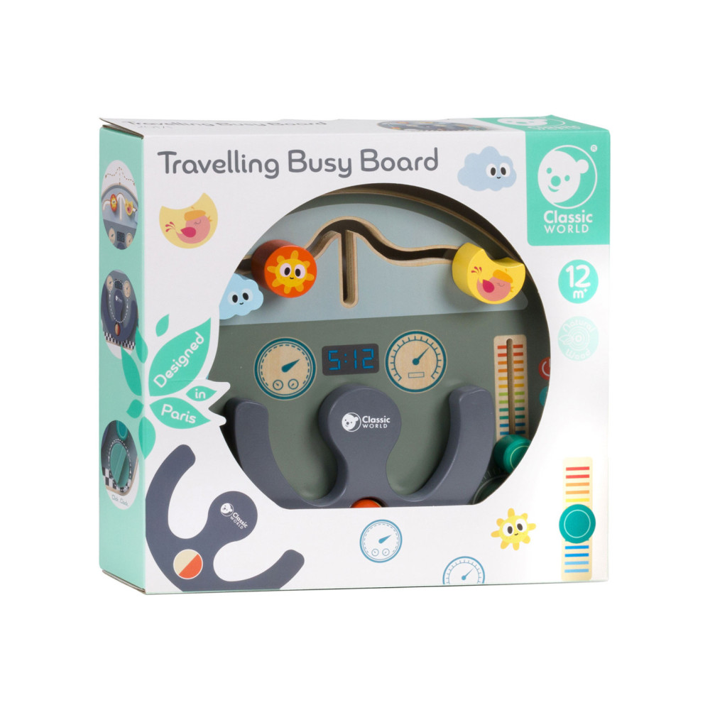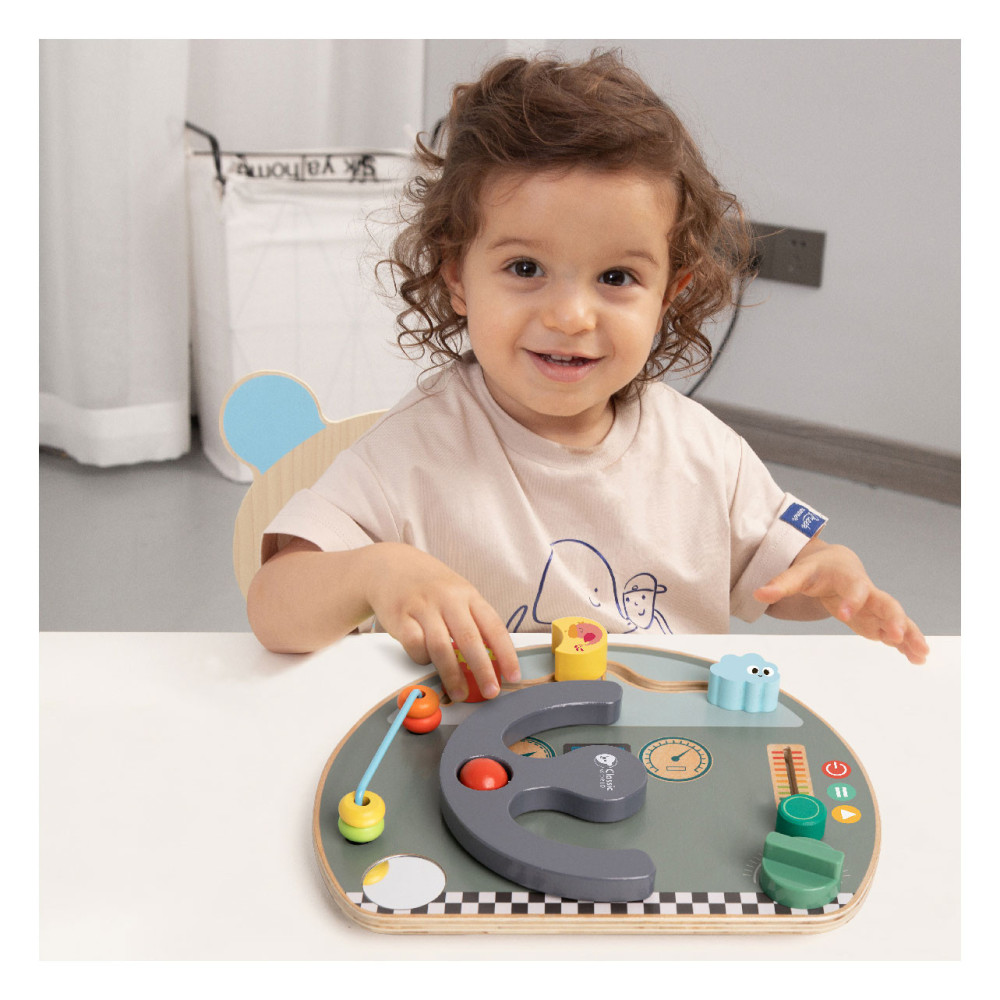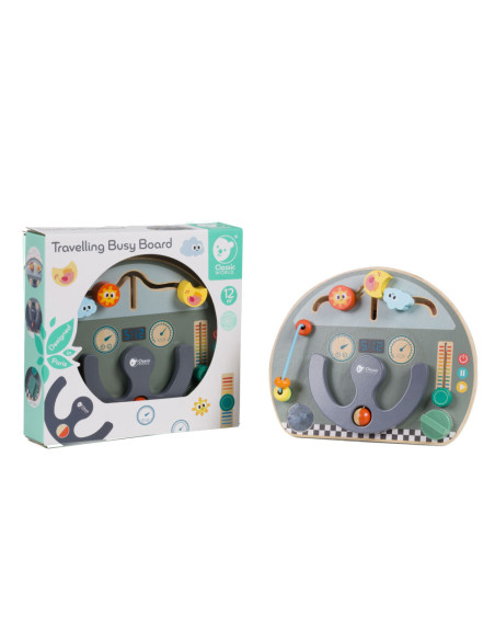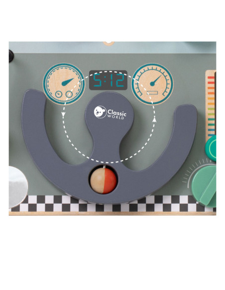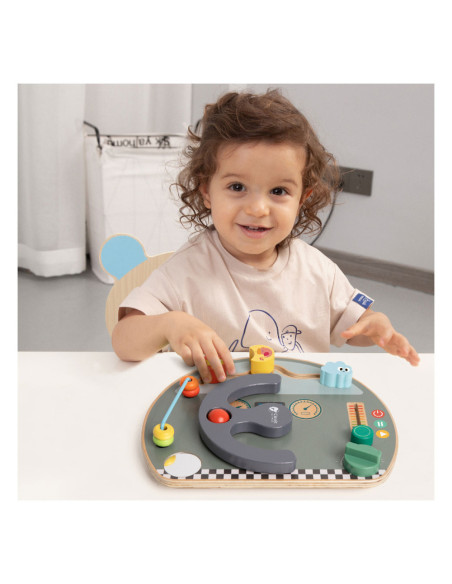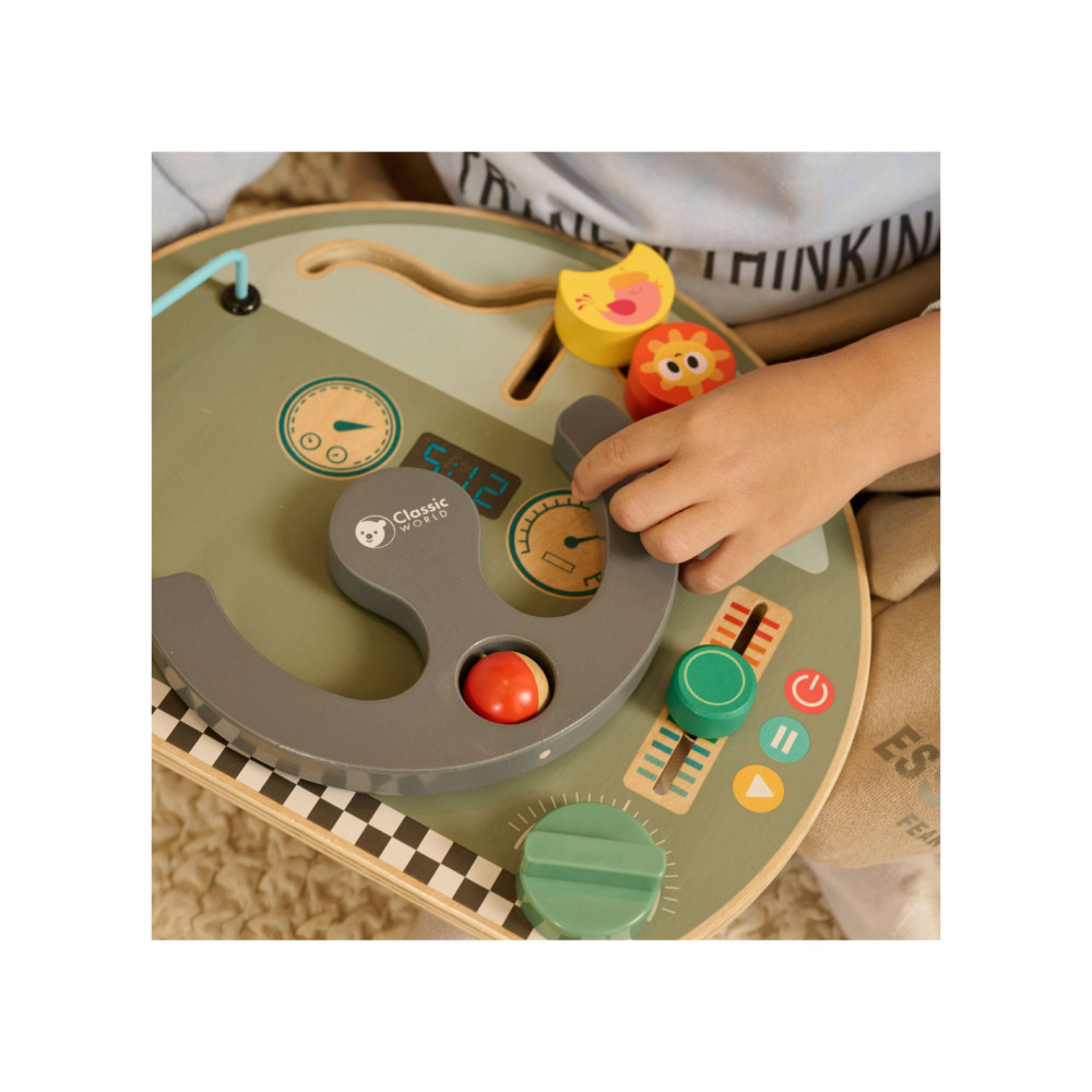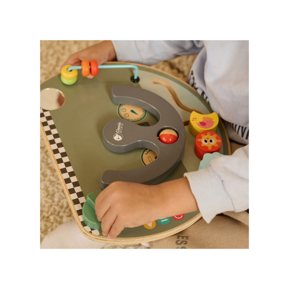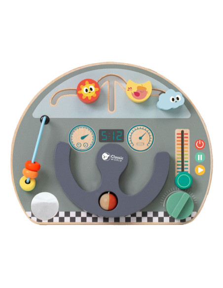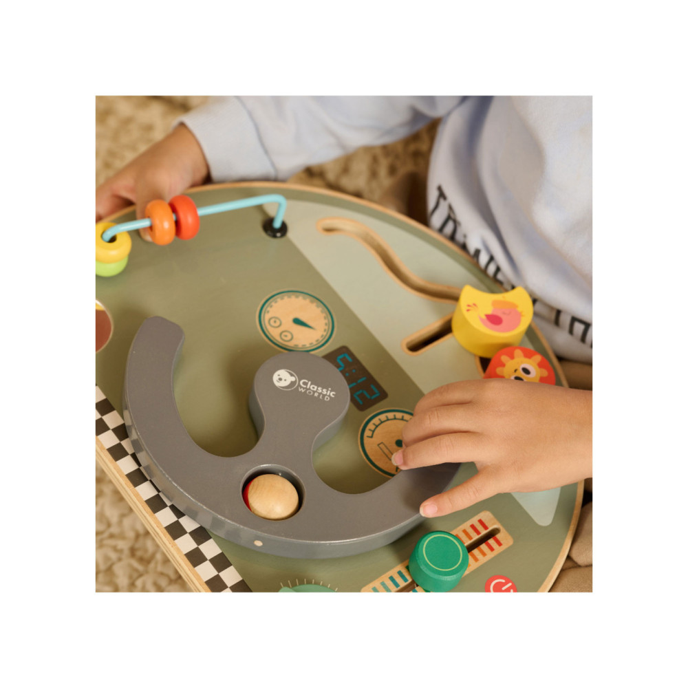 Houten activiteitenbord met diverse activiteiten voor het oefenen van de handmotoriek. Vormgegeven als bootdashboard met o.a. een stuur, beweegbare weerelementen en schuif- en draaiknoppen. Geschikt voor kinderen vanaf 12 maanden oud. Afmetingen: 29 x 23,5 x 5,6 cm.