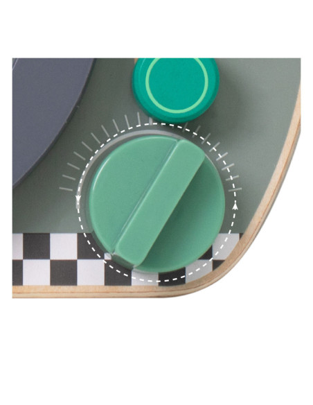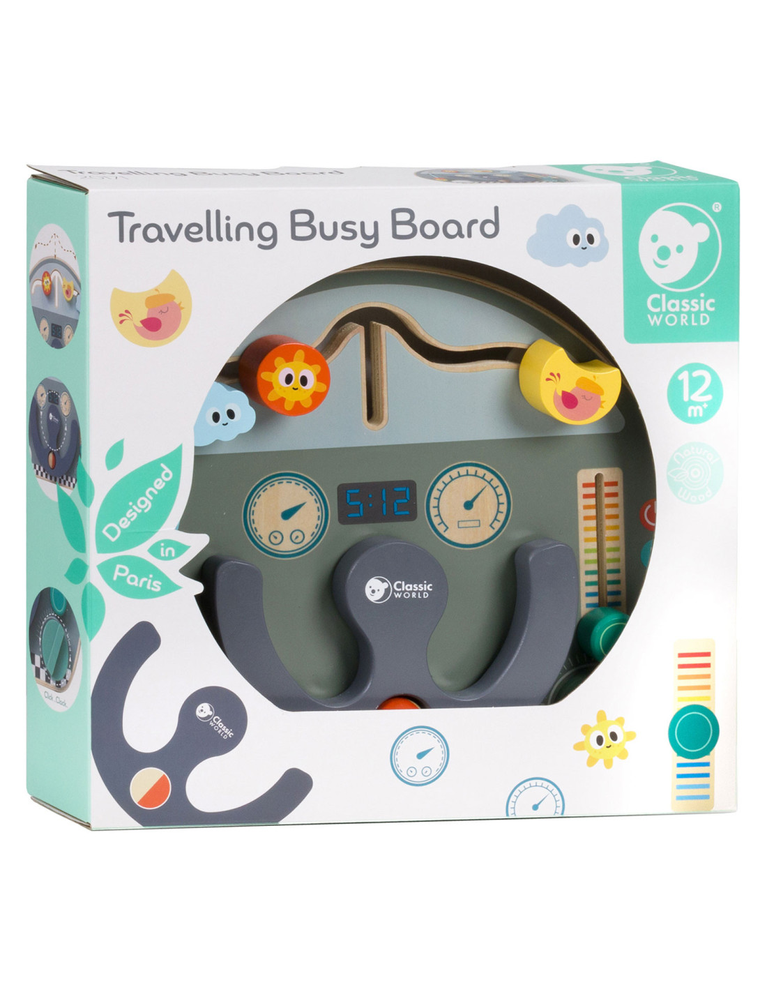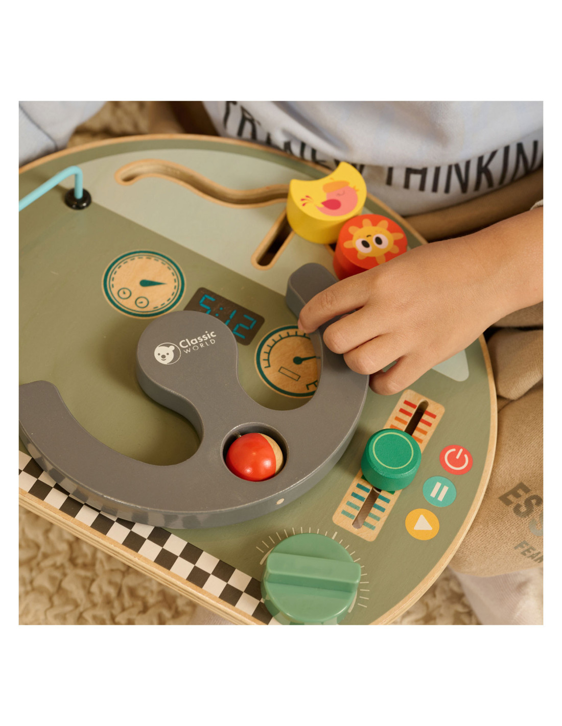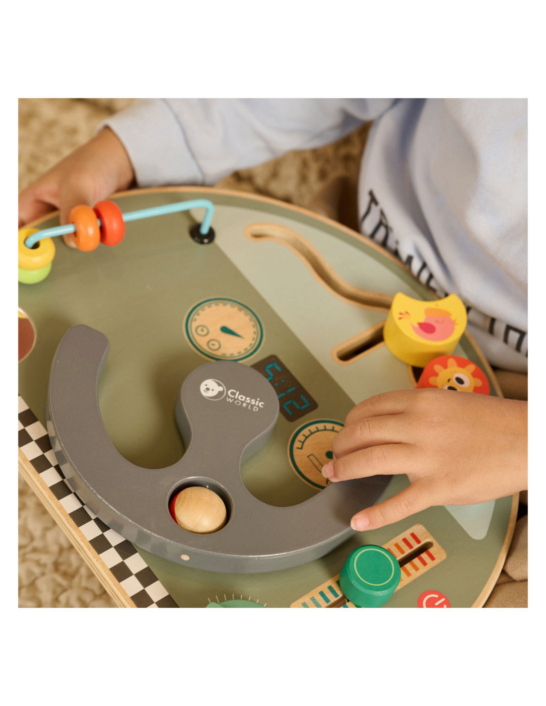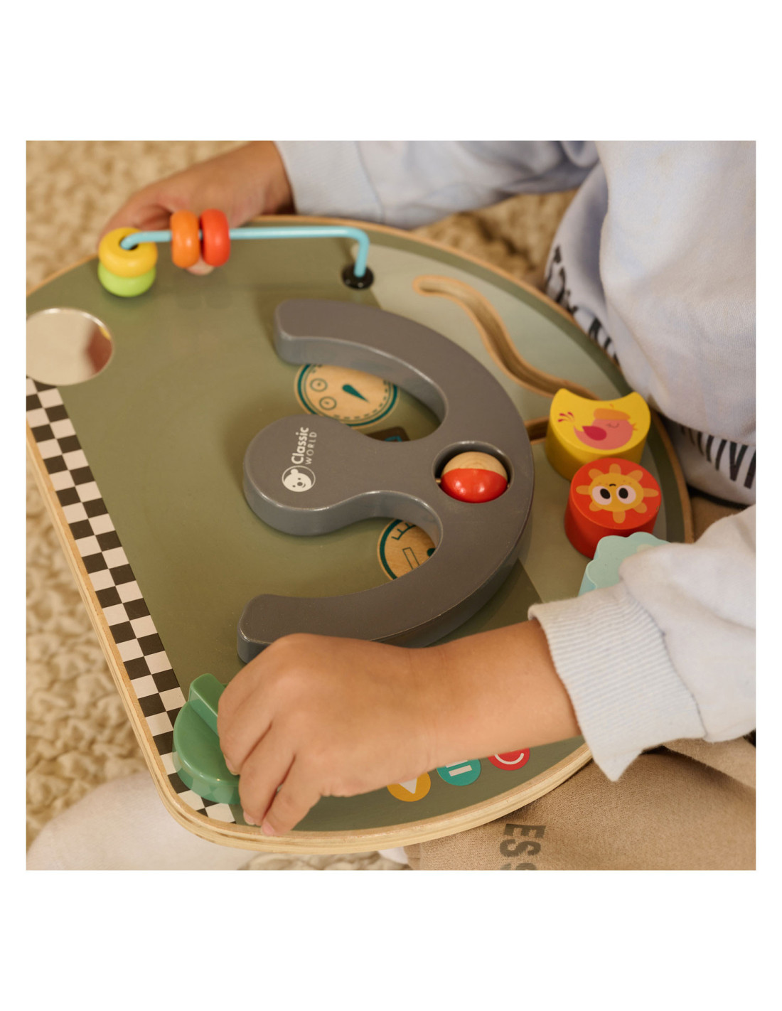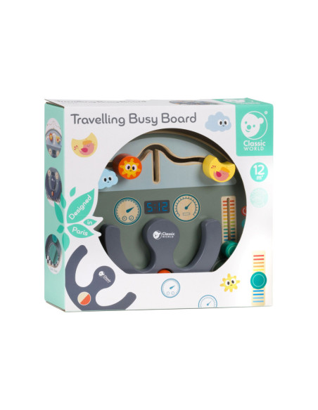 Houten activiteitenbord met diverse activiteiten voor het oefenen van de handmotoriek. Vormgegeven als bootdashboard met o.a. een stuur, beweegbare weerelementen en schuif- en draaiknoppen. Geschikt voor kinderen vanaf 12 maanden oud. Afmetingen: 29 x 23,5 x 5,6 cm.