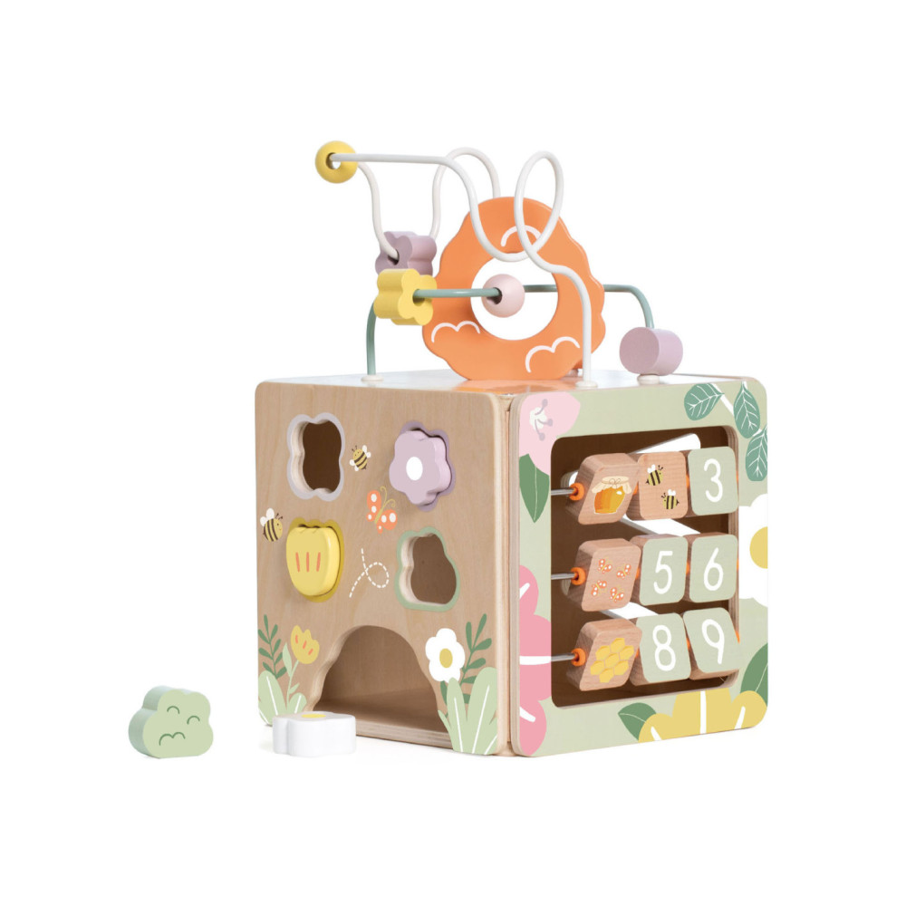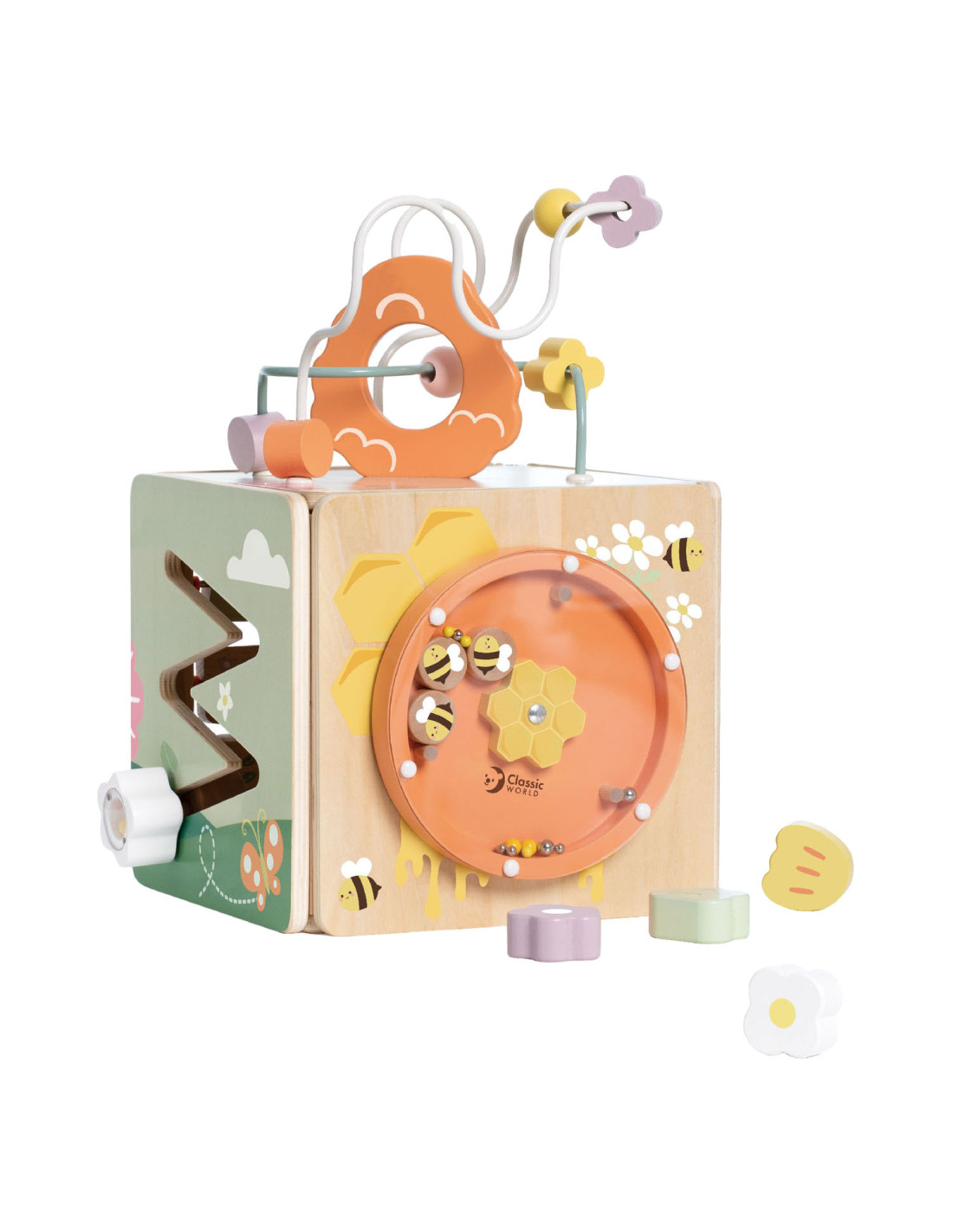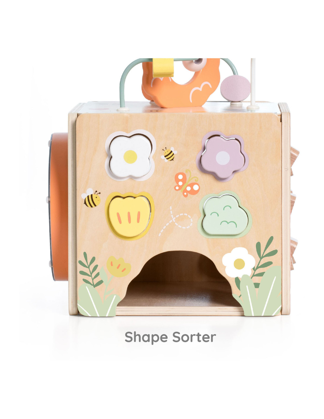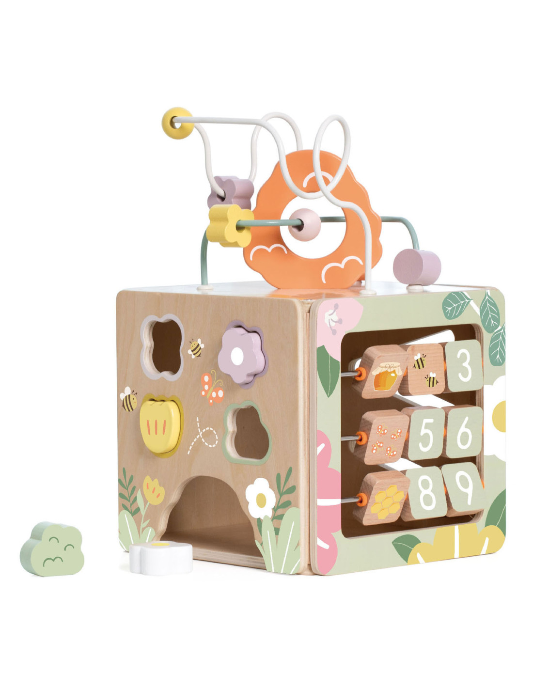 Het is een multifunctionele activiteitenkubus met een honingbijthema, inclusief een kralendoolhof, spinner, flip-nummerkaart, glijrails en vormensorteerder. Kinderen zullen genieten van het verkennen van de wereld van de tuin. Het zal helpen hun multisensorische vaardigheden te ontwikkelen.