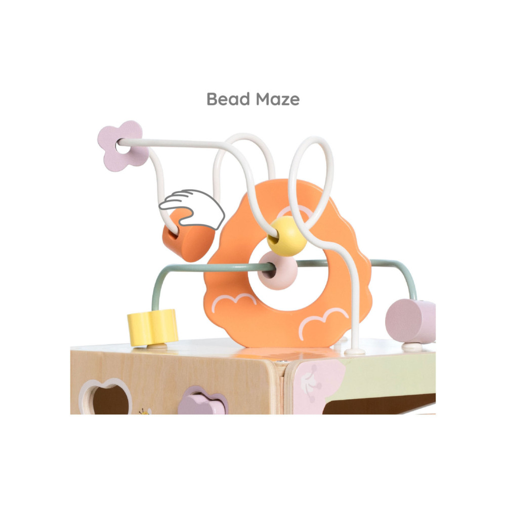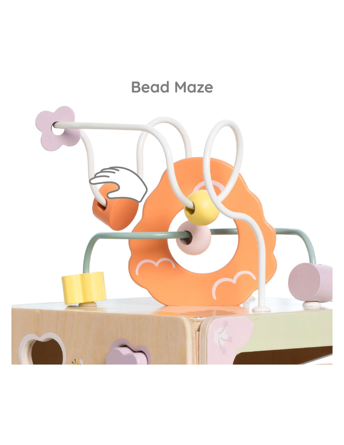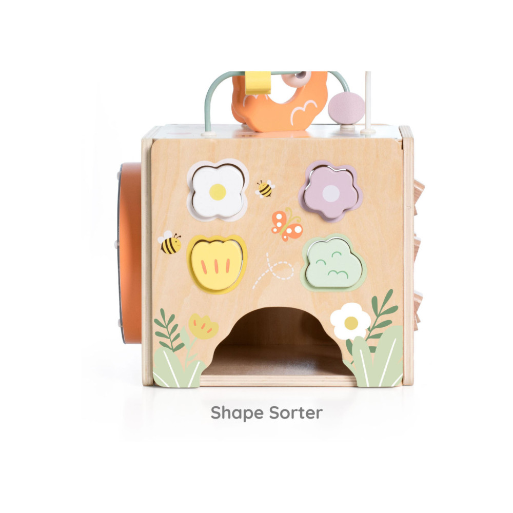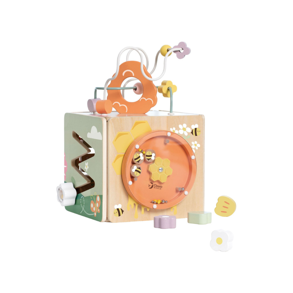 Het is een multifunctionele activiteitenkubus met een honingbijthema, inclusief een kralendoolhof, spinner, flip-nummerkaart, glijrails en vormensorteerder. Kinderen zullen genieten van het verkennen van de wereld van de tuin. Het zal helpen hun multisensorische vaardigheden te ontwikkelen.