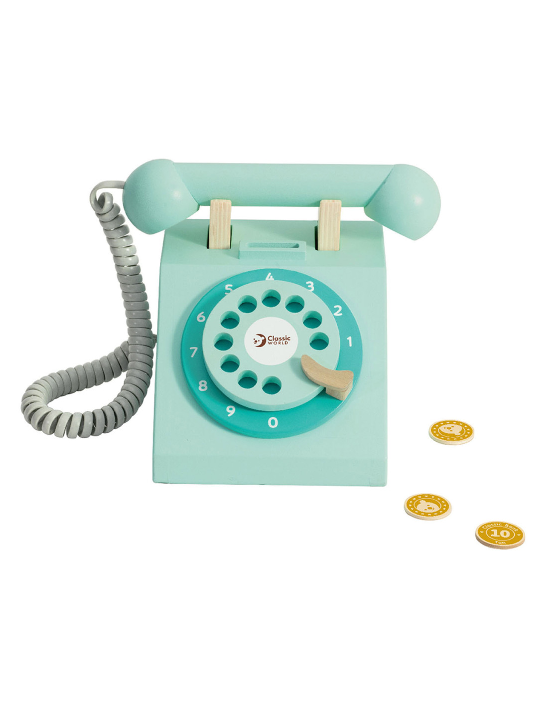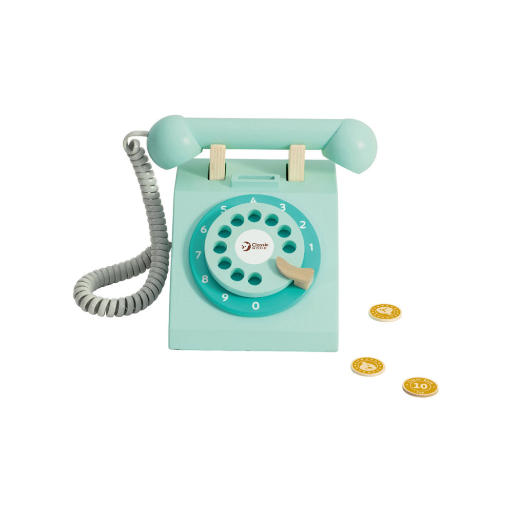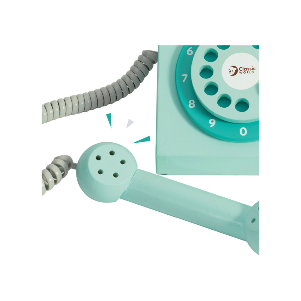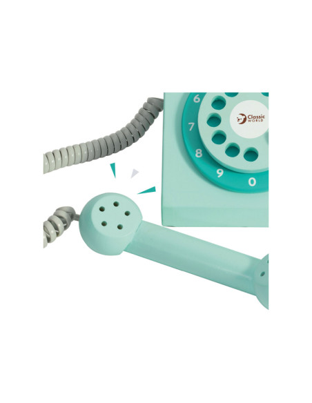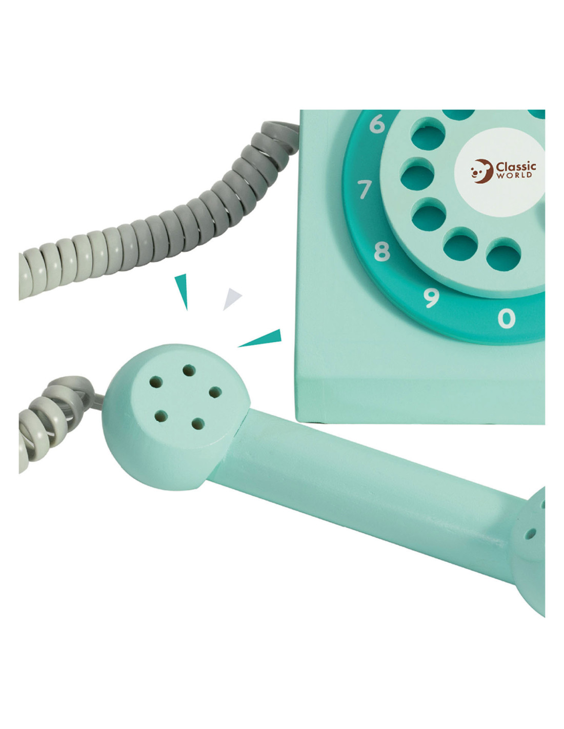 Houten speelgoedtelefoon met uniek retro design! Deze turquoise speelgoedtelefoon van Classic World heeft een echte draaischijf en hoorn. Gemaakt van duurzaam hout en bewerkt met kindveilige verf. Geschikt voor kinderen vanaf 3 jaar.