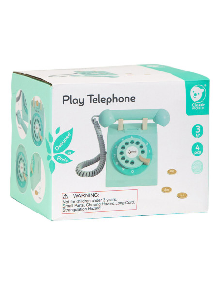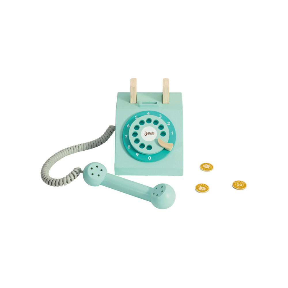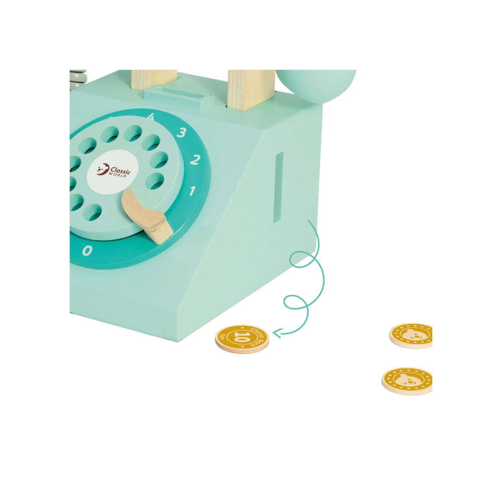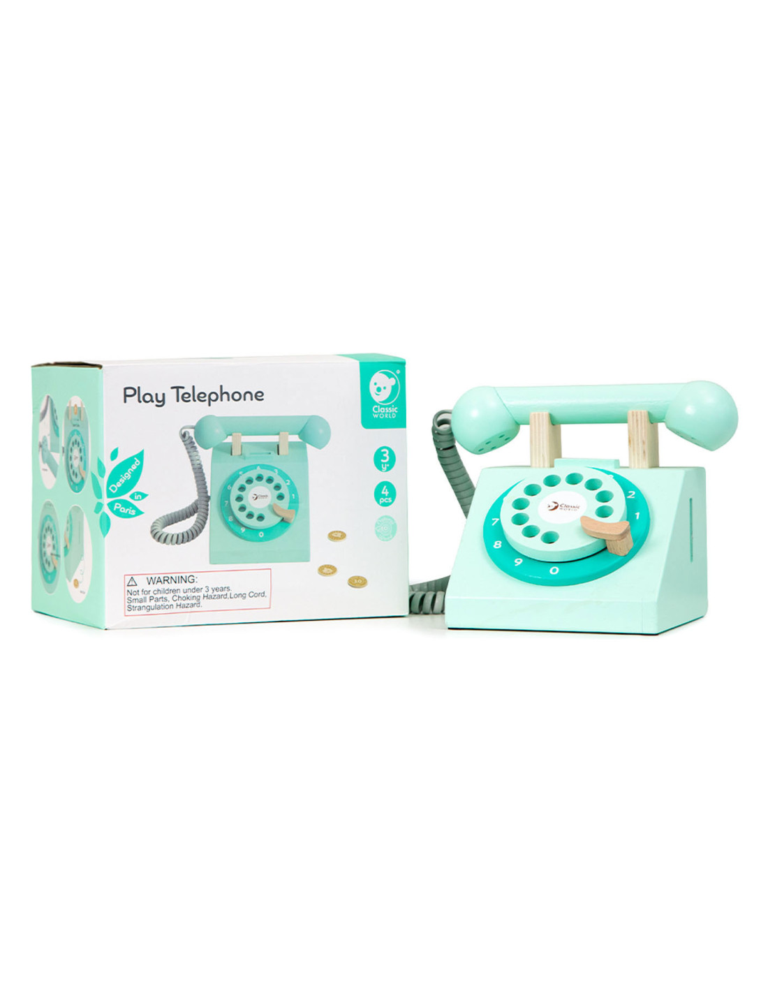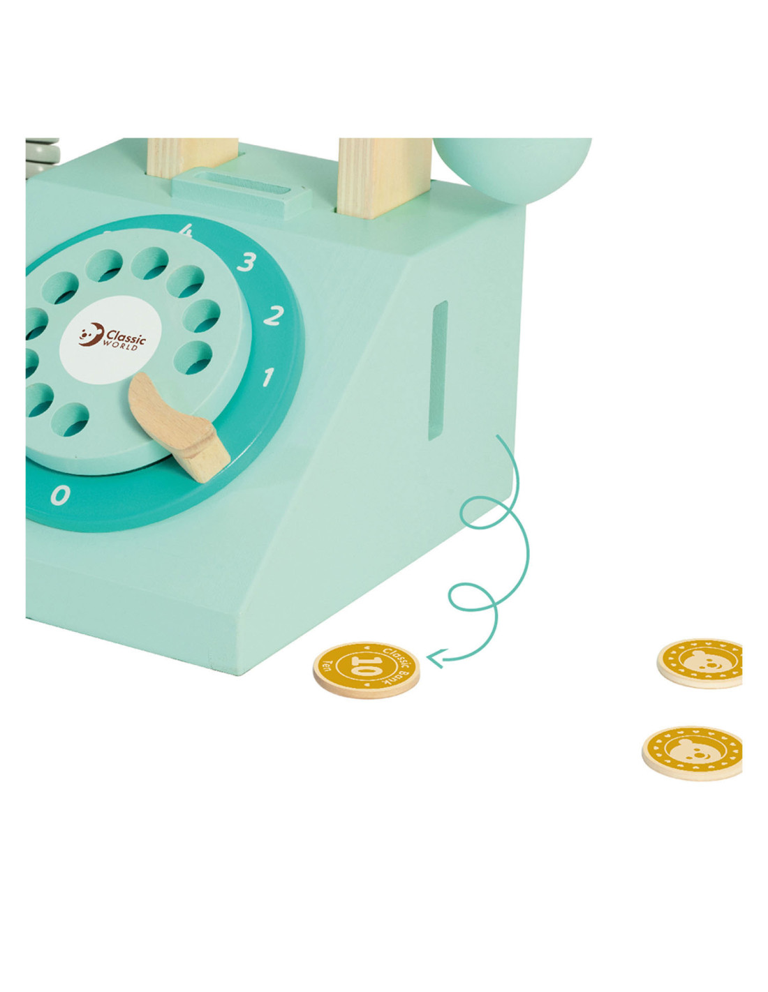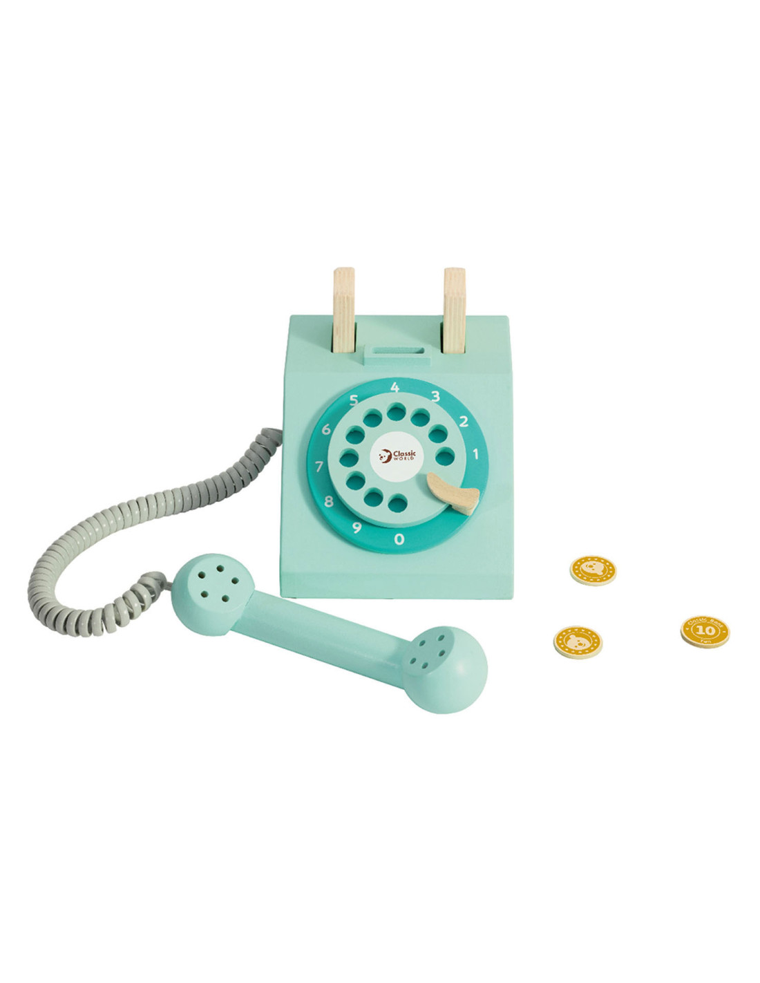 Houten speelgoedtelefoon met uniek retro design! Deze turquoise speelgoedtelefoon van Classic World heeft een echte draaischijf en hoorn. Gemaakt van duurzaam hout en bewerkt met kindveilige verf. Geschikt voor kinderen vanaf 3 jaar.