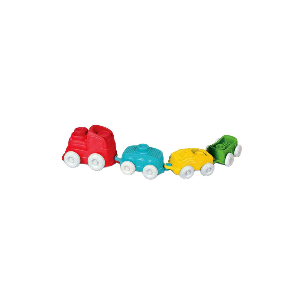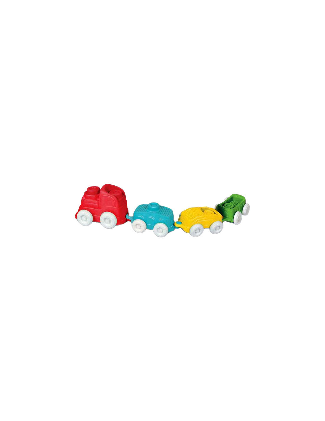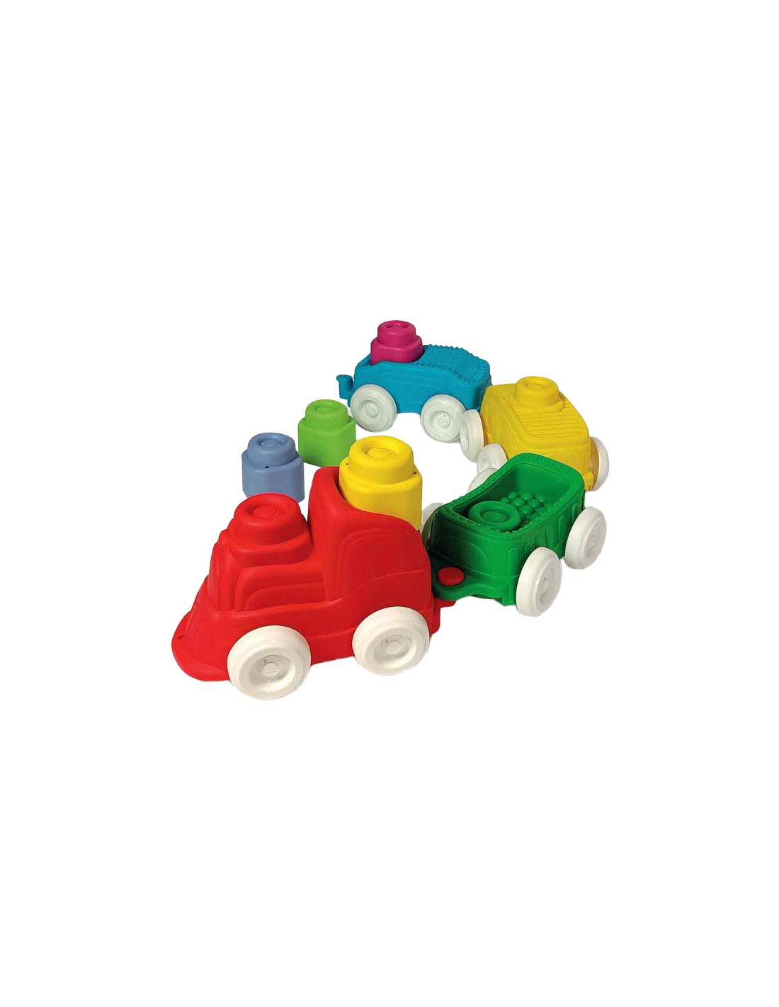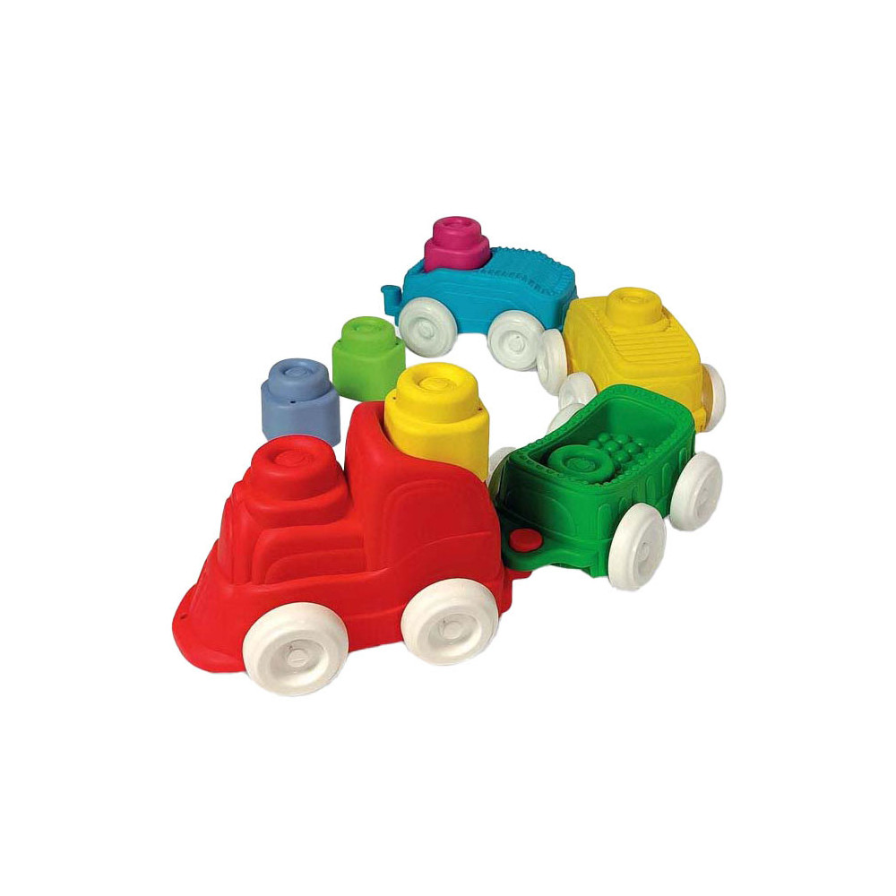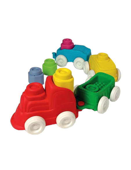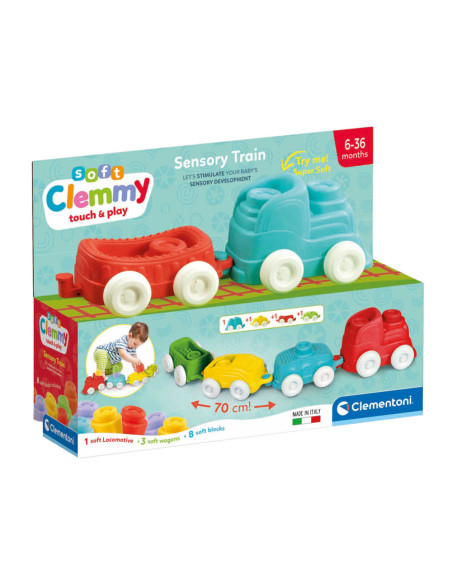 Een zachte trein met locomotief en wagons, waarmee je kan spelen en die je met je handjes kan ontdekken. Het kind ontdekt de reliëfs, de vormen, ervaart de zachtheid van het Clemmy-materiaal en geniet van een zintuiglijke ervaring die hem helpt zijn tastzin en handvaardigheid te ontwikkelen. De vele zachte, gekleurde blokken die op de wagons en de locomotief passen, of op elkaar, om zachte, gekleurde torens te maken die je telkens weer kunt laten vallen en opbouwen. De wagons kunnen worden losgekoppeld en aan elkaar worden verbonden. Dankzij de wielen kan de speelgoedtrein bewegen en hem samen met zijn wagons voortrekken, vele verhalen verzinnen en reizen met een grenzeloze fantasie. Vaatwasbestendig (max 70°).