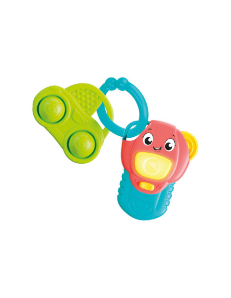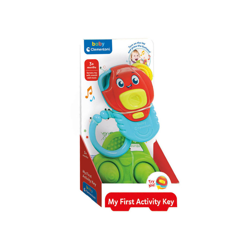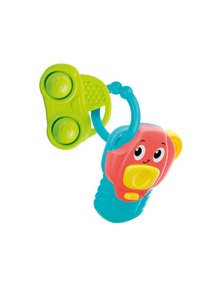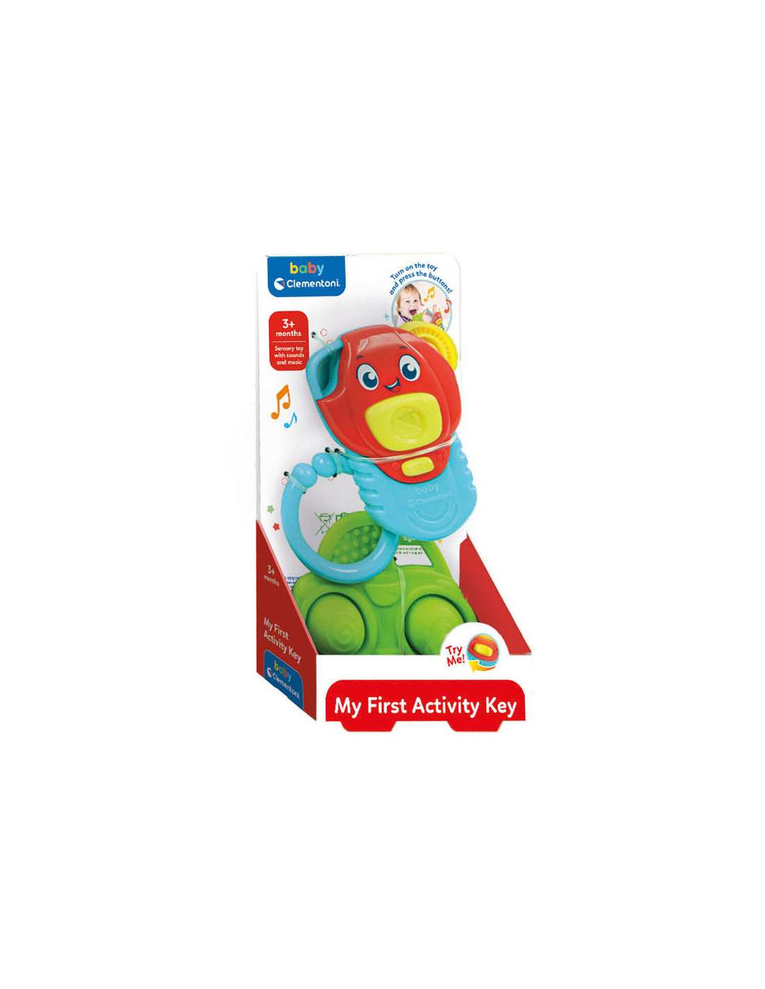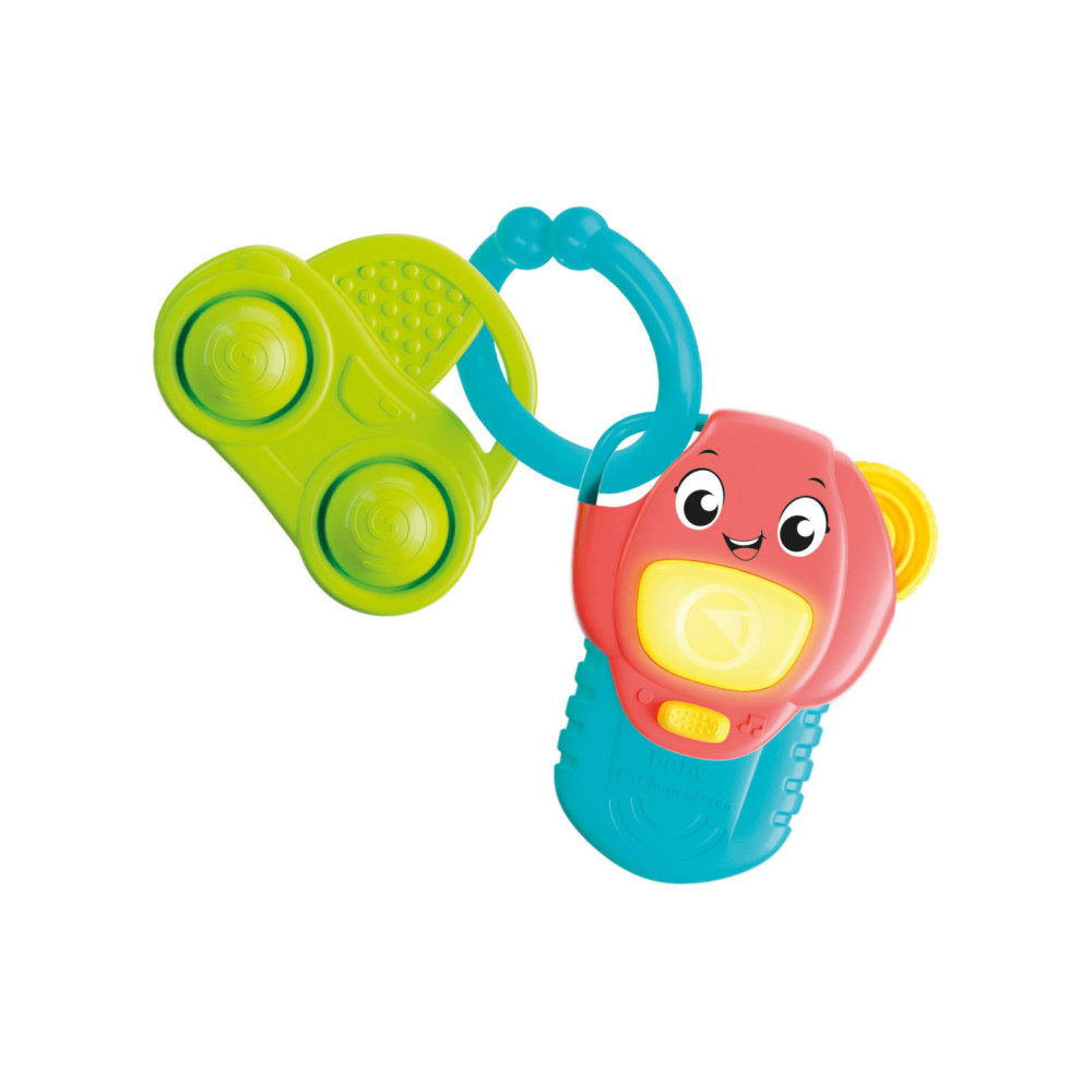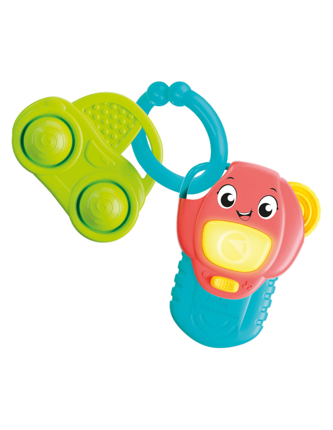 Een interactieve elektronische sleutel en zijn bijtbare sleutelhanger. De sleutel stimuleert de auditieve waarneming van het kind met muziek en geluiden, en betrekt het kind door imitatie. De van zacht materiaal gemaakte sleutelhanger ontwikkelt de fijne motoriek en de sensorische tastzin van het kind. Ontdek al het imitatiespeelgoed van de Baby Clementoni lijn. Interactief, elektronisch spel, ontworpen voor de ontwikkeling van het kind in de eerste levensjaren.
