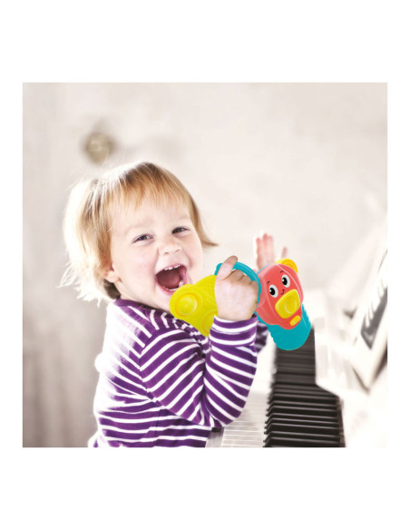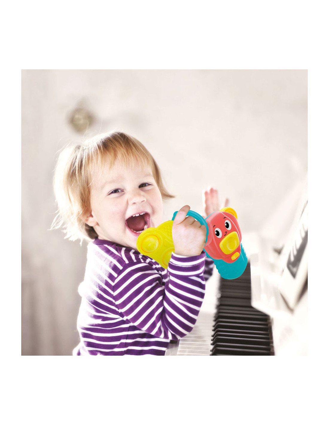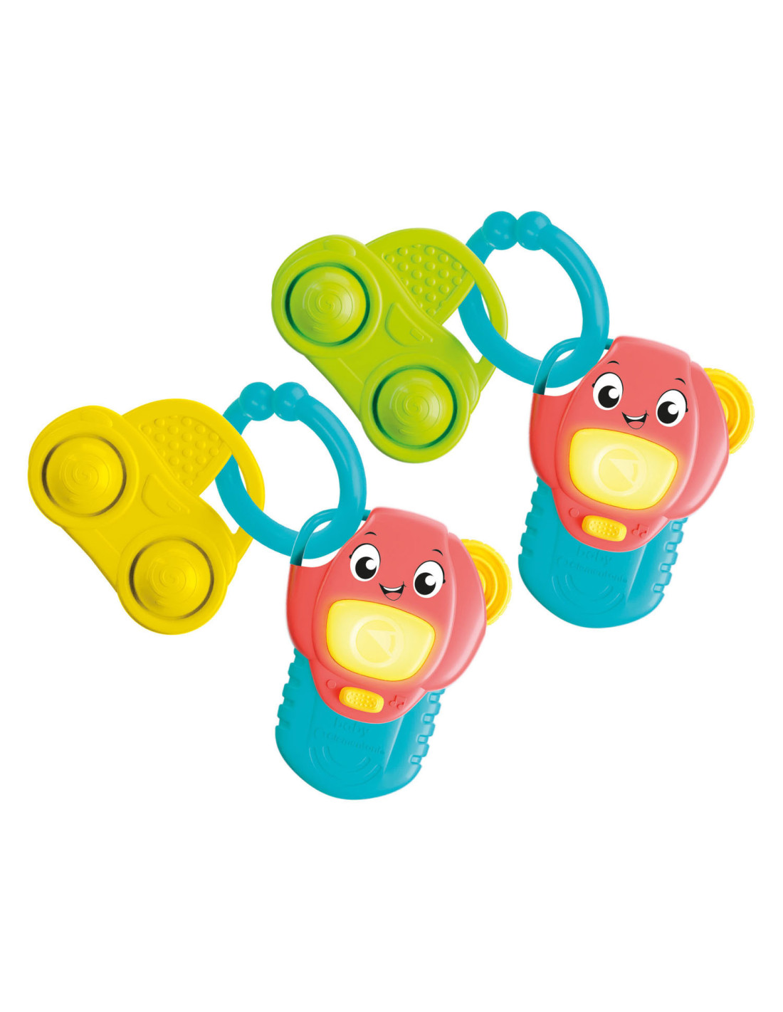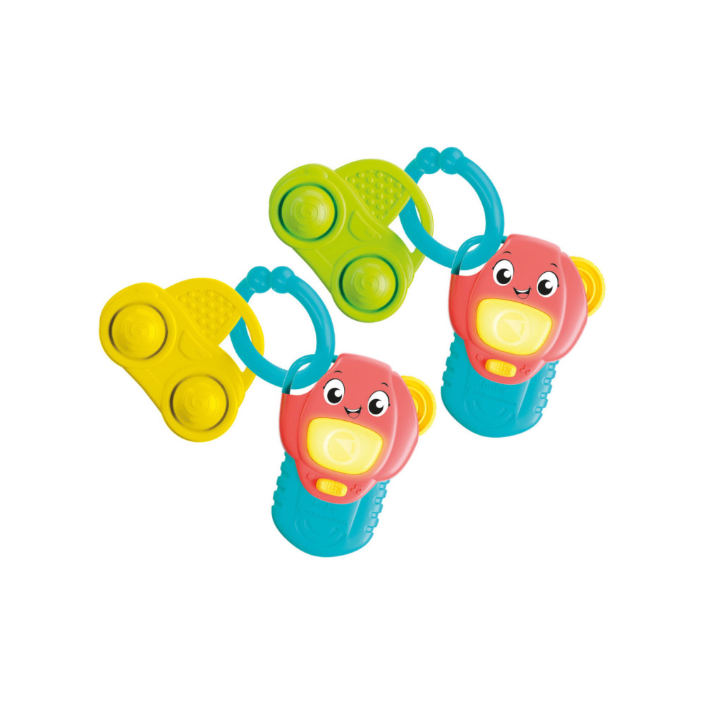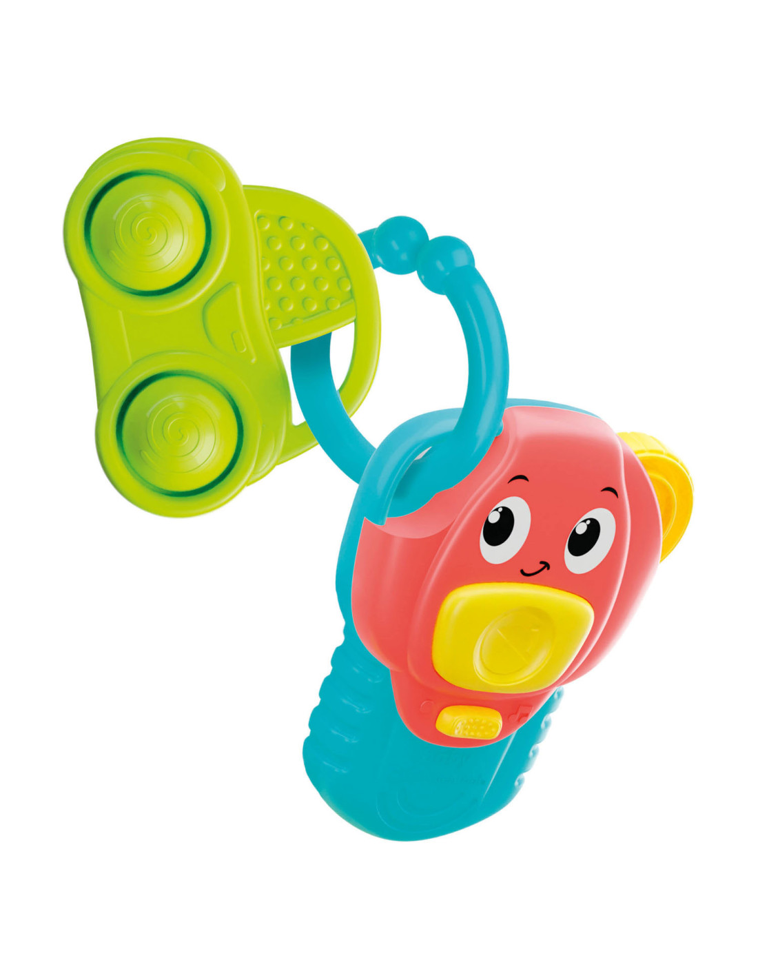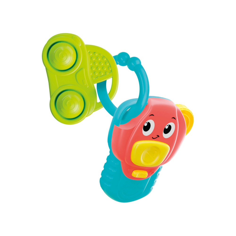 Een interactieve elektronische sleutel en zijn bijtbare sleutelhanger. De sleutel stimuleert de auditieve waarneming van het kind met muziek en geluiden, en betrekt het kind door imitatie. De van zacht materiaal gemaakte sleutelhanger ontwikkelt de fijne motoriek en de sensorische tastzin van het kind. Ontdek al het imitatiespeelgoed van de Baby Clementoni lijn. Interactief, elektronisch spel, ontworpen voor de ontwikkeling van het kind in de eerste levensjaren.