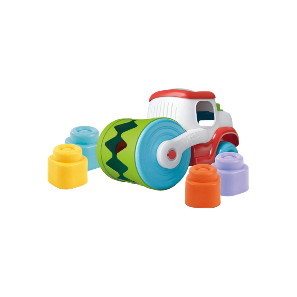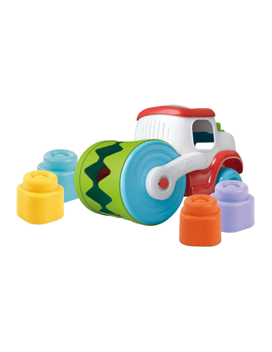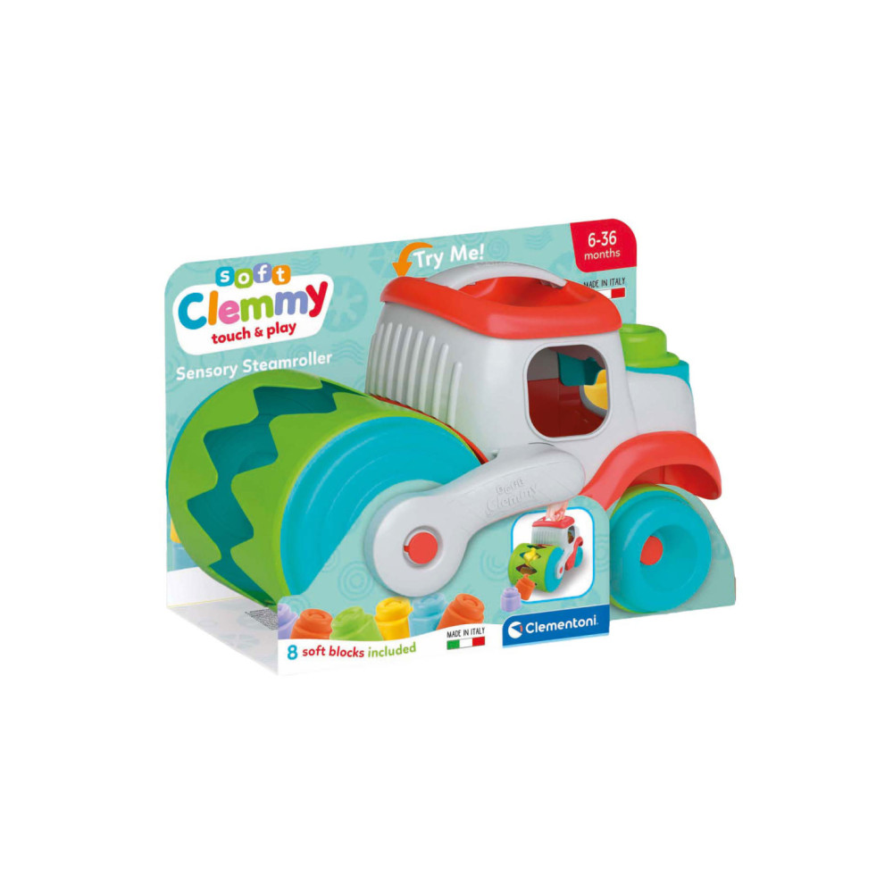 Blokken-etende wals! Het voertuig heeft veel texturen en inzetten van zacht materiaal zoals de Clemmy's, die helpen om de tactiele waarneming van het kind te stimuleren. Het kind vermaakt zich door de zachte wals blokken te laten eten, torens te bouwen, de blokken door het raam te duwen en ze weer terug te vinden door de achterklep te openen. Clemmy-blokken zijn zacht, veilig en wasbaar. Ze bevorderen de zintuiglijke, motorische en cognitieve ontwikkeling van het kind. De hele lijn Clemmy touch & play is 100% made in Italy.