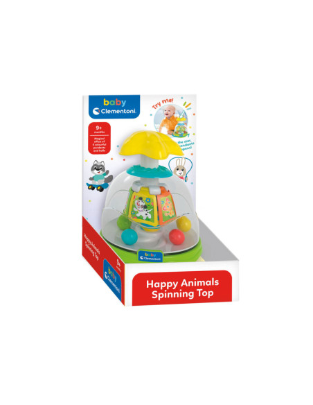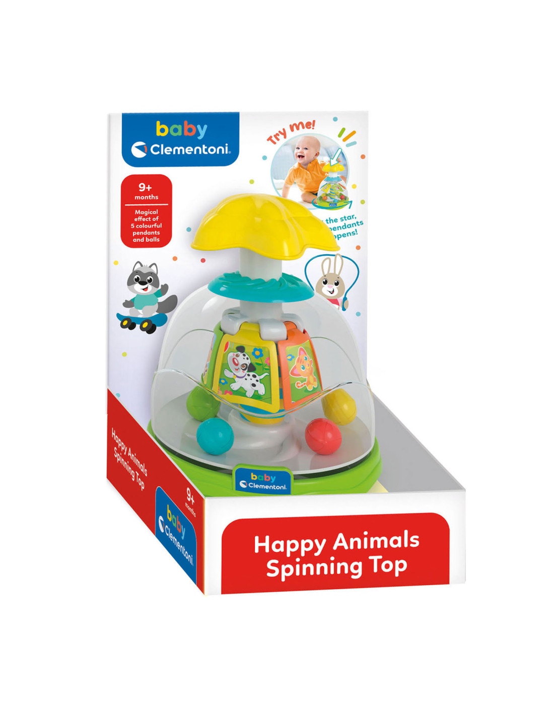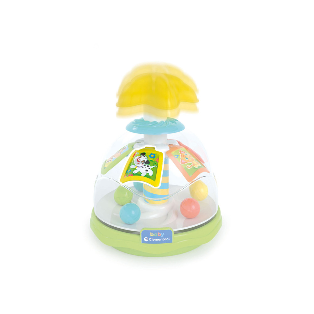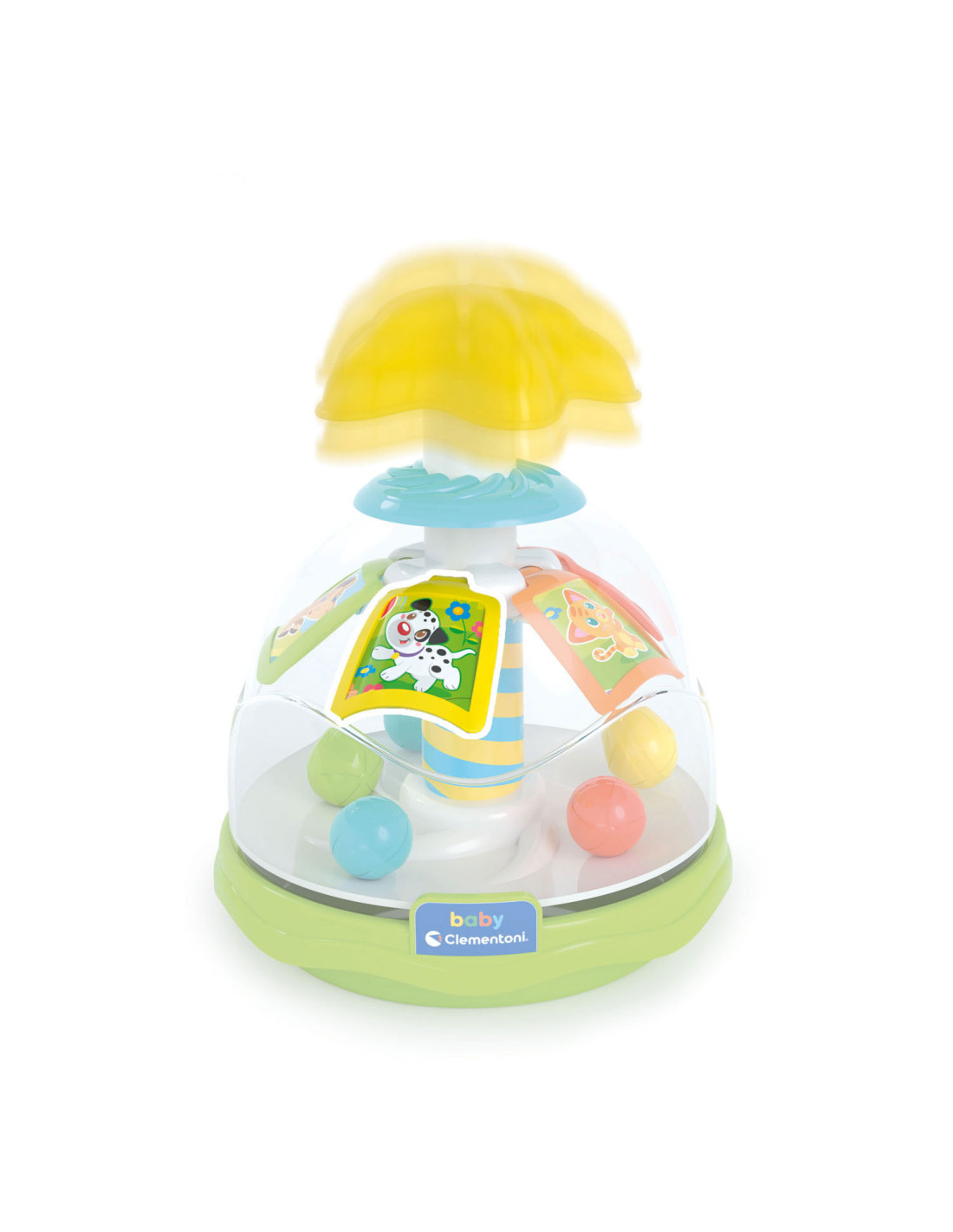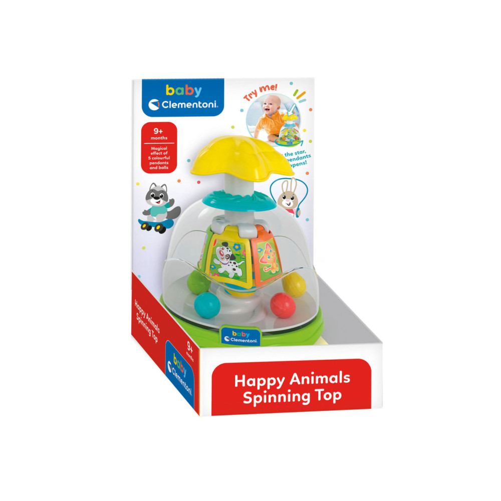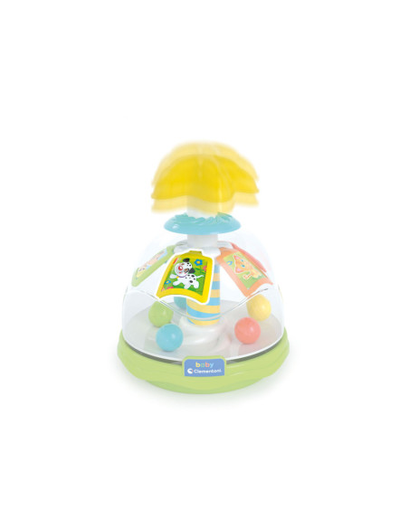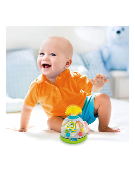 Een leuke tol met veel stuiterende gekleurde balletjes en een magisch hangereffect. Door op de ster te drukken open je de hangers aan de binnenkant, terwijl de balletjes draaien en stuiteren. Dankzij de tol ontwikkelt het kind de handvaardigheid en de motorische coördinatie. Aangeraden leeftijd: vanaf 9 maanden.
