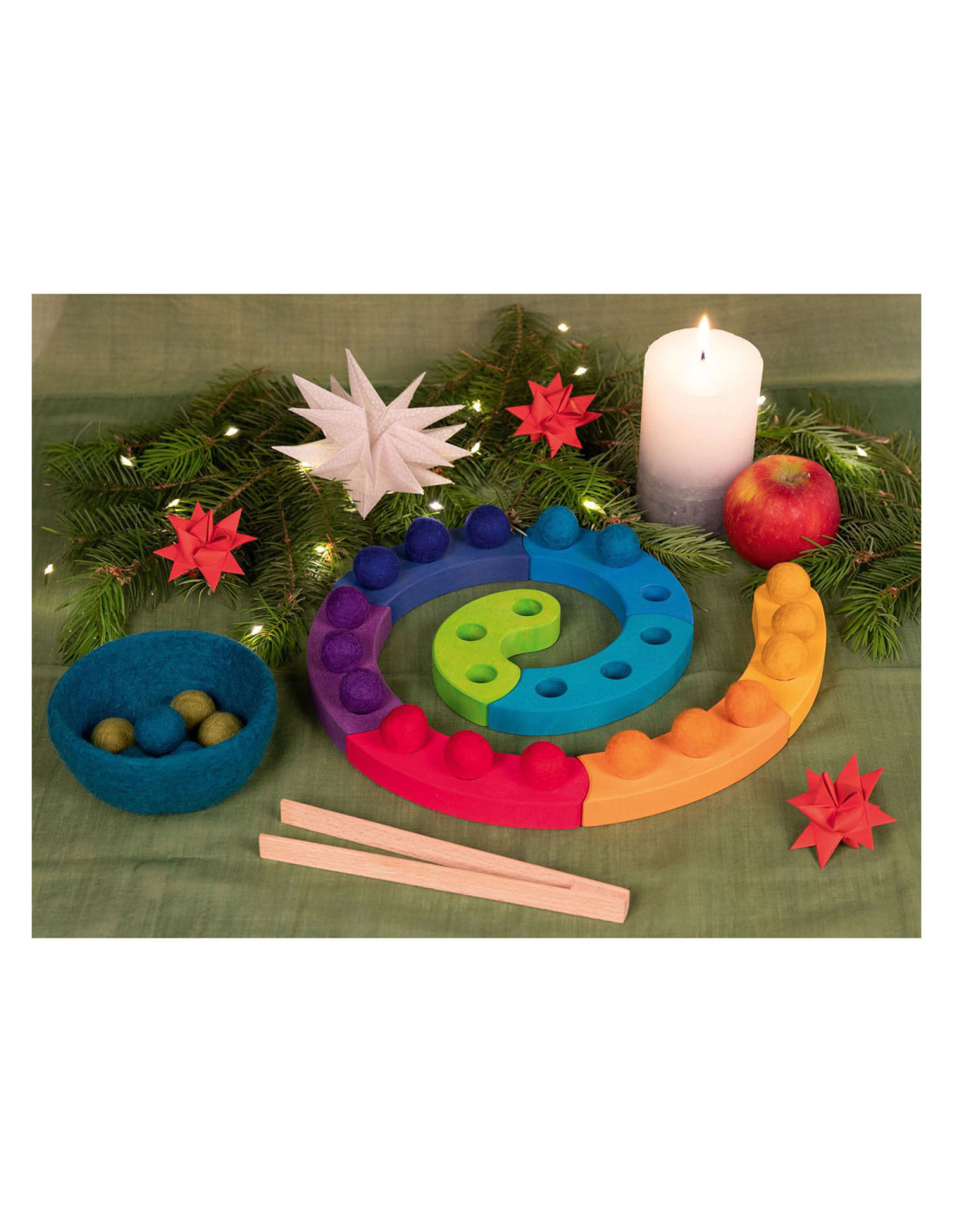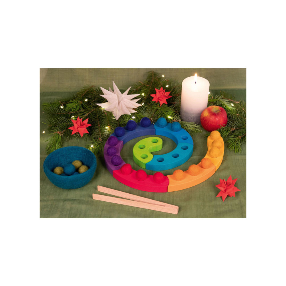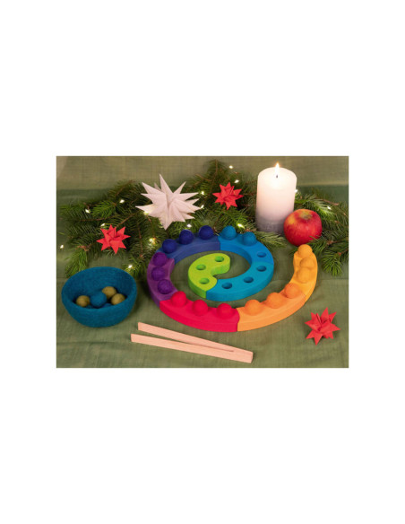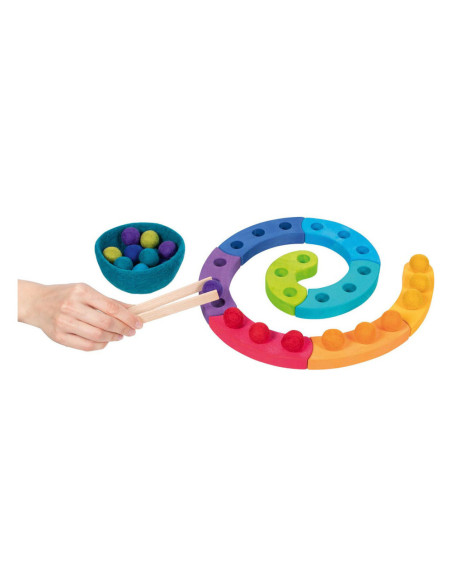 Hoe gaaf is dit multifunctioneel sorteerspel van Goki! Je zet de 8 gekleurde stukken gemakkelijk aan elkaar. Daarna kan je met de houten tang de wollen balletjes oppakken en op de juiste kleur leggen. Zowel de hand-oogcoördinatie als de concentratie wordt hierdoor bevorderd. Naast de spelfunctie kan je deze spiraal ook gebruiken als advent kalender om af te tellen richting kerst. Geschikt voor kinderen vanaf 3 jaar.