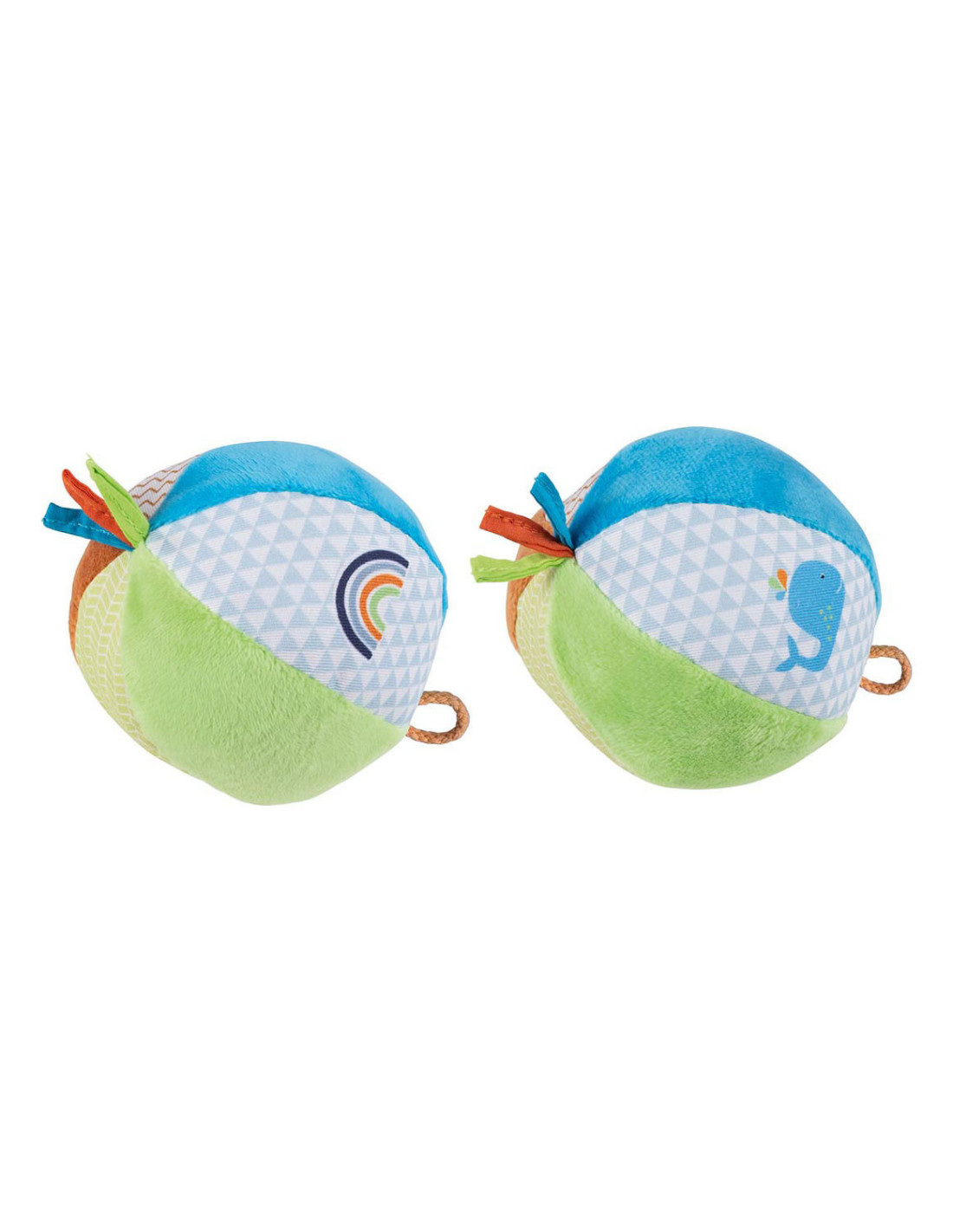 Zachte bal van stof met een belletje erin. Blauwe, groene en bruine stof met een regenboog en een walvis erop afgebeeld.