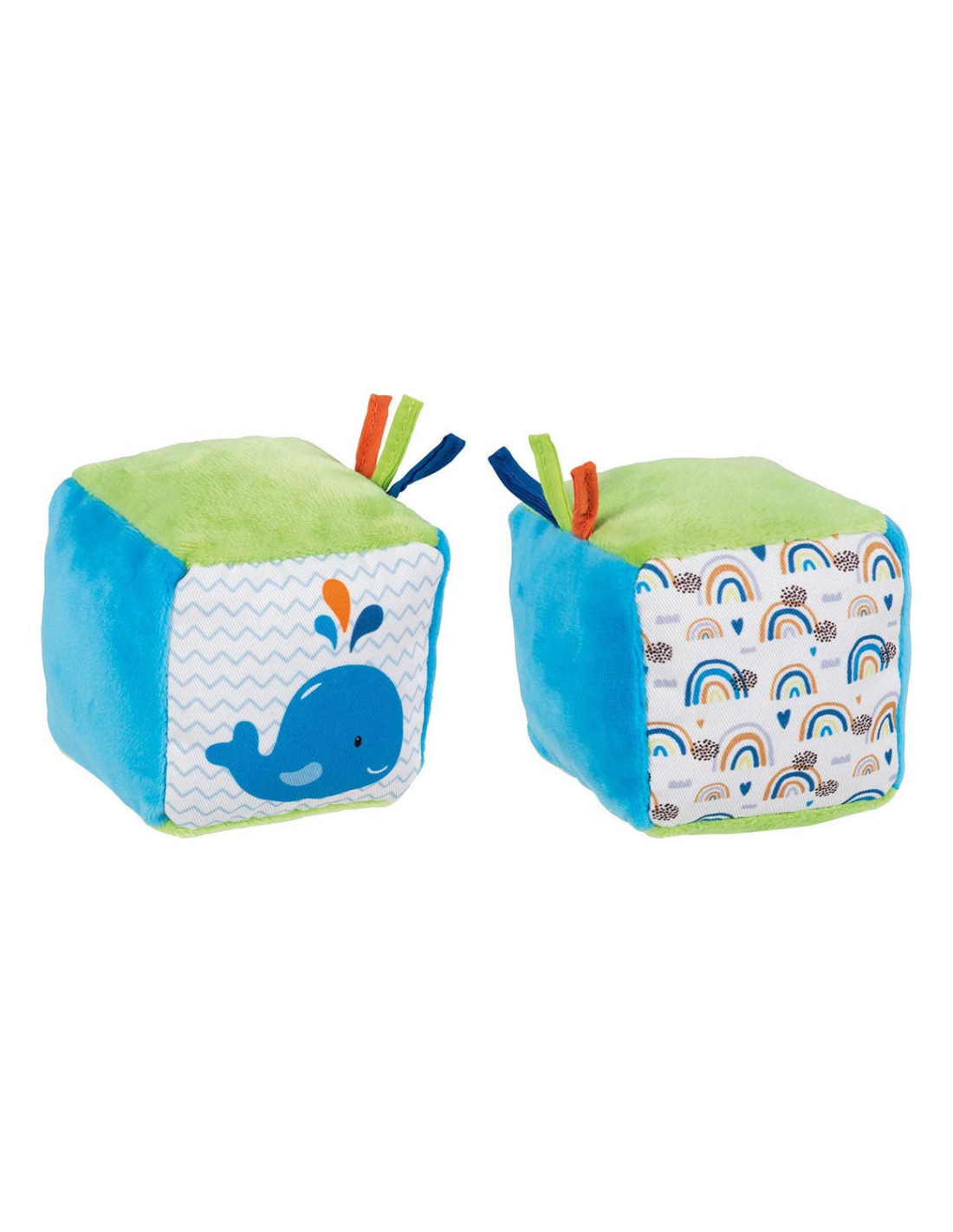 Zacht stoffen blok van blauwe en groene stof, met een belletje en kraakpapier. Aan de ene kant een walvis afgebeeld en aan de andere kant regenbogen. Leuk voor baby's.