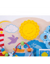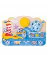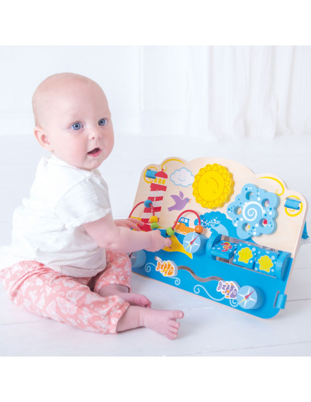 Speel, ontdek en leer met dit mooie houten zee activiteitenbord. Op dit vrolijke bord is van alles te ontdekken, te verschuiven en aan te raken. Draai aan de zon of aan de blauwe bloem.