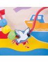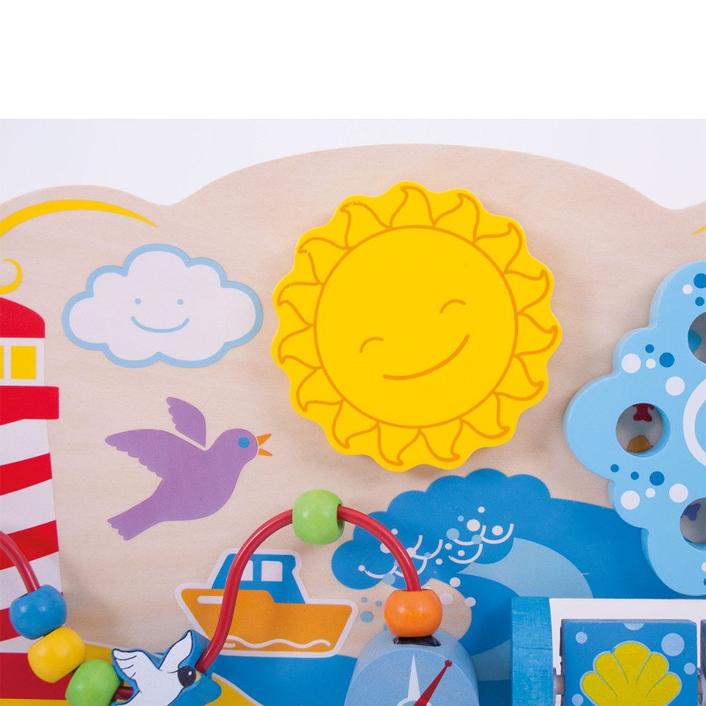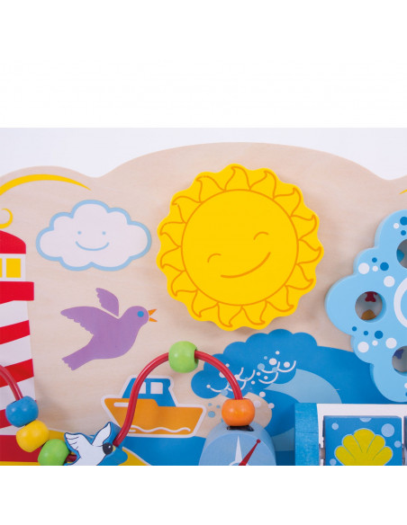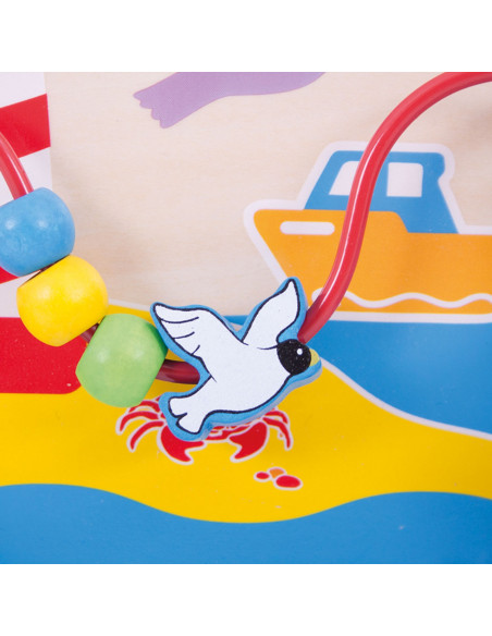 Laat de visjes heen en weer zwemmen en beweeg de kralen en zeemeeuwen over de draad. Er valt genoeg te ontdekken en te leren met dit mooie vrolijke bord!