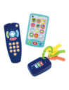 Driedelige speelset met speelgoedgadgets voor kinderen vanaf 12 maanden oud. De set bestaat uit een sleutelbos, een smartphone en een afstandsbediening, alle drie met geluid en melodietjes. De set heeft in totaal meer dan 31 geluidseffecten en stimuleert de fijne motoriek en hand-oogcoördinatie.