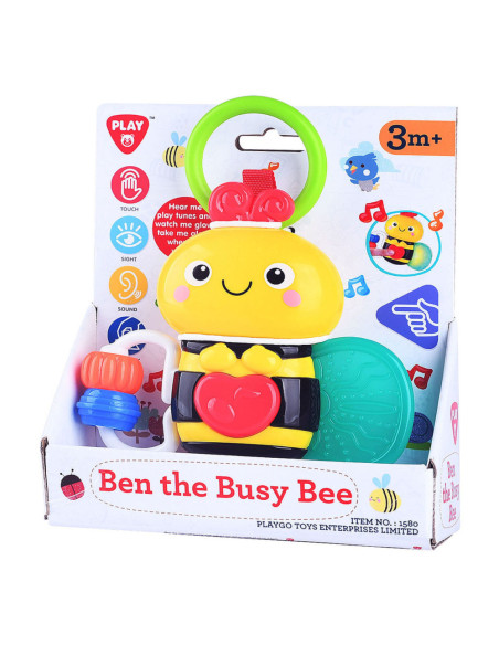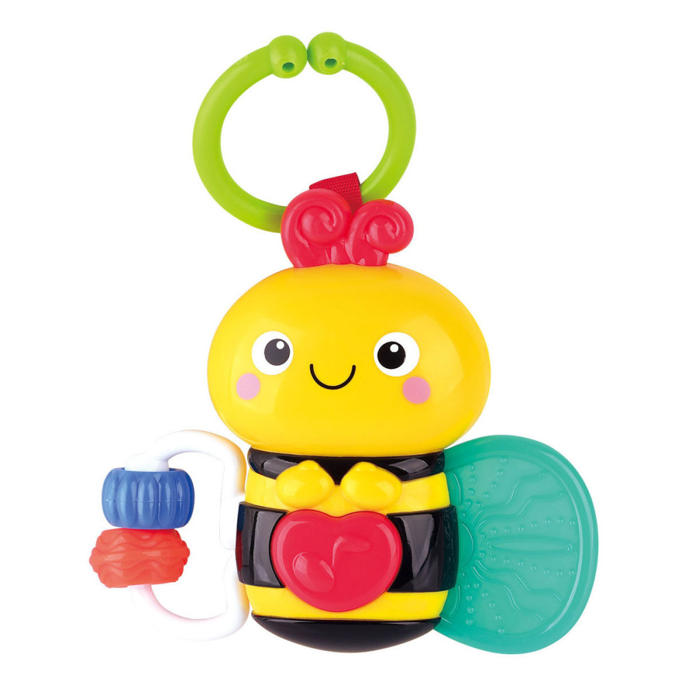 Babyspeeltje in de vorm van een bij met geluid, een bijtfunctie en sensorische rammelfunctie. De bij zit aan een grote, handige grijpring die ook aan een kinderwagen bevestigd kan worden. Geschikt vanaf 3 jaar.