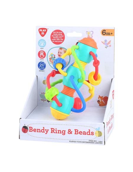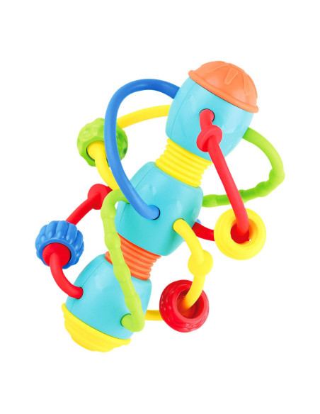 Wat een kleurrijke rammelaar met spiraalvormige bijtringen voor je kleintje. De bijtringen gemaakt van rubber verzachten de pijn van de doorkomende tandjes. De rammelaar zelf stimuleert de hand- oogcoördinatie. Geschikt voor kinderen vanaf 6 maanden.