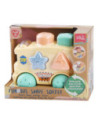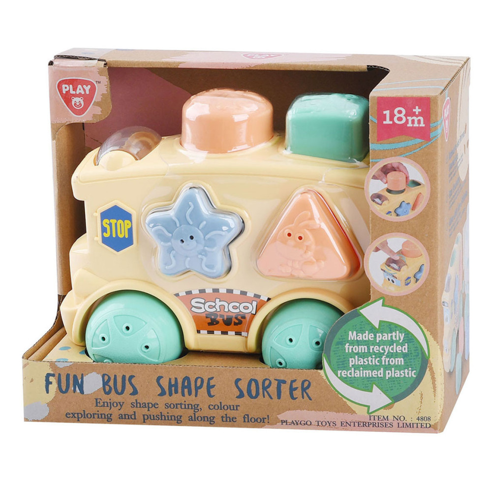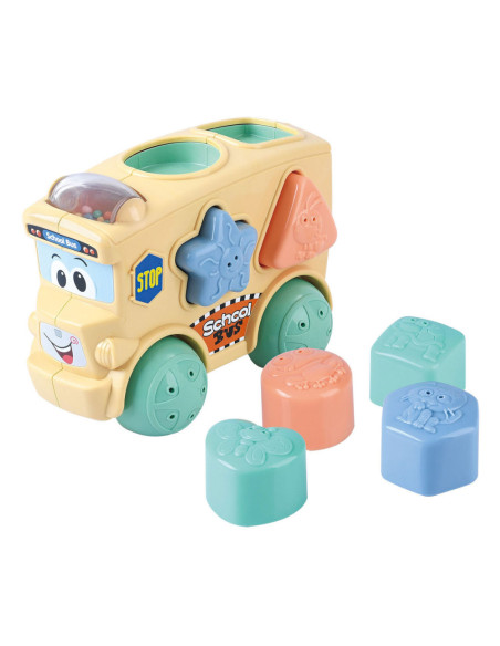 Vormenstoof in de vorm van een schoolbus, met rijdende wielen en een ratelende roller op het dak. Met 4 vormen/uitsparingen voor het trainen van de fijne motoriek. Geschikt voor kinderen vanaf 18 maanden oud.