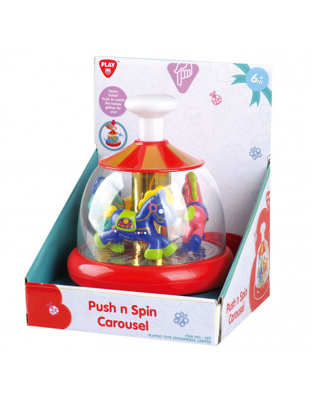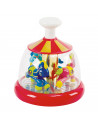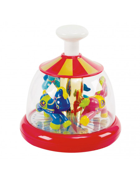 Een mooie kunststof draaimolen met felle kleuren. De draaimolen draait zodra jij op de knop drukt.