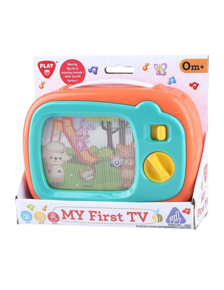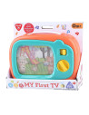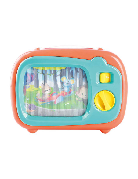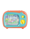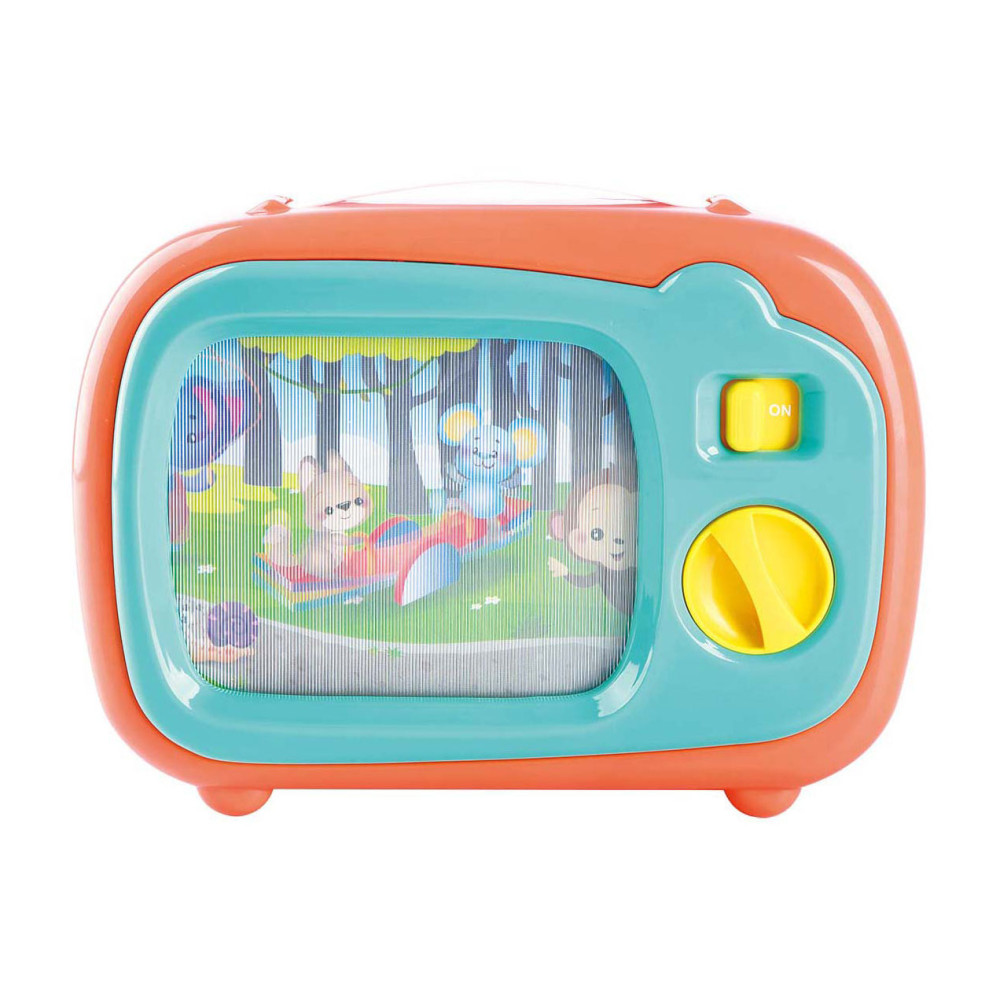 Door op de knoppen van deze kunststof tv te drukken verschijnt er steeds een nieuw plaatje.