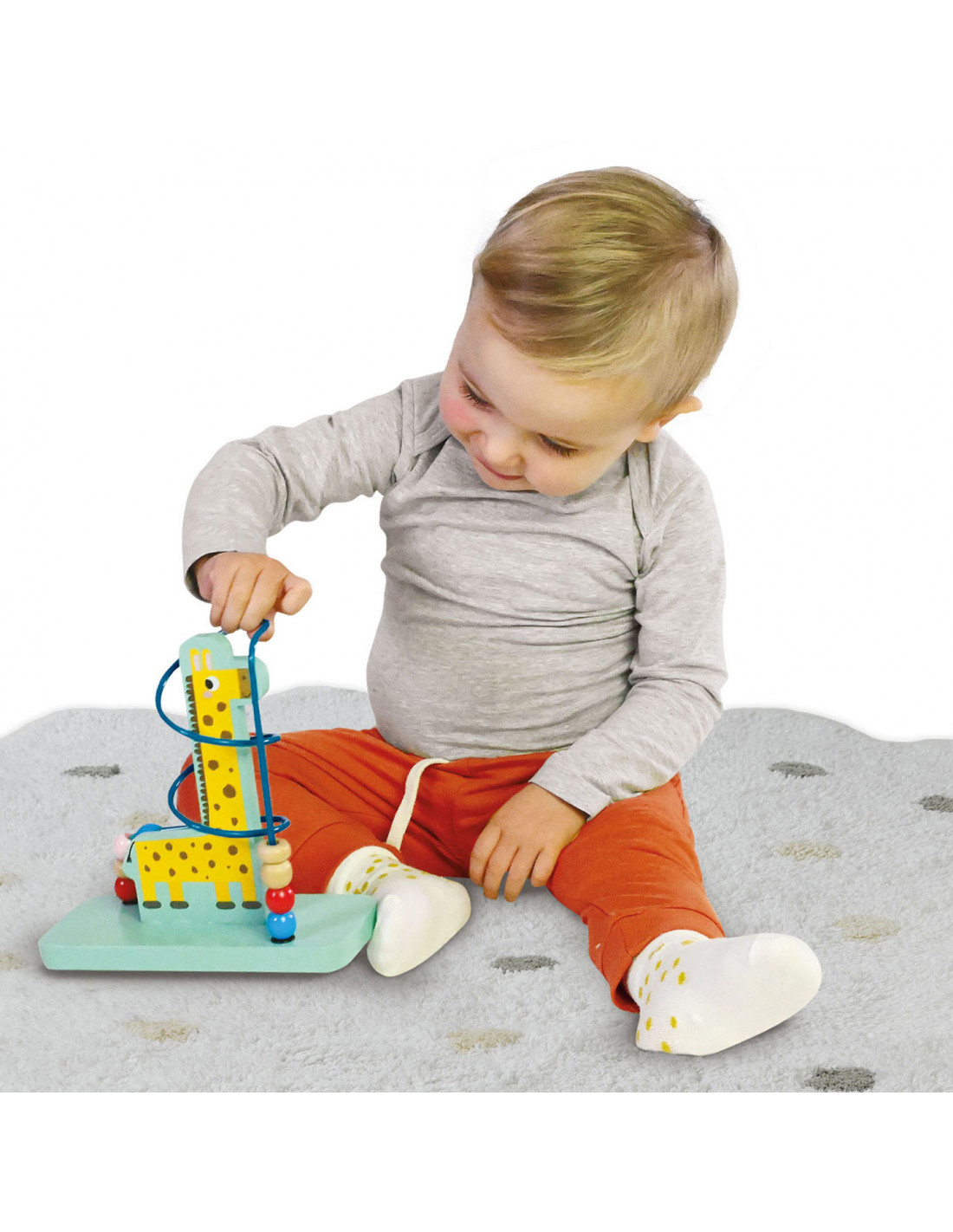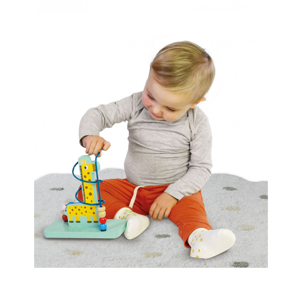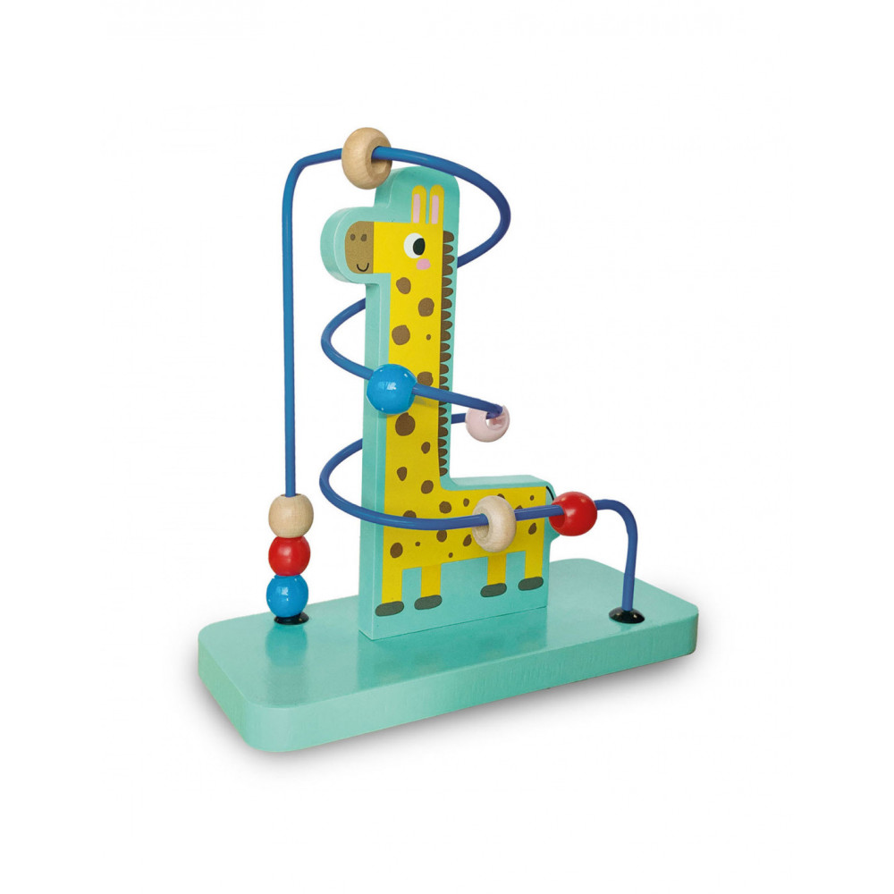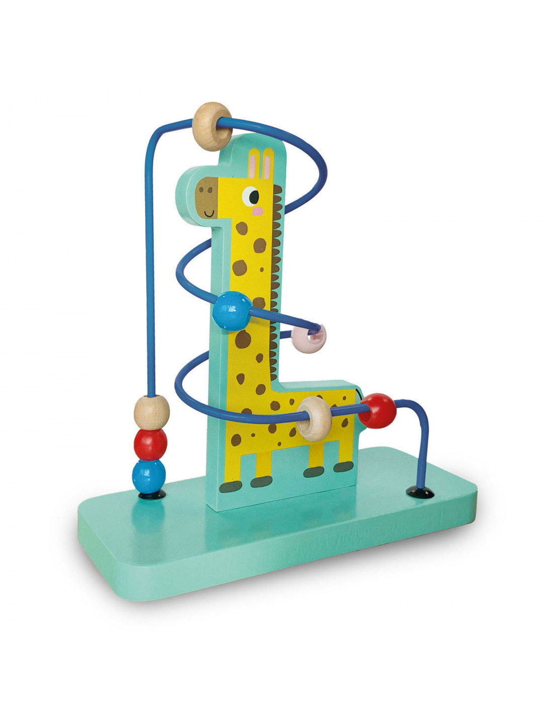 Een doolhof van kralen voor het oefenen van de fijne motoriek. De kralen in verschillende kleuren glijden langs het parcours waar in het midden een giraf als leuke dierenvriend de boel in de gaten houdt. Het product is veilig voor de allerkleinsten, mede doordat het geen kleine losse onderdelen bevat.