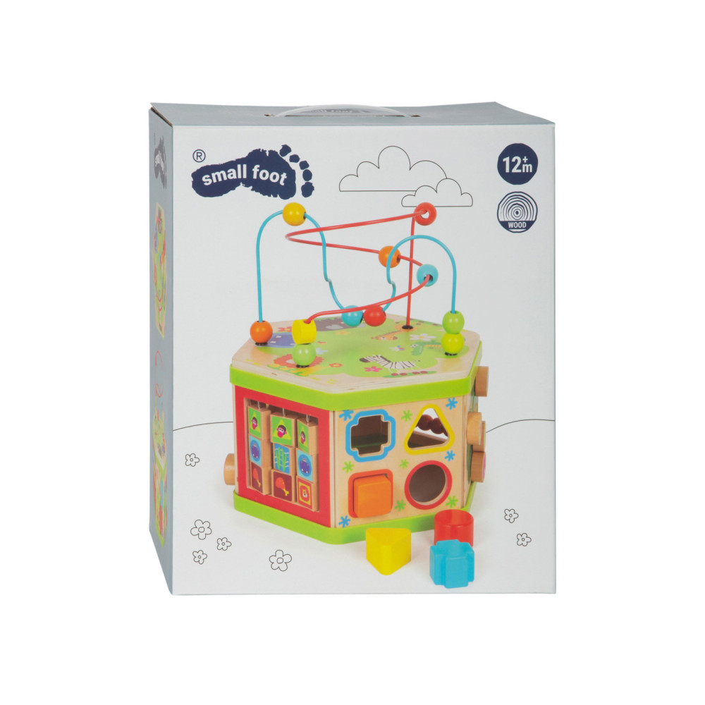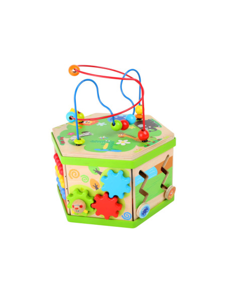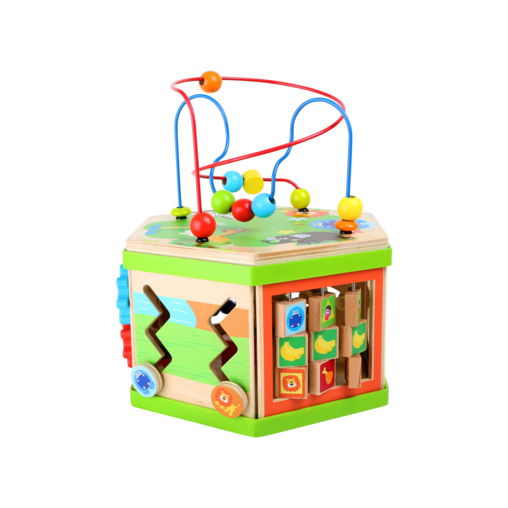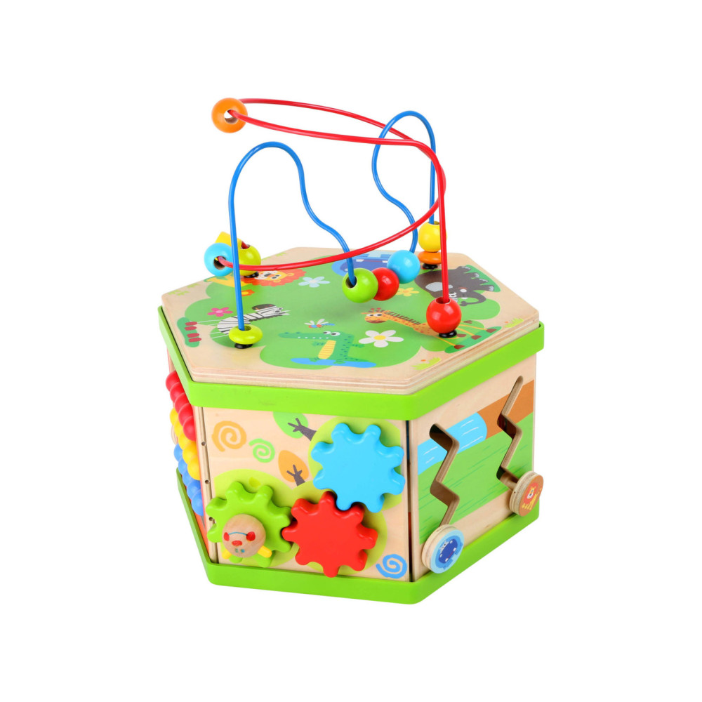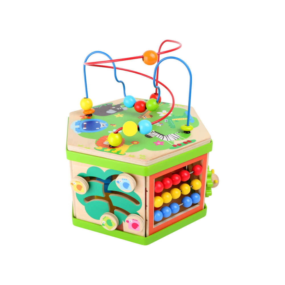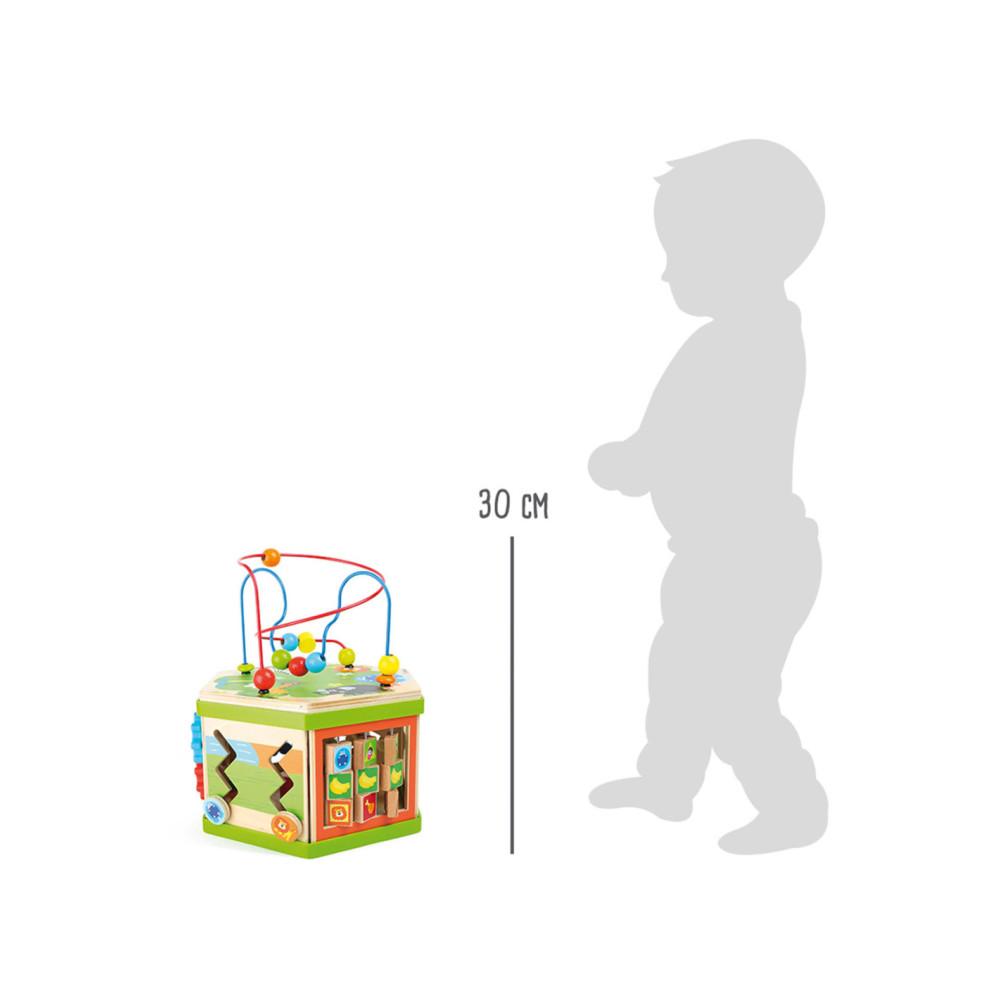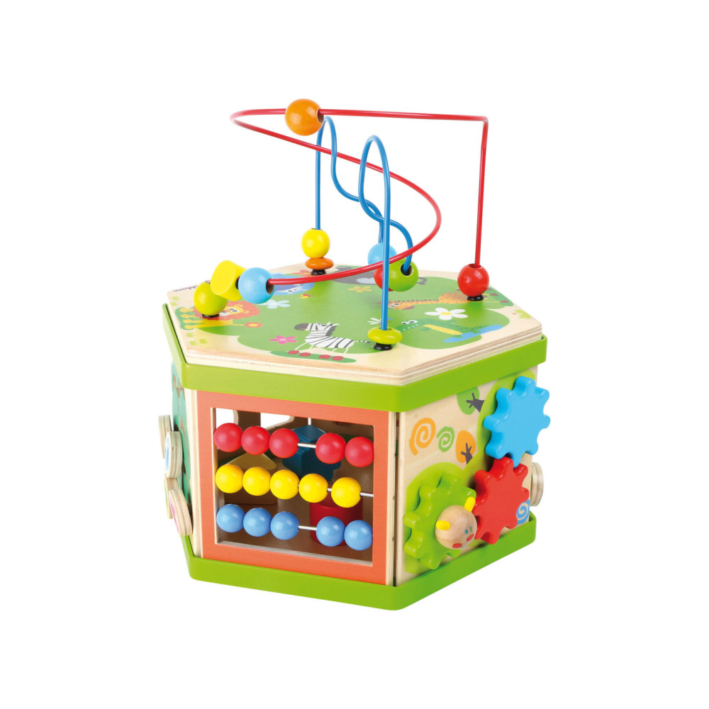Deze motorische kubus van hout biedt tal van speelmogelijkheden op zijn zeven speeloppervlakken. De schuifteller, het schuifspel en het kralendoolhof trainen allemaal de motoriek en helpen kinderen spelenderwijs hoeveelheden te leren begrijpen en herkennen. Hun nieuwsgierigheid en ontdekkingsdrang worden bevredigd en ook bevordert de kubus de oog-handcoördinatie en hun creativiteit.