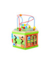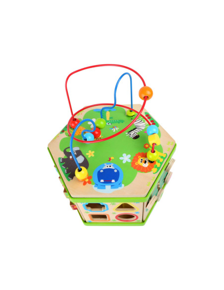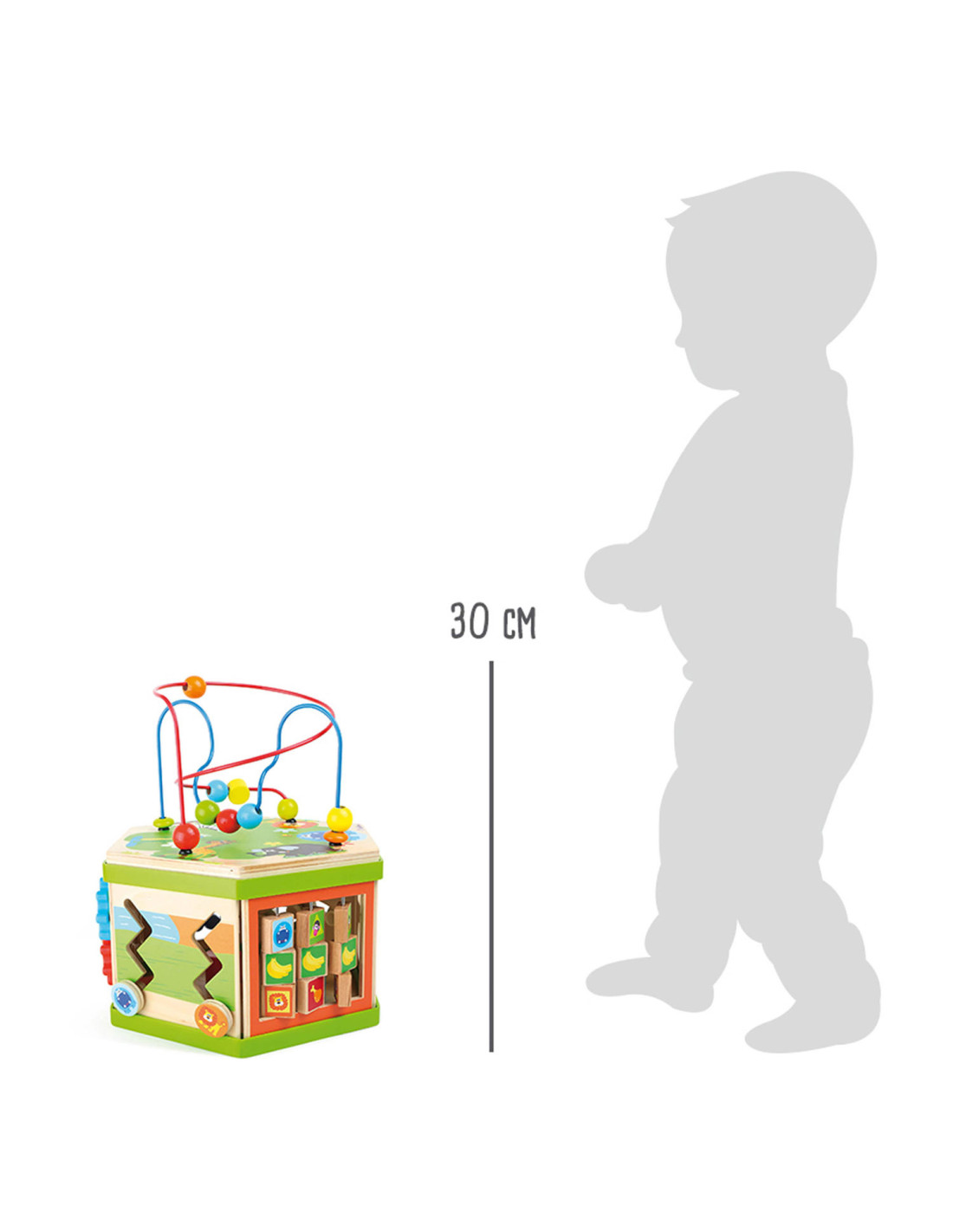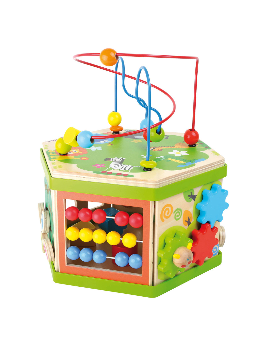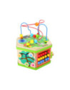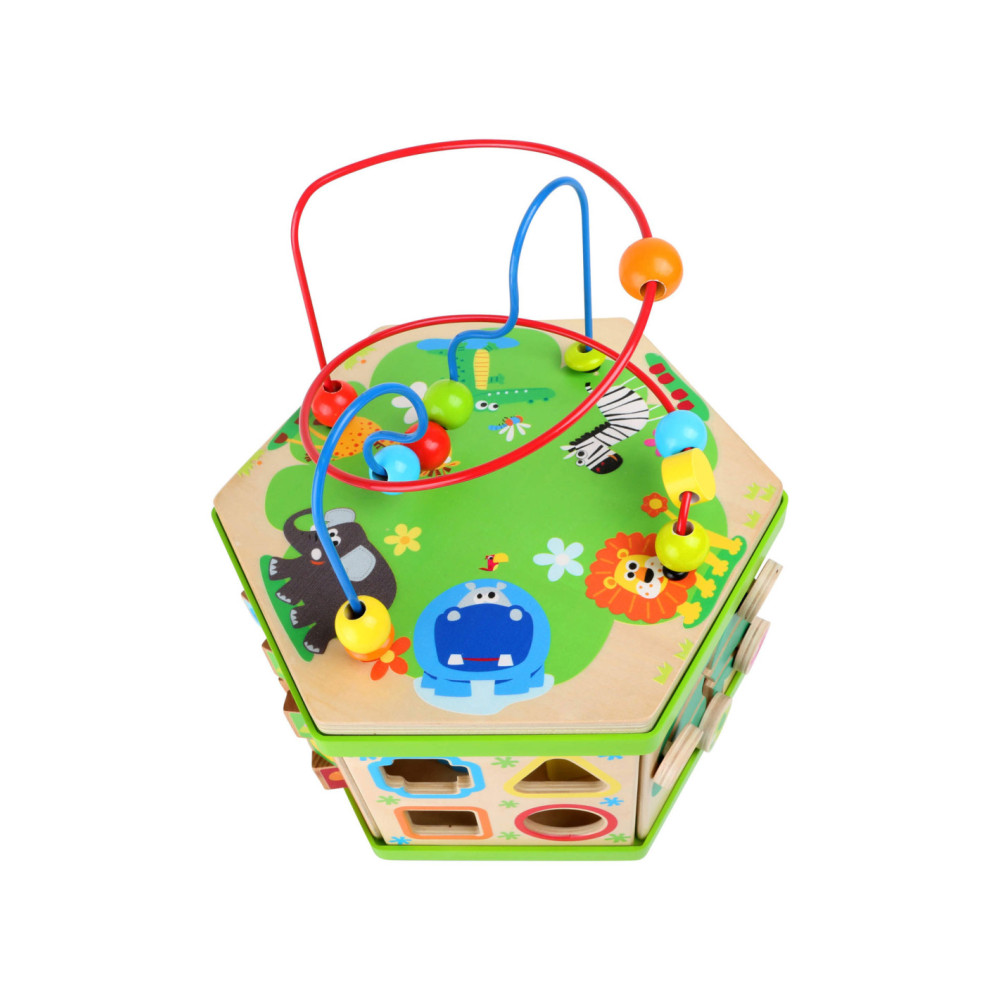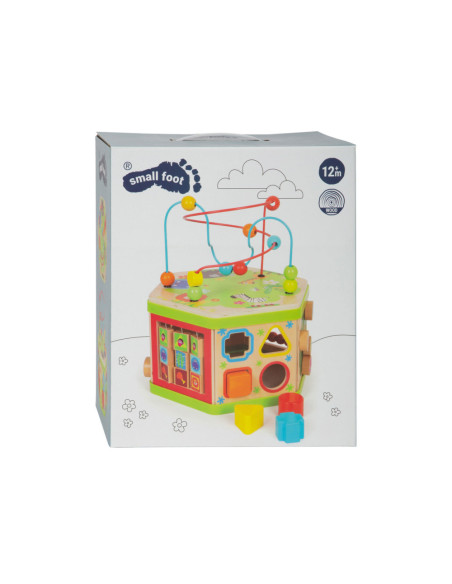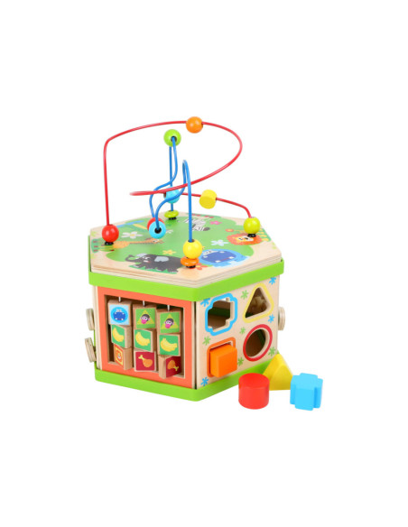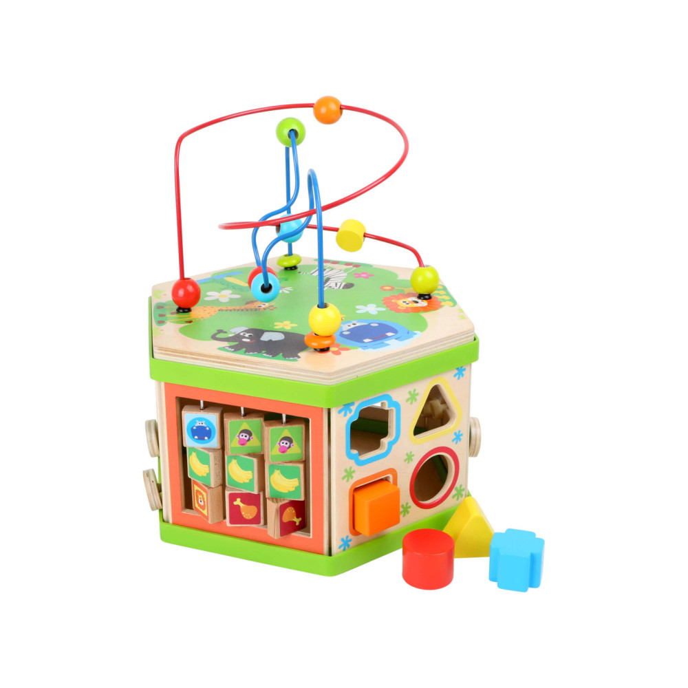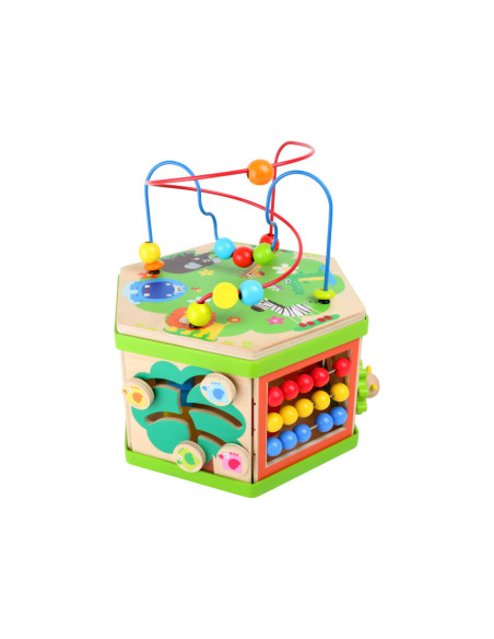 Deze motorische kubus van hout biedt tal van speelmogelijkheden op zijn zeven speeloppervlakken. De schuifteller, het schuifspel en het kralendoolhof trainen allemaal de motoriek en helpen kinderen spelenderwijs hoeveelheden te leren begrijpen en herkennen. Hun nieuwsgierigheid en ontdekkingsdrang worden bevredigd en ook bevordert de kubus de oog-handcoördinatie en hun creativiteit.