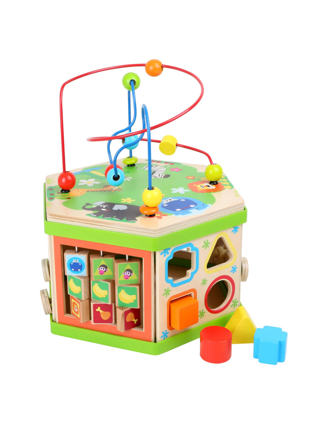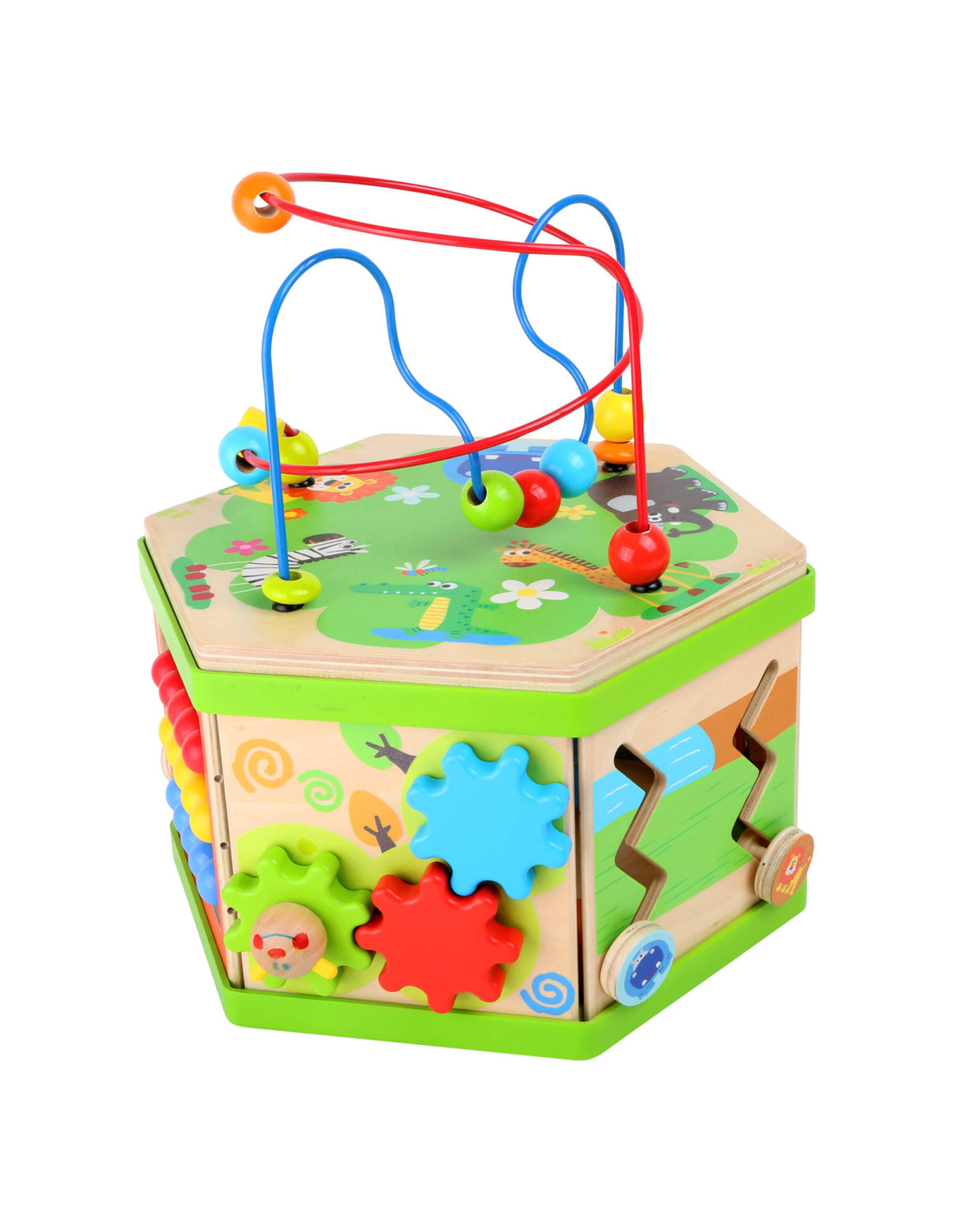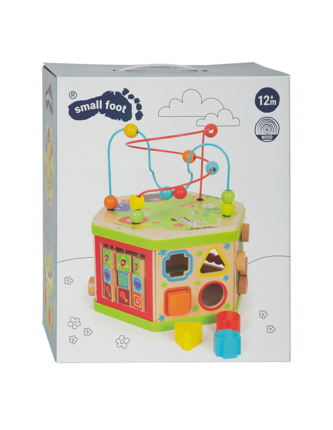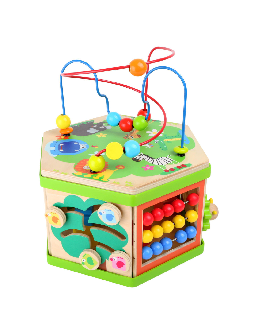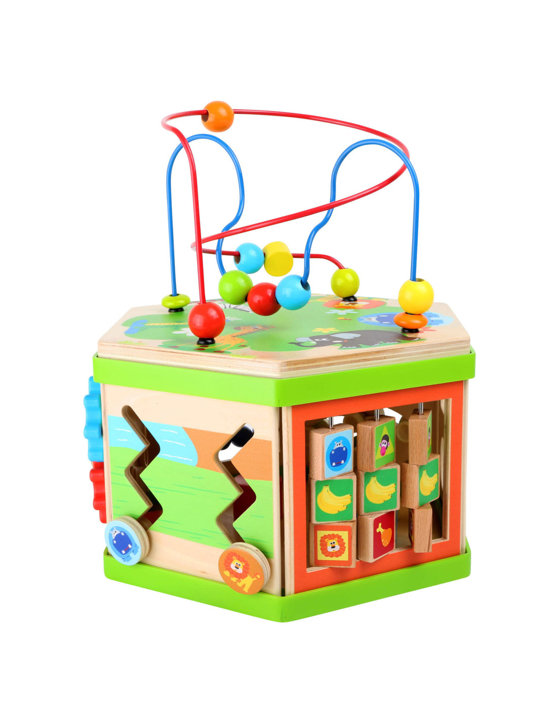 Deze motorische kubus van hout biedt tal van speelmogelijkheden op zijn zeven speeloppervlakken. De schuifteller, het schuifspel en het kralendoolhof trainen allemaal de motoriek en helpen kinderen spelenderwijs hoeveelheden te leren begrijpen en herkennen. Hun nieuwsgierigheid en ontdekkingsdrang worden bevredigd en ook bevordert de kubus de oog-handcoördinatie en hun creativiteit.