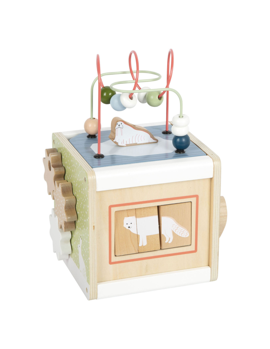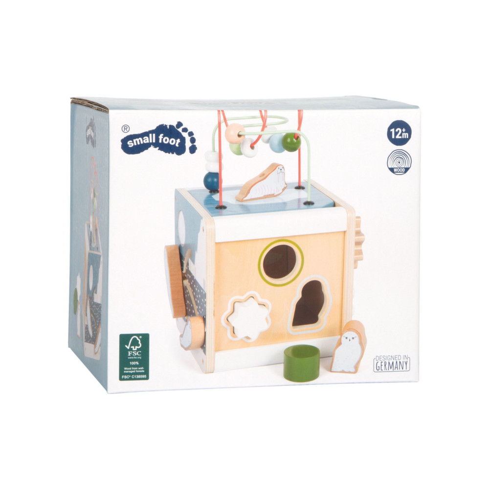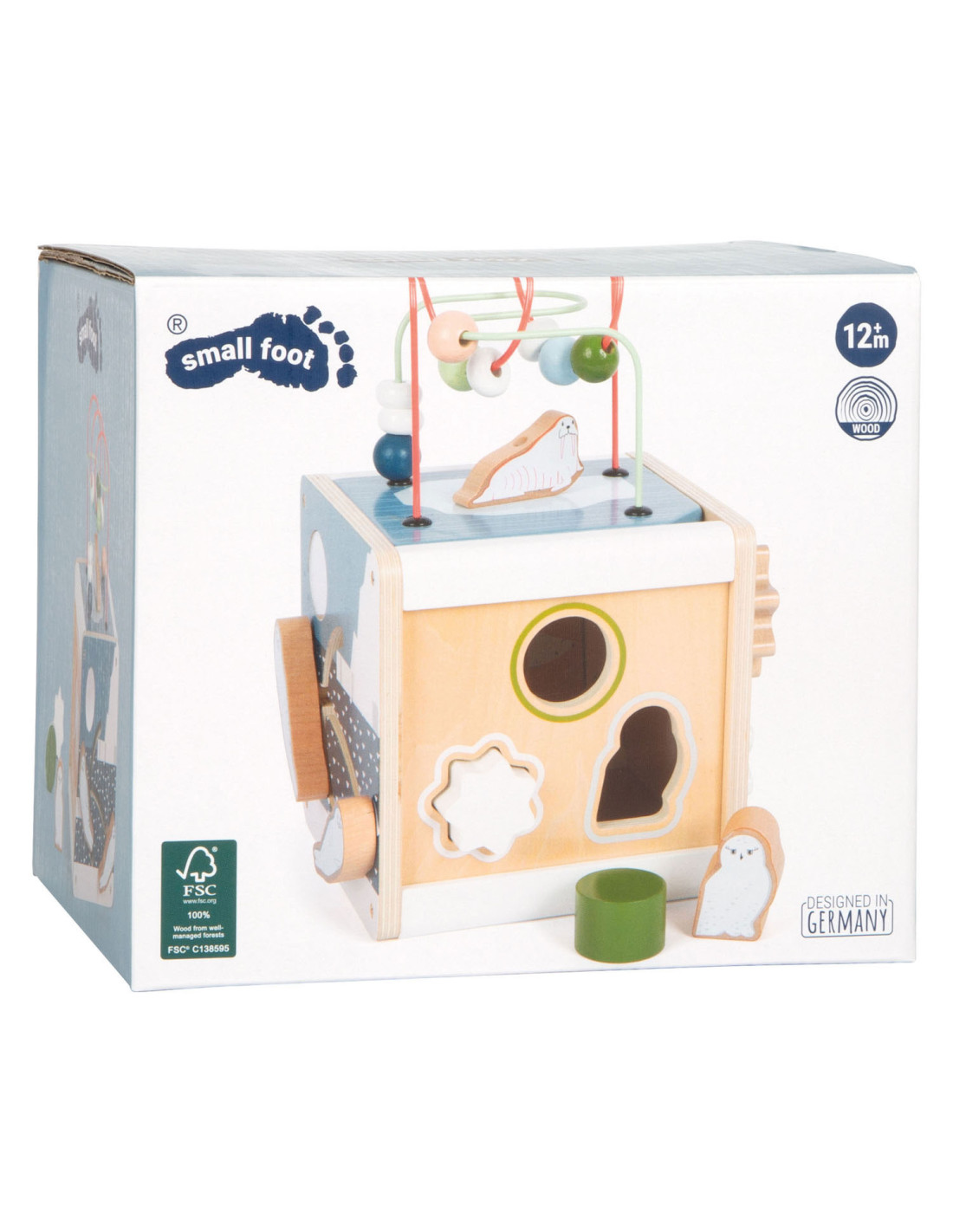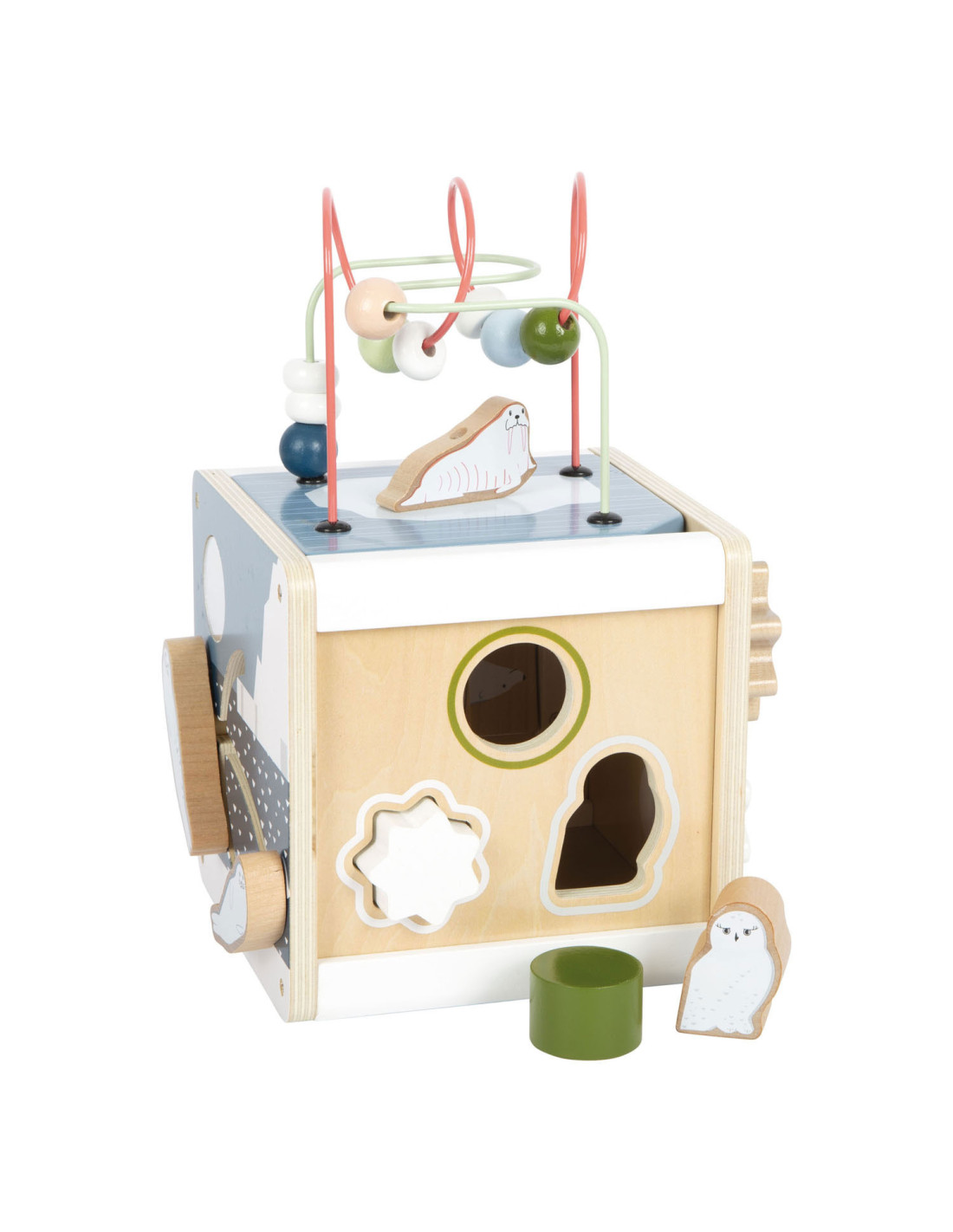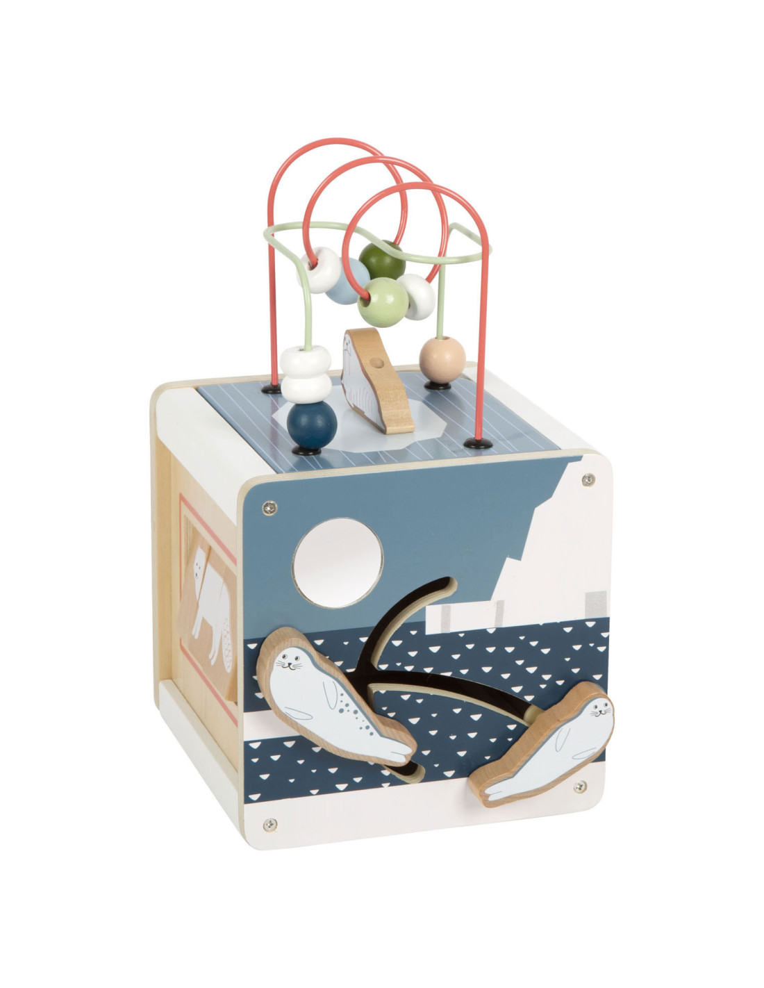 Motorisch plezier met het poolkonijn, de ijsbeer, de zeehond en al hun vrienden! Deze liefdevol ontworpen motorische kubus van 100% FSC®-gecertificeerd hout is een allrounder als het gaat om spelen en leren en biedt op de vijf speelbare oppervlakken veel te ontdekken. Twee kralendoolhoven, een passend spel, een glijdend doolhof, draaiende tegels en tandwielen zorgen voor langdurig vermaak en diverse leermogelijkheden. De zeehond, walrus, ijsbeer en andere pooldieren begeleiden de jonge ontdekkingsreizigers op elk oppervlak van de kubus en wekken op een leuke manier nieuwsgierigheid op. Wordt geleverd met een afneembaar deksel dat in de kubus kan worden opgeborgen om ruimte te besparen.