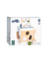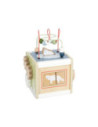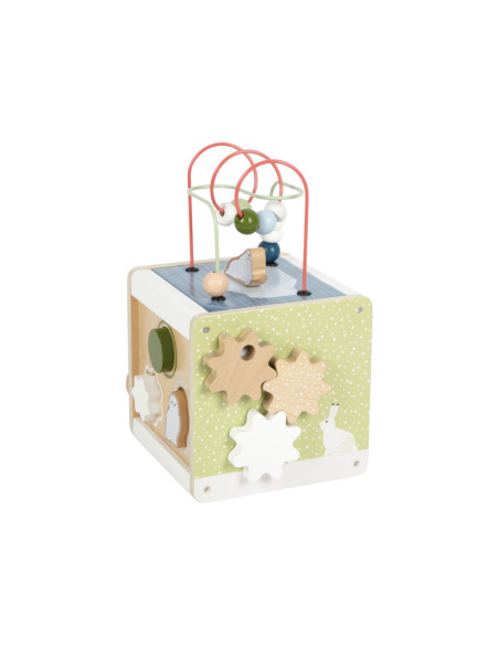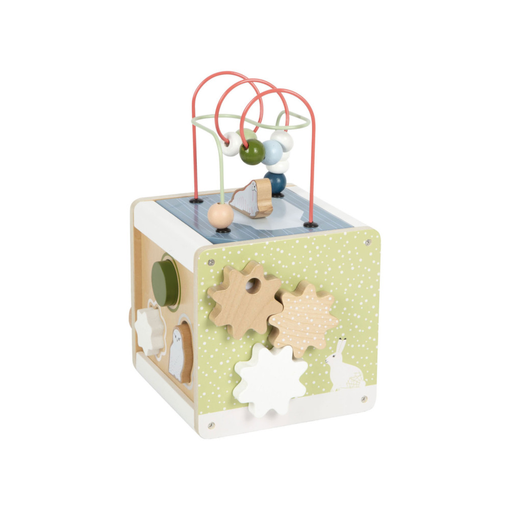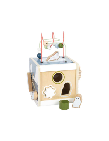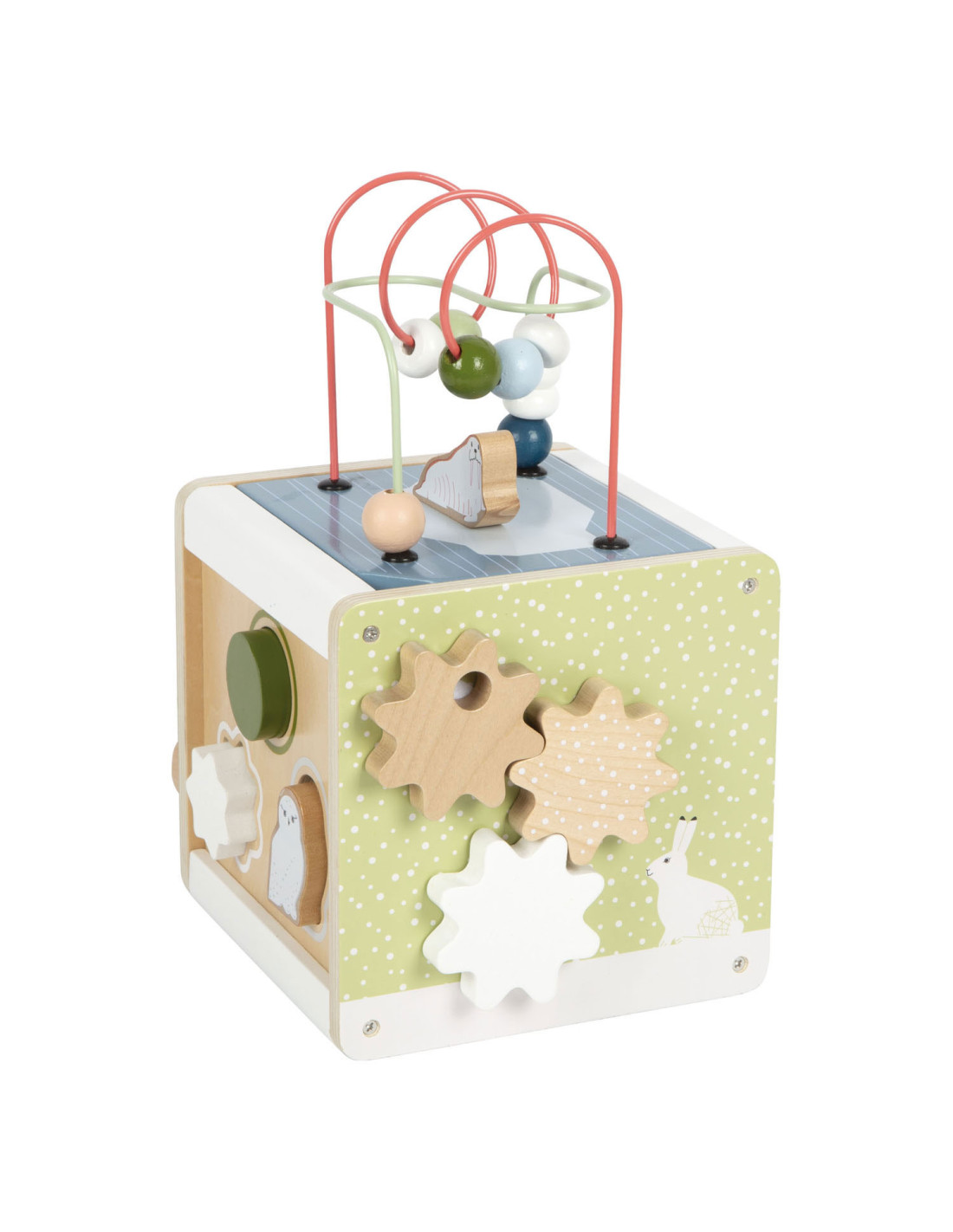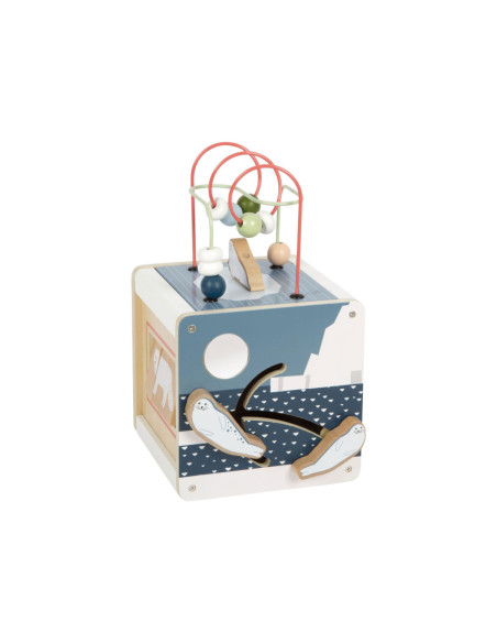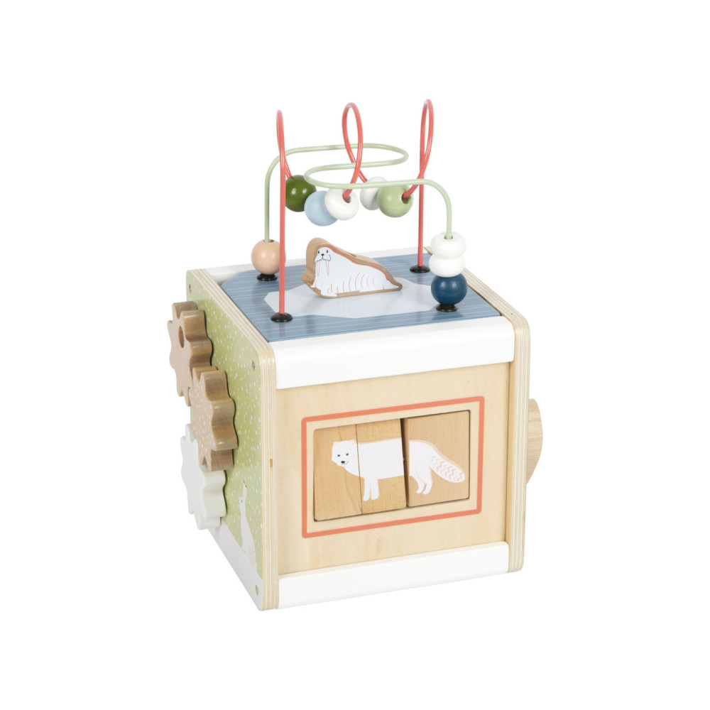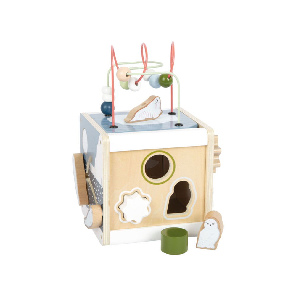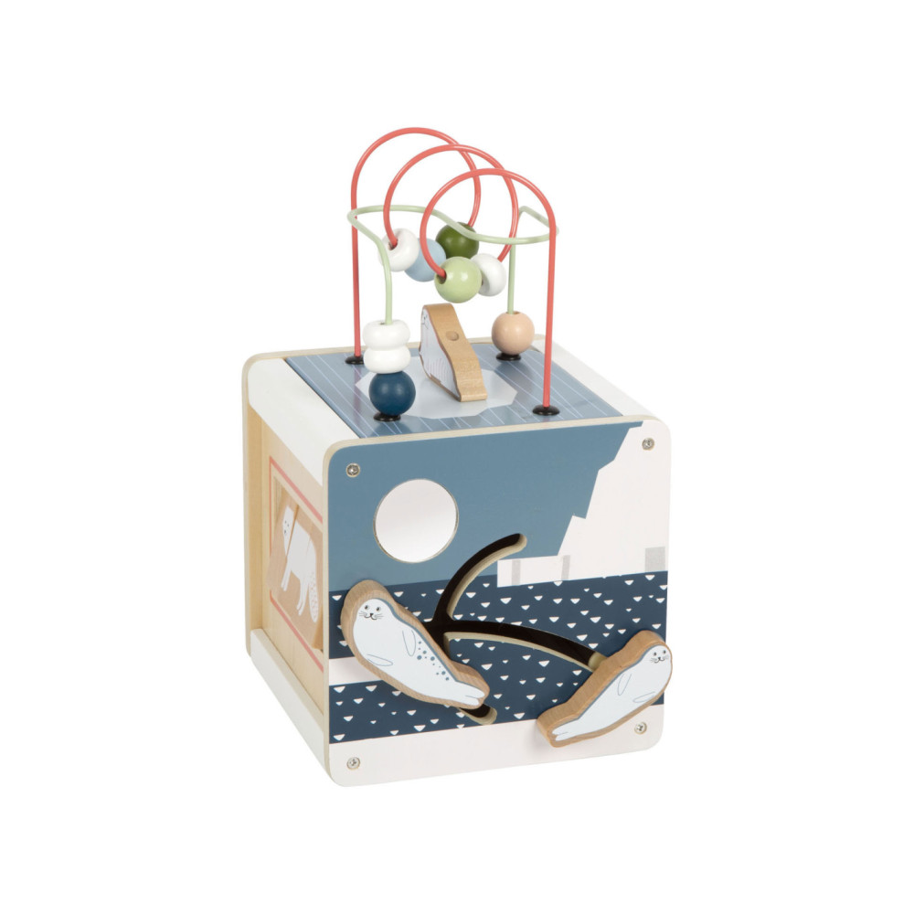 Motorisch plezier met het poolkonijn, de ijsbeer, de zeehond en al hun vrienden! Deze liefdevol ontworpen motorische kubus van 100% FSC®-gecertificeerd hout is een allrounder als het gaat om spelen en leren en biedt op de vijf speelbare oppervlakken veel te ontdekken. Twee kralendoolhoven, een passend spel, een glijdend doolhof, draaiende tegels en tandwielen zorgen voor langdurig vermaak en diverse leermogelijkheden. De zeehond, walrus, ijsbeer en andere pooldieren begeleiden de jonge ontdekkingsreizigers op elk oppervlak van de kubus en wekken op een leuke manier nieuwsgierigheid op. Wordt geleverd met een afneembaar deksel dat in de kubus kan worden opgeborgen om ruimte te besparen.