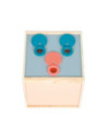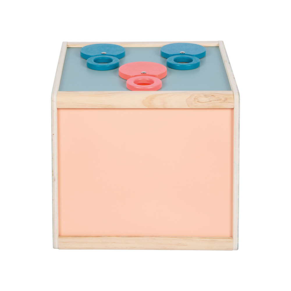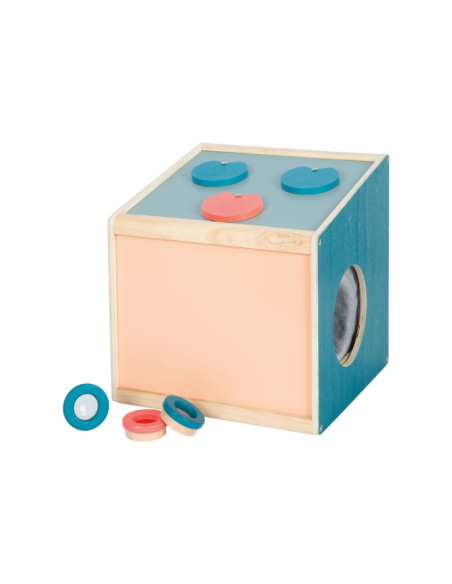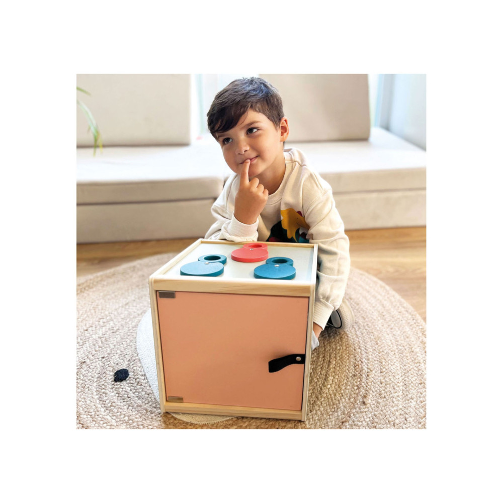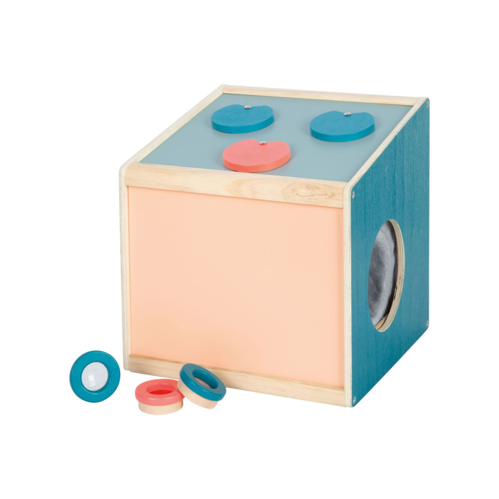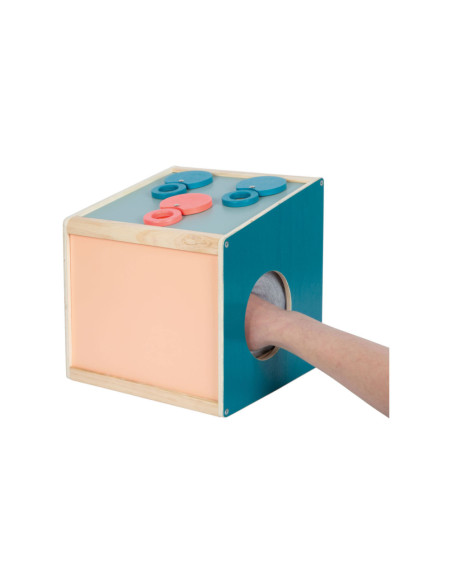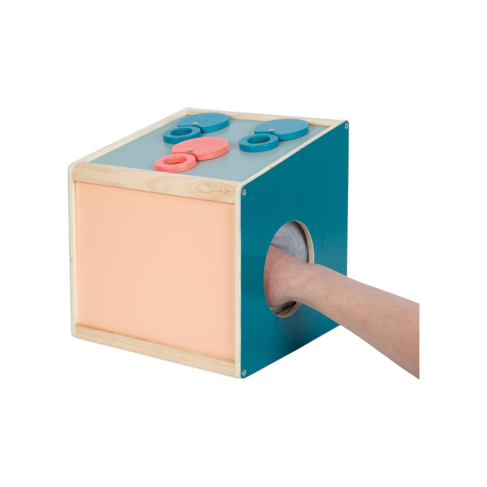 Via de achterdeur met magnetische sluiting kunnen voorwerpen in deze houten kist worden geplaatst. Hoezen van stof aan de zijopeningen blokkeren het zicht in de doos en bieden tegelijkertijd aangenaam gedempte openingen waar de handen doorheen kunnen grijpen. Dankzij de elastische stof kunnen de mouwen door zowel kinderen als ouders gebruikt worden. Het is een tactiel, visueel en reukzintuiglijk spel dat gokplezier biedt voor een of maximaal negen spelers. De mouwbanden zijn met klittenband vastgemaakt, waardoor ze afneembaar zijn en met de hand gewassen kunnen worden.