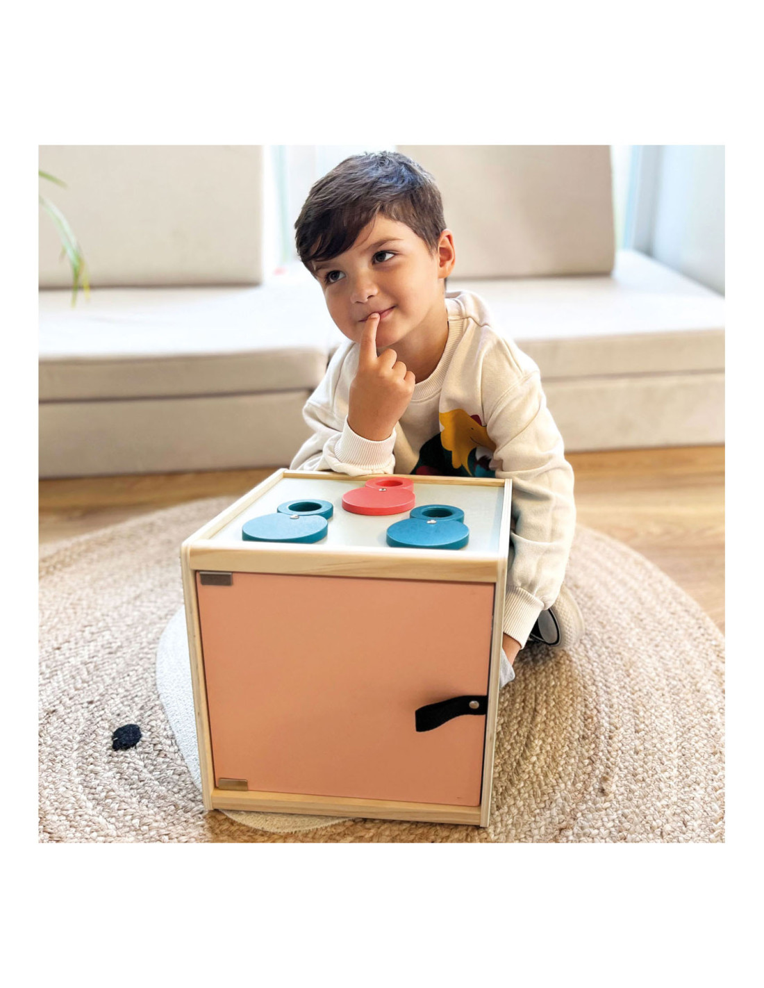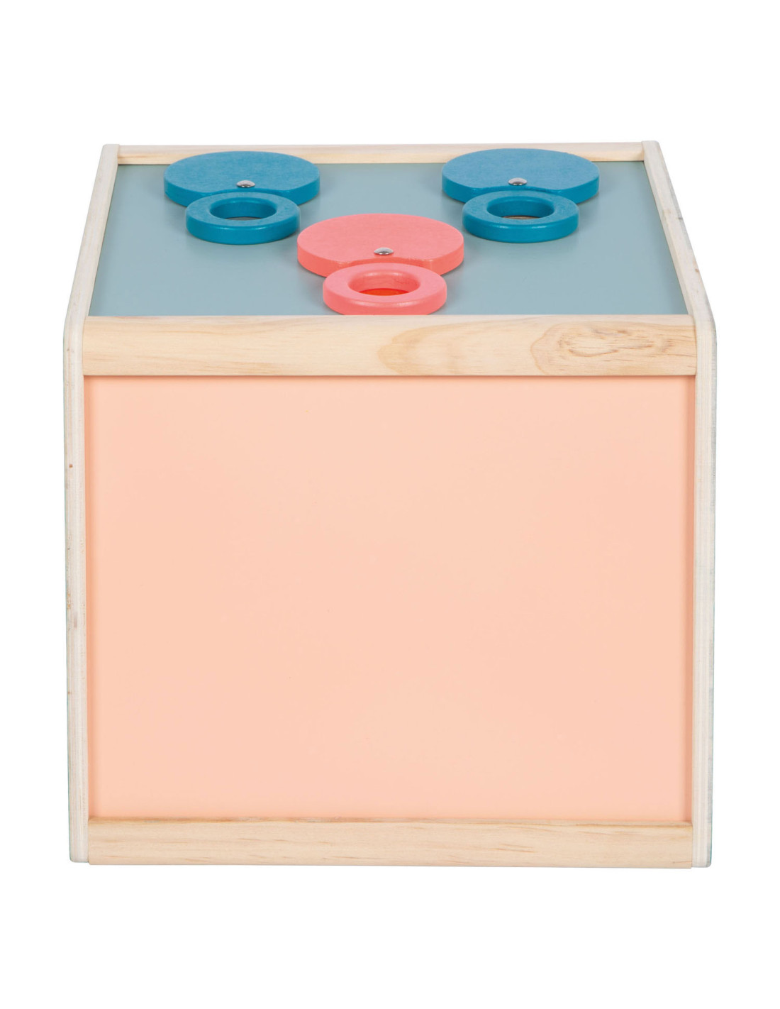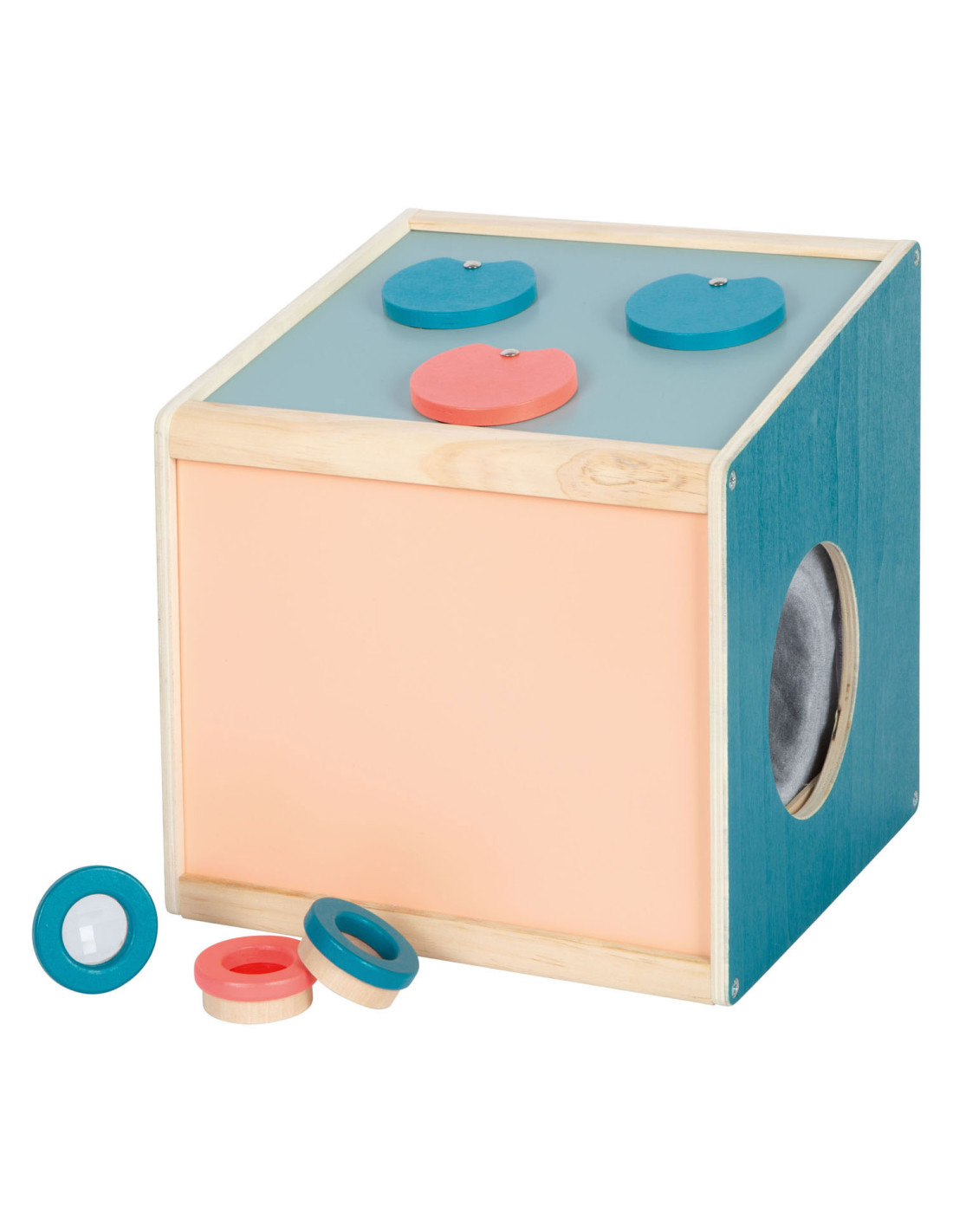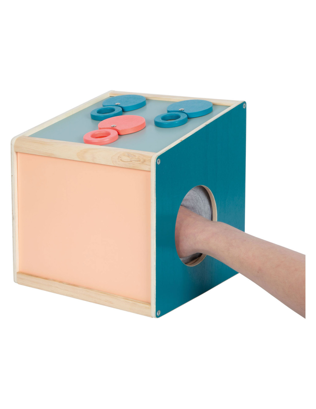 • Grote zintuiglijke gevoelsdoos van hout met twee openingen om voorwerpen in te reiken en te verkennen