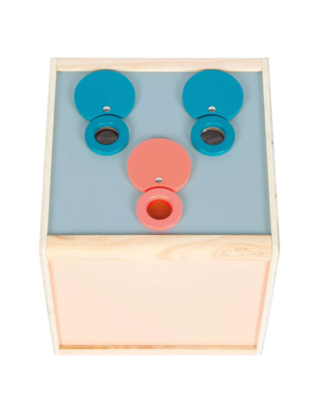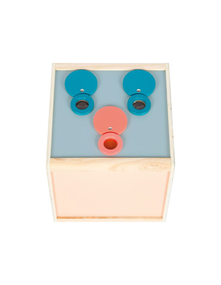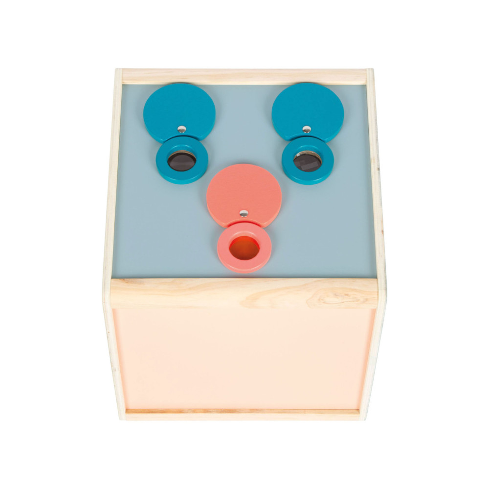 Scherp je zintuigen op een leuke manier! Deze royale sensorische velbox uit de productlijn "Sensory" heeft twee openingen aan de zijkant en biedt volop mogelijkheden om objecten te verkennen met behulp van aanraking, zicht, geur en gehoor. Met een vergrootglas, een caleidoscooplens en een rode lens kun je objecten in de doos op een nieuwe manier bekijken. Door de afgeschuinde bovenzijde van de doos is het gemakkelijk om er doorheen te kijken en voorwerpen aan te raken. De drie in hout omhulde lenzen kunnen eenvoudig worden verwijderd, waardoor de openingen aan de bovenkant van de doos kunnen worden gebruikt om te kijken, ruiken en luisteren. De hoeveelheid licht die de bak binnenkomt, kan worden geregeld via de openingshoek van de achterdeur en de bovenste vlinderopening.