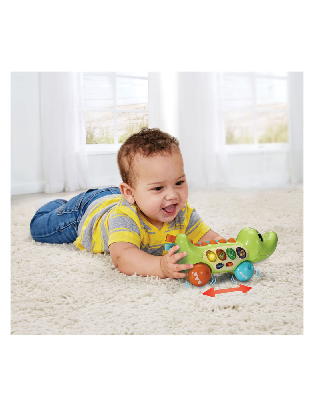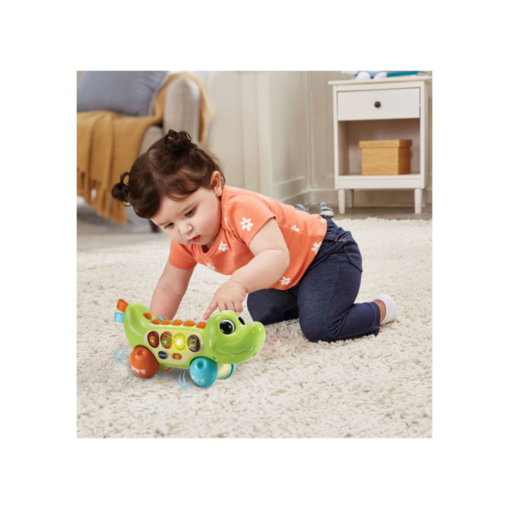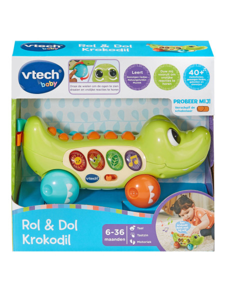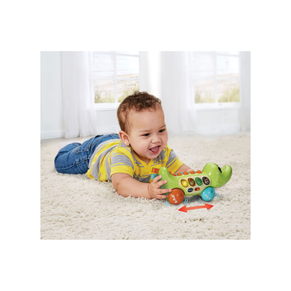 Tijd voor een vrolijk avontuur! Rol de krokodil vooruit om zijn ogen te zien draaien en grappige geluiden te horen. Druk op de toetsen om vrolijke reacties te horen en zie de lichtjes knipperen. De lintjes aan de staart en de stekels van zacht rubber stimuleren de tastzin. Deze grappige krokodil doet wat hij wil!