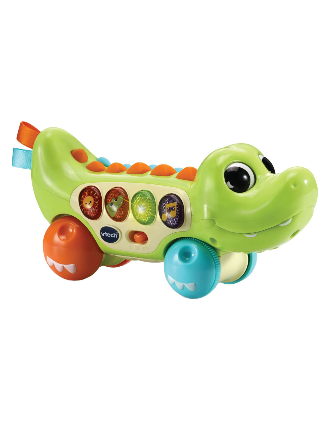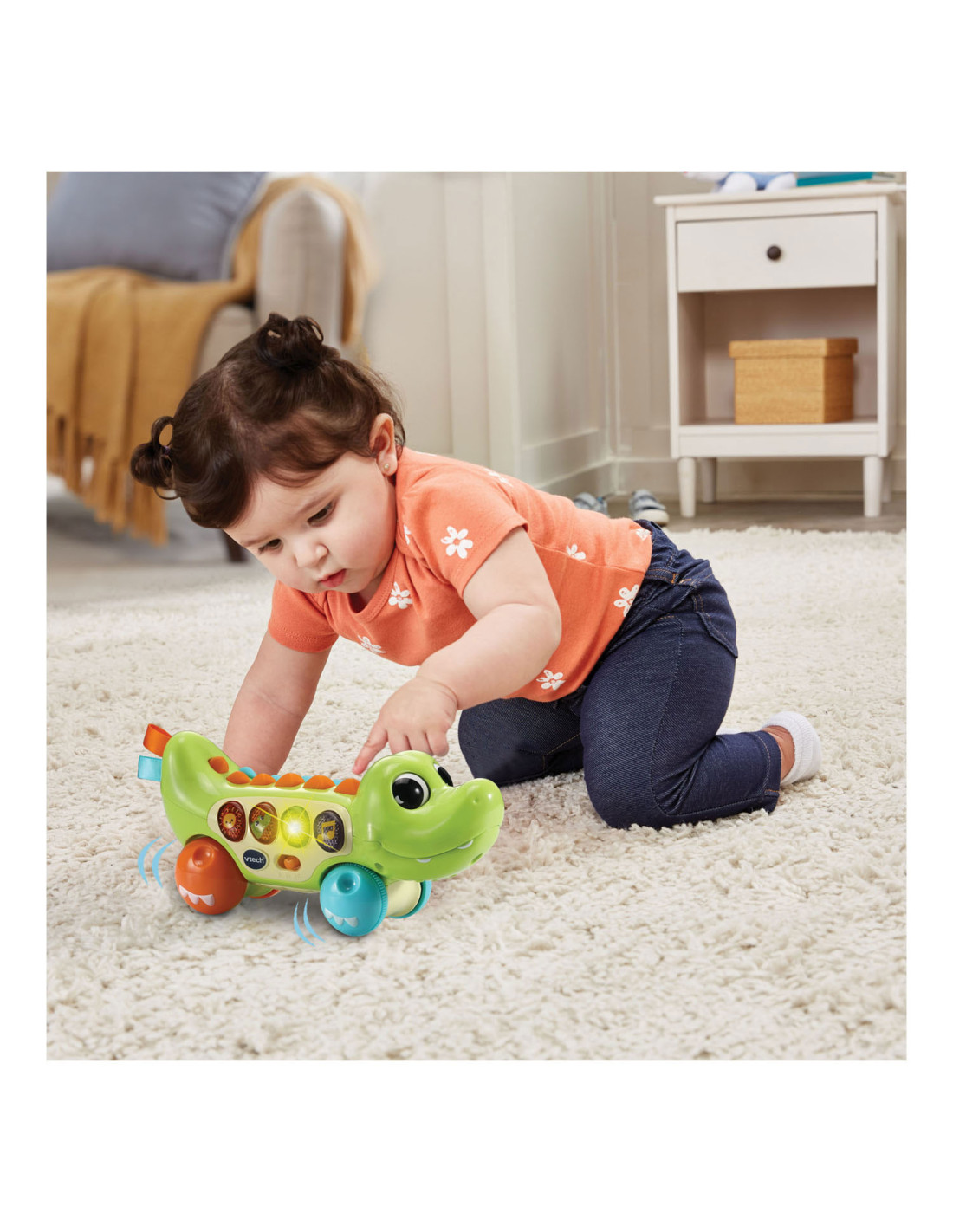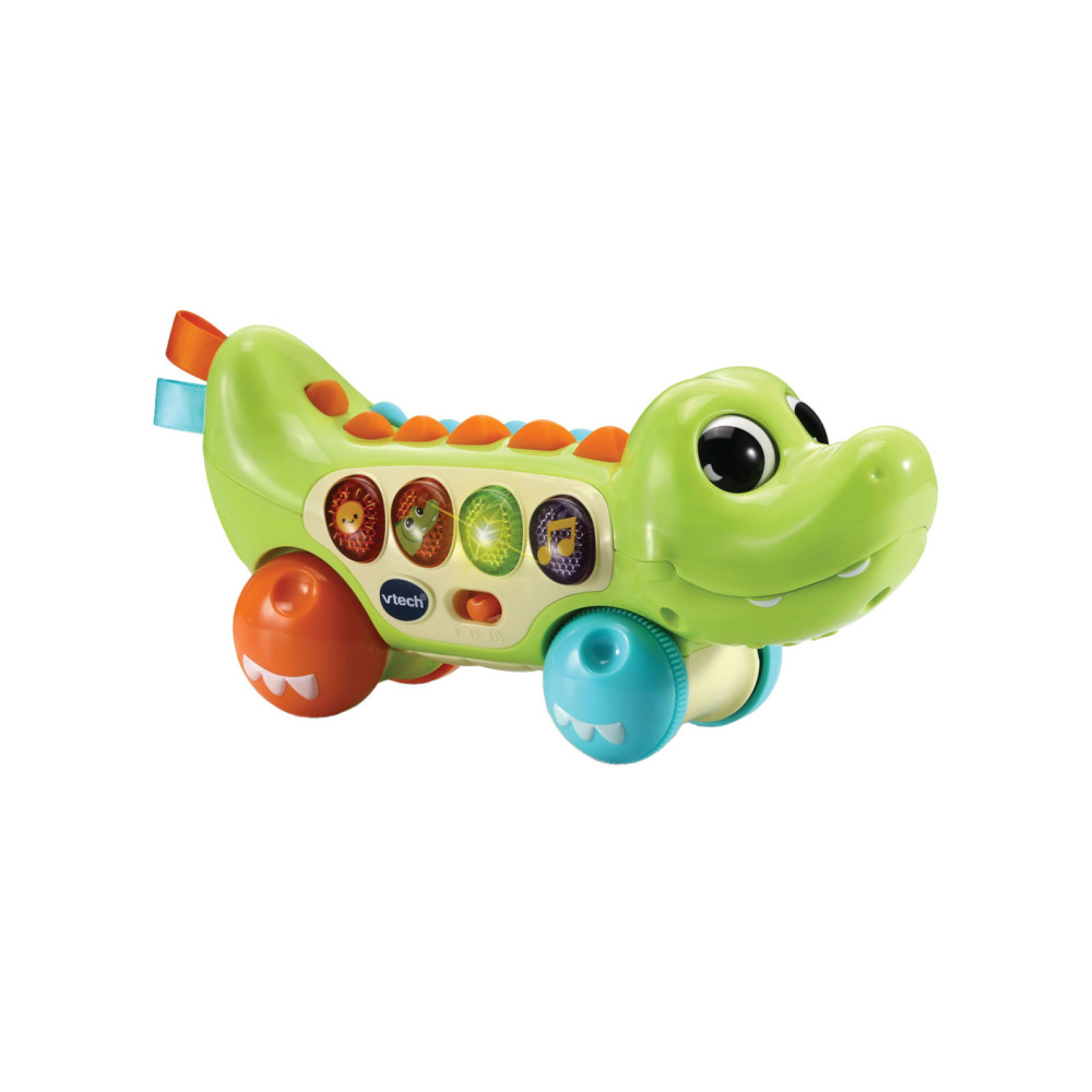 Tijd voor een vrolijk avontuur! Rol de krokodil vooruit om zijn ogen te zien draaien en grappige geluiden te horen. Druk op de toetsen om vrolijke reacties te horen en zie de lichtjes knipperen. De lintjes aan de staart en de stekels van zacht rubber stimuleren de tastzin. Deze grappige krokodil doet wat hij wil!