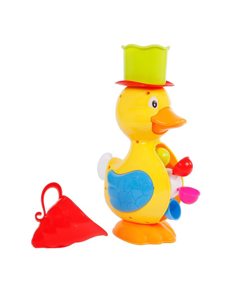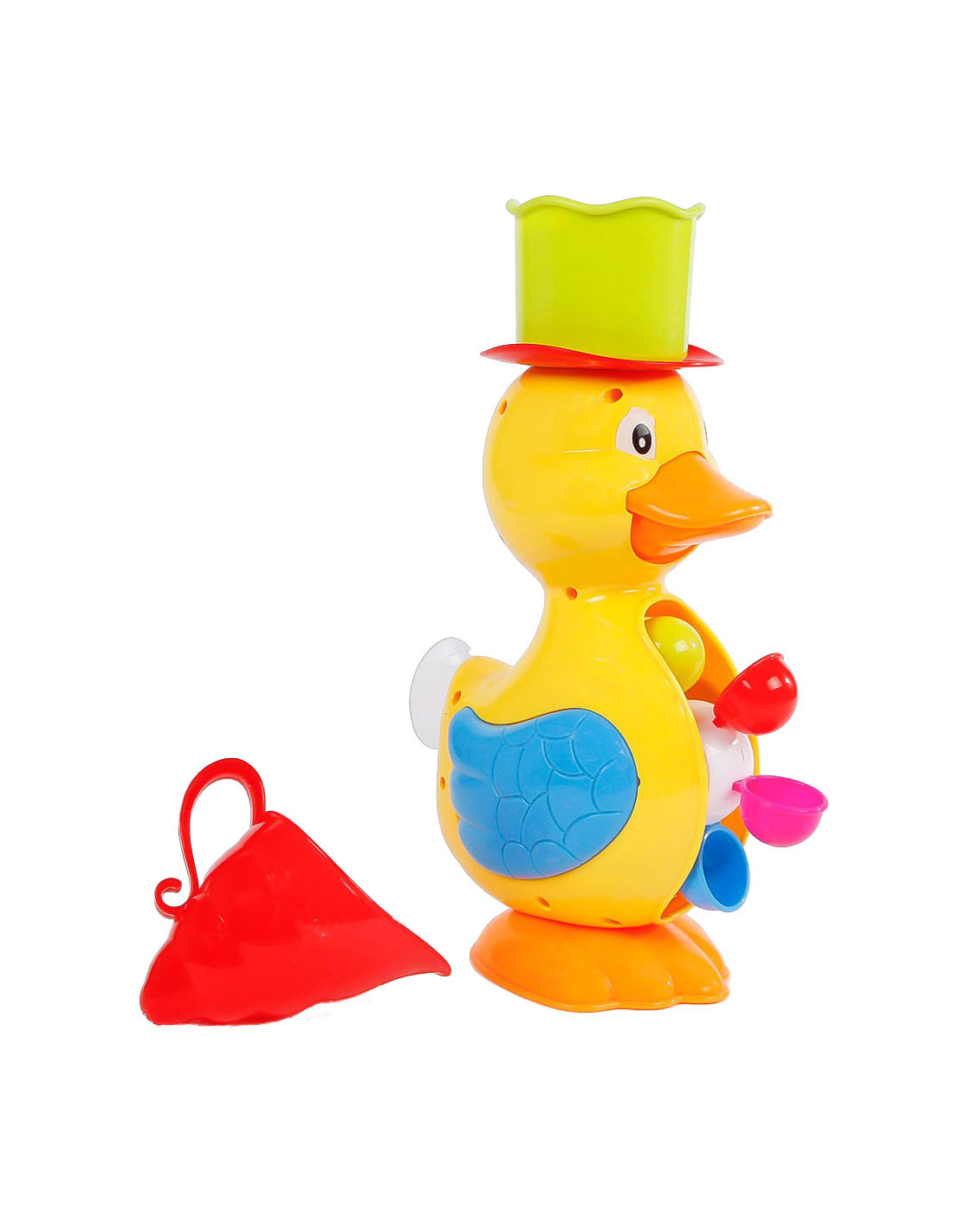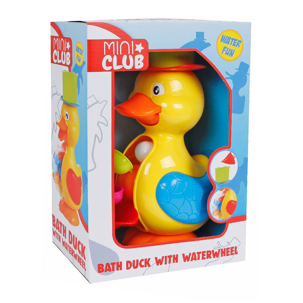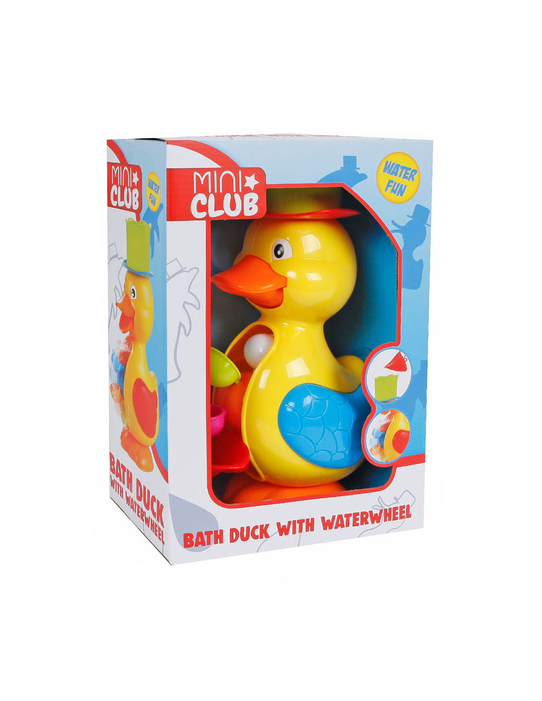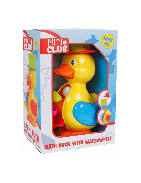 Mini Club badspeeltje: deze gele eend heeft een hoedje om water in te gieten met de meegeleverde schenkbeker. Het water stroom vervolgens uit zijn snavel en brengt het waterrad in beweging. Inclusief zuignap en schenkbeker. Gemaakt van kunststof, 28cm groot en geschikt vanaf 12 maanden.,