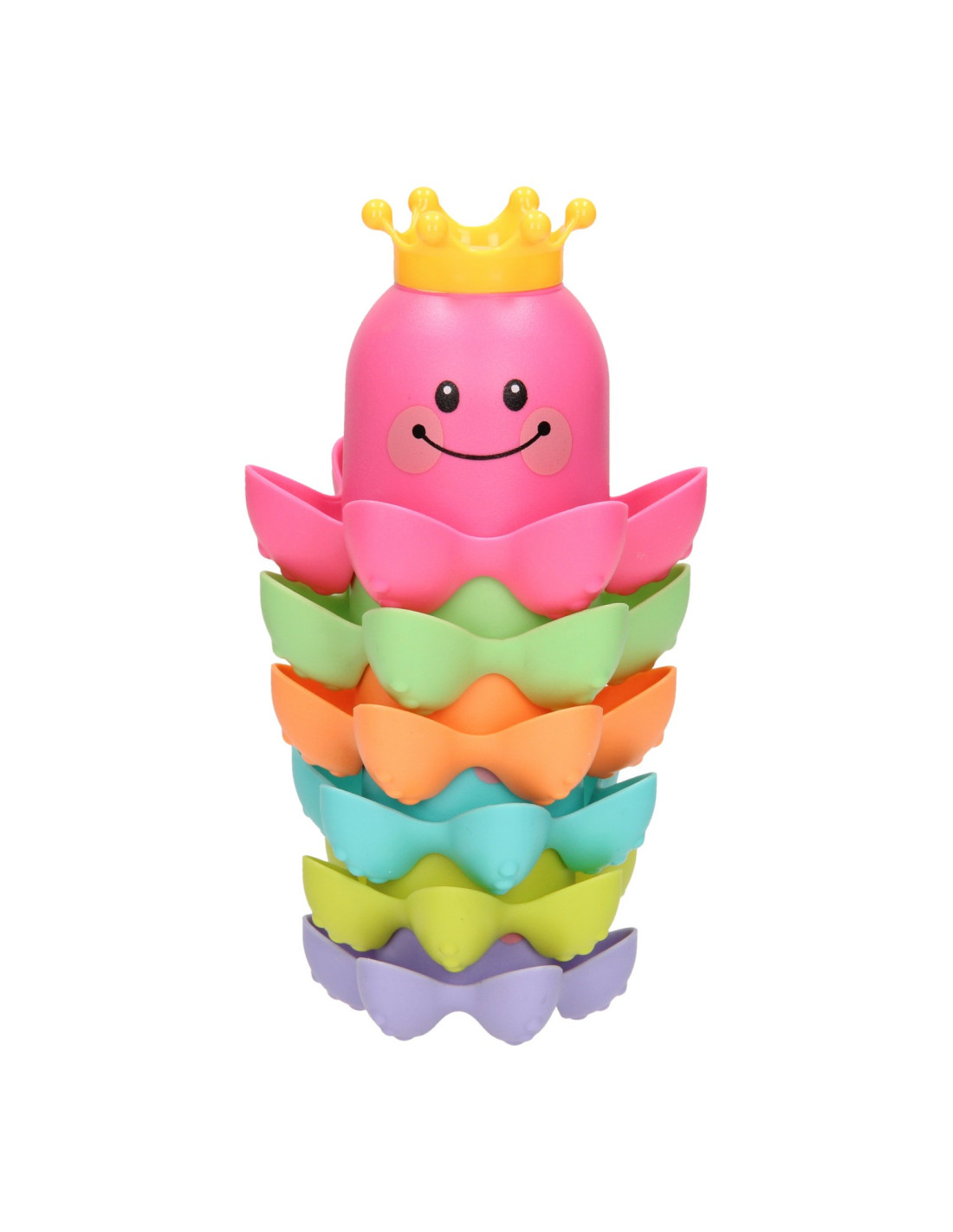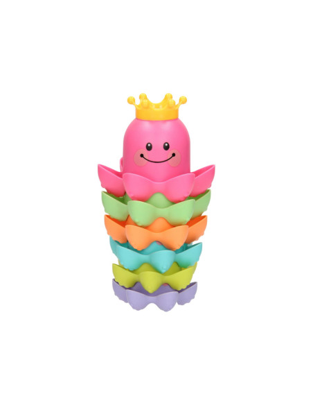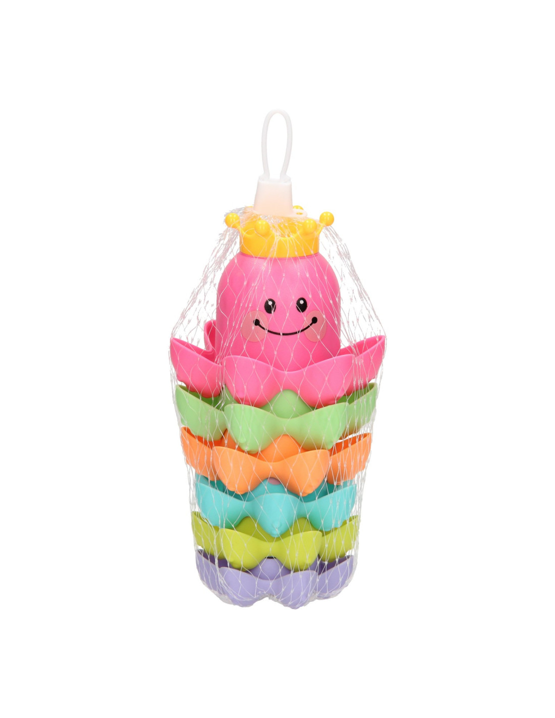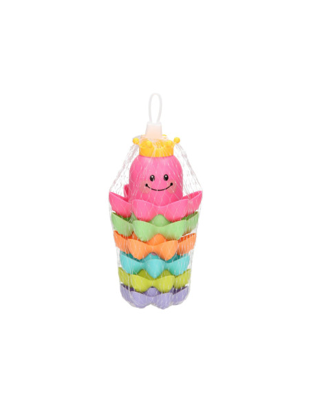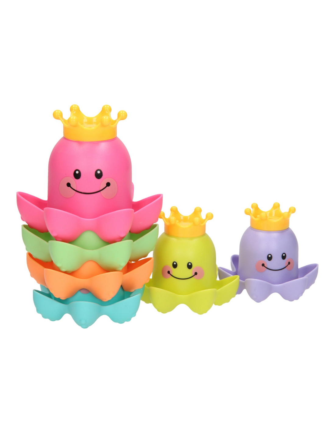 Met dit vrolijke badspeelgoed kun je de kleine wel even vermaken! De kunststof stapelbekers hebben de vorm van een octopus zijn bedrukt met een vrolijk gezichtje. Stapel de gekleurde bekers op elkaar of vul de bekertjes met water. Dankzij de gaatjes in het kroontje kunnen de bekers ook als gieter gebruikt worden.