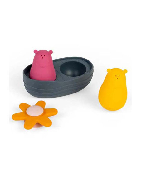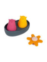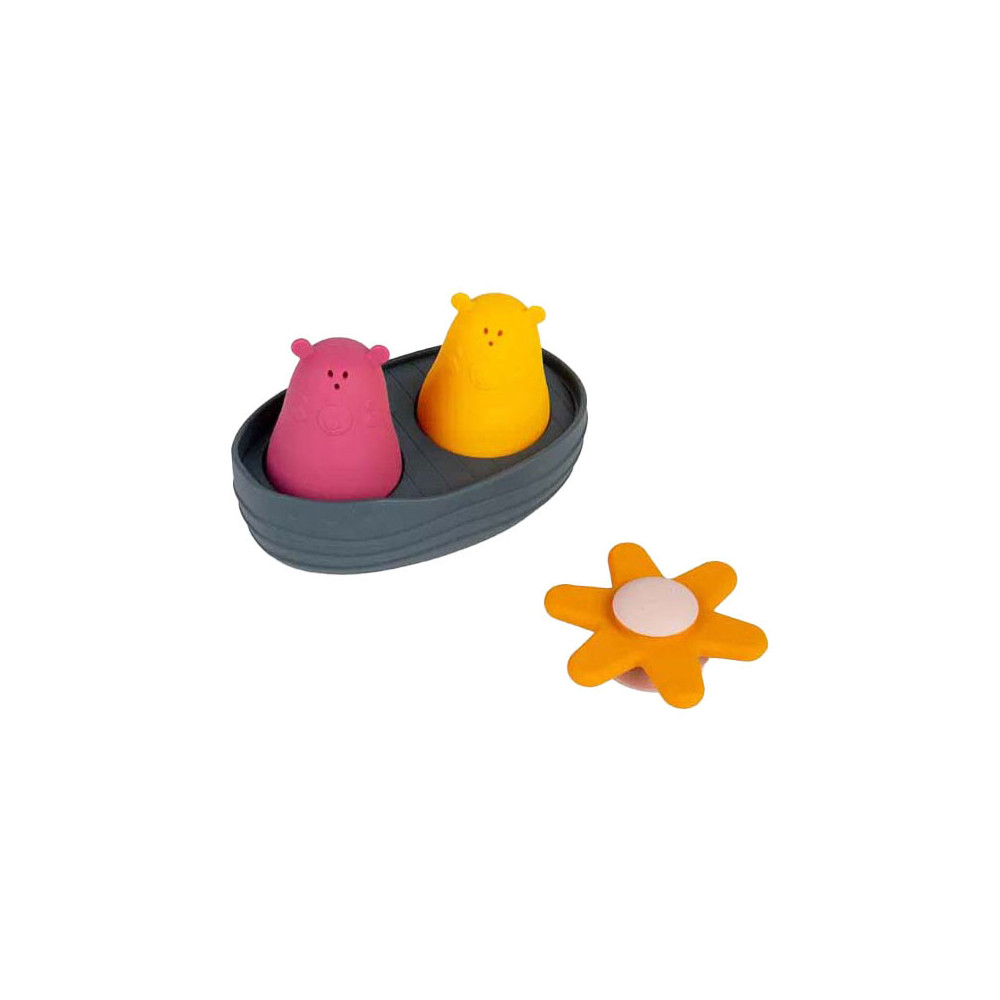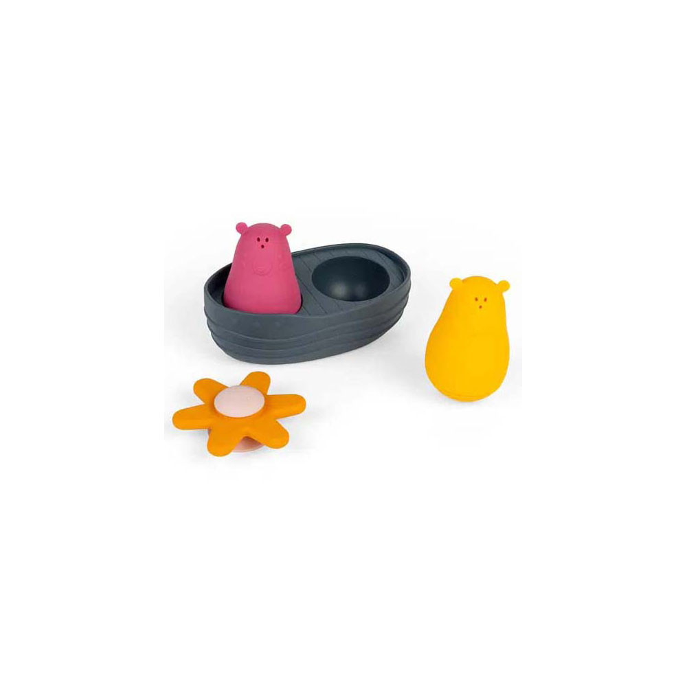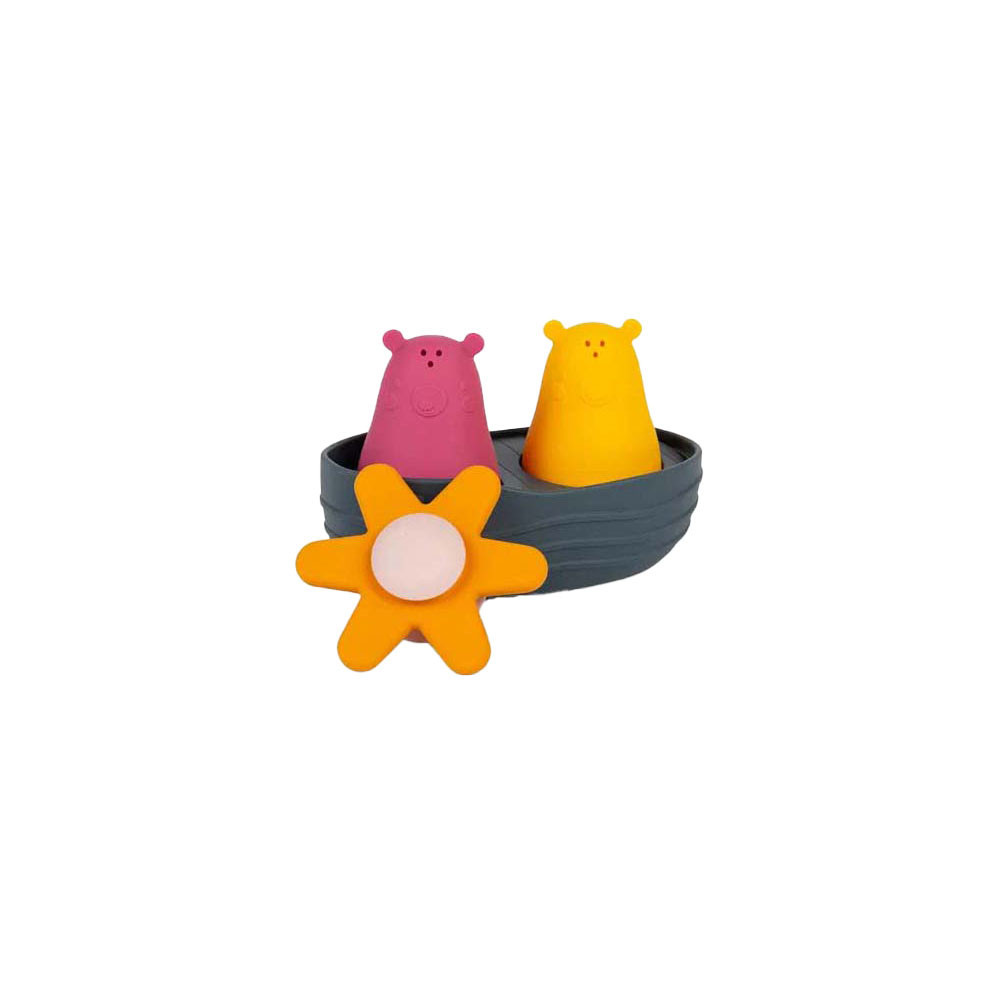 Draai, knijp en zeil! Deze actievolle sensorische badset is gemaakt van zachte siliconen en wordt geleverd met vier friemelvriendelijke waterspeeltjes die zijn ontworpen voor speelse badavonturen. Kinderen kunnen het bloemenwiel draaien, water uit de twee beren schieten en de boot langs golvende bubbelbadzeeën leiden.