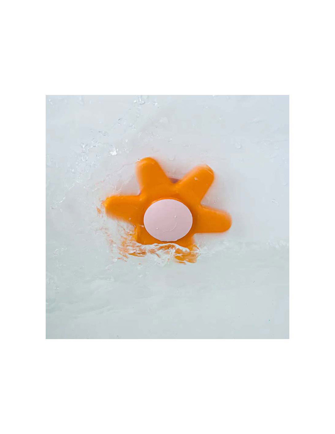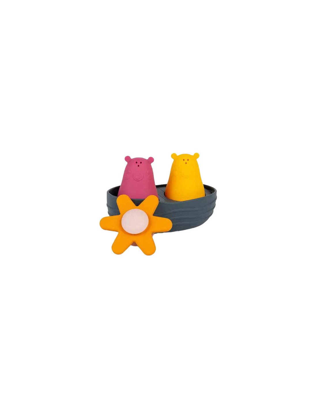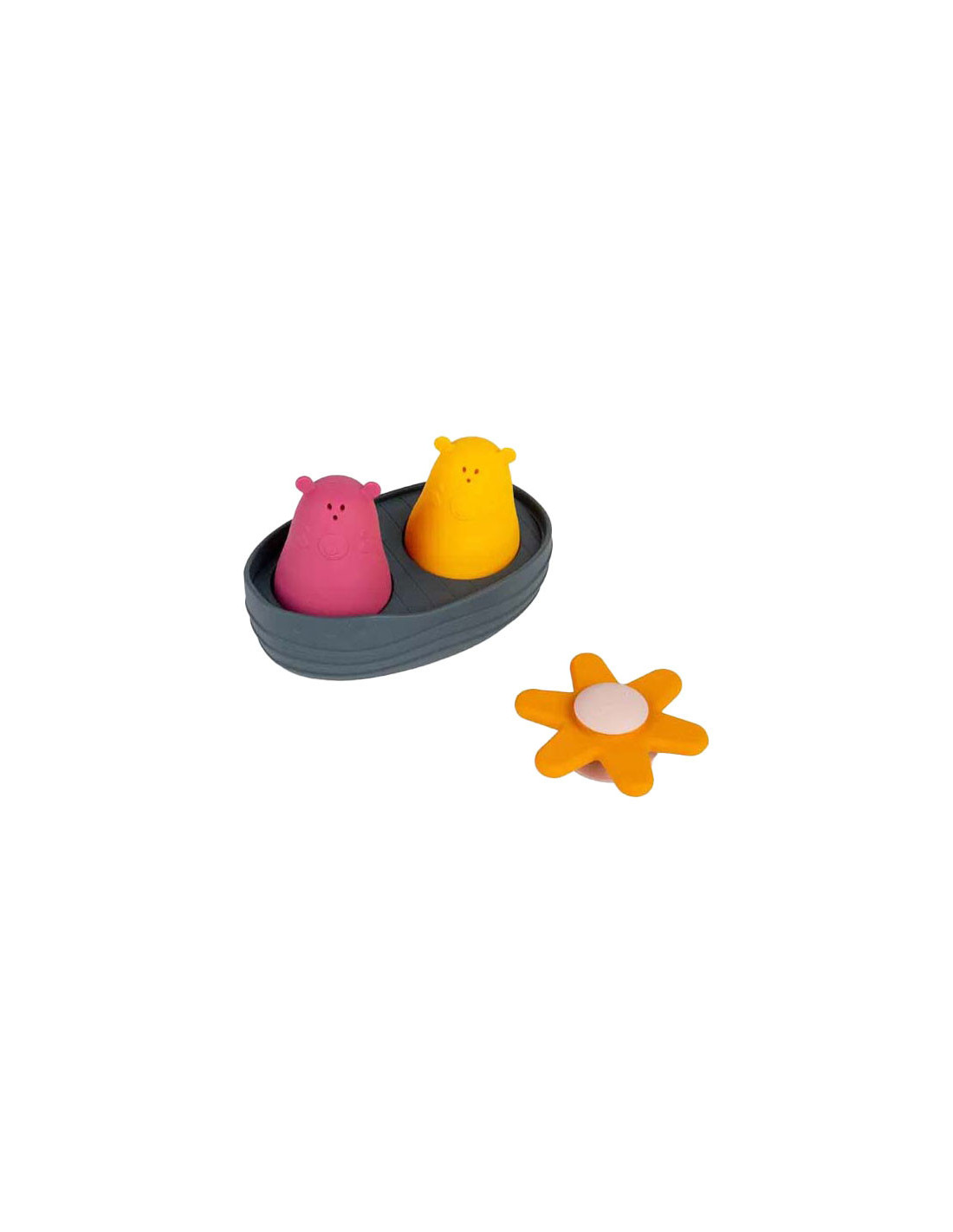 Draai, knijp en zeil! Deze actievolle sensorische badset is gemaakt van zachte siliconen en wordt geleverd met vier friemelvriendelijke waterspeeltjes die zijn ontworpen voor speelse badavonturen. Kinderen kunnen het bloemenwiel draaien, water uit de twee beren schieten en de boot langs golvende bubbelbadzeeën leiden.