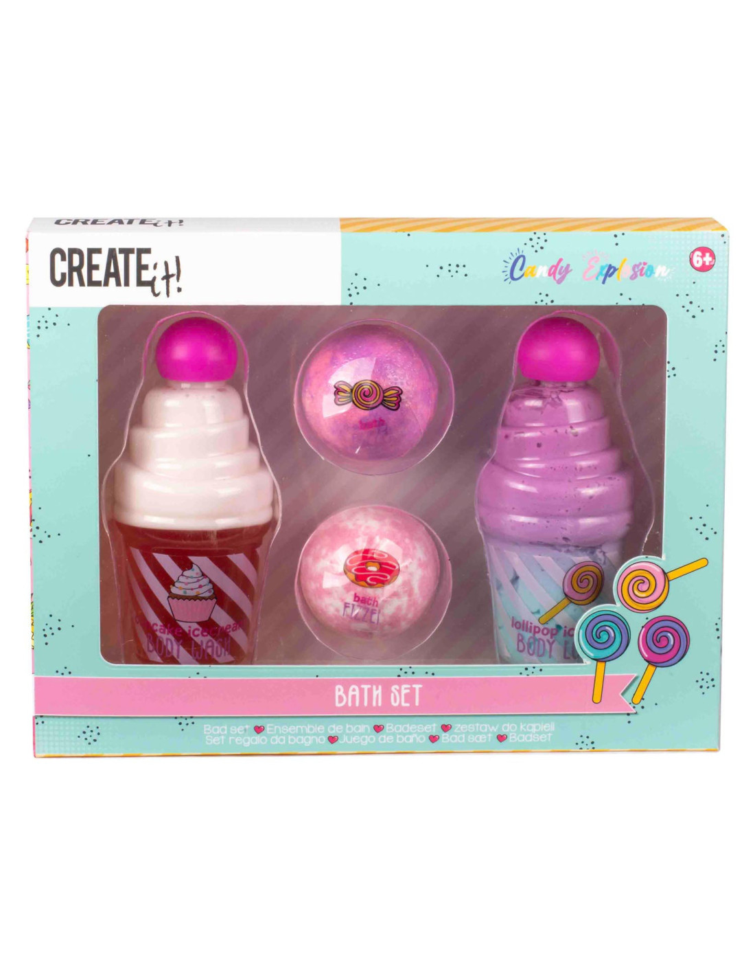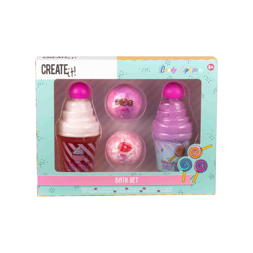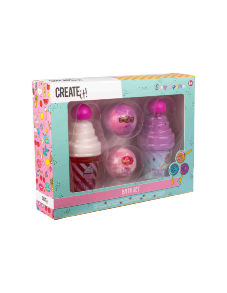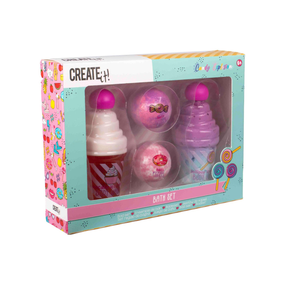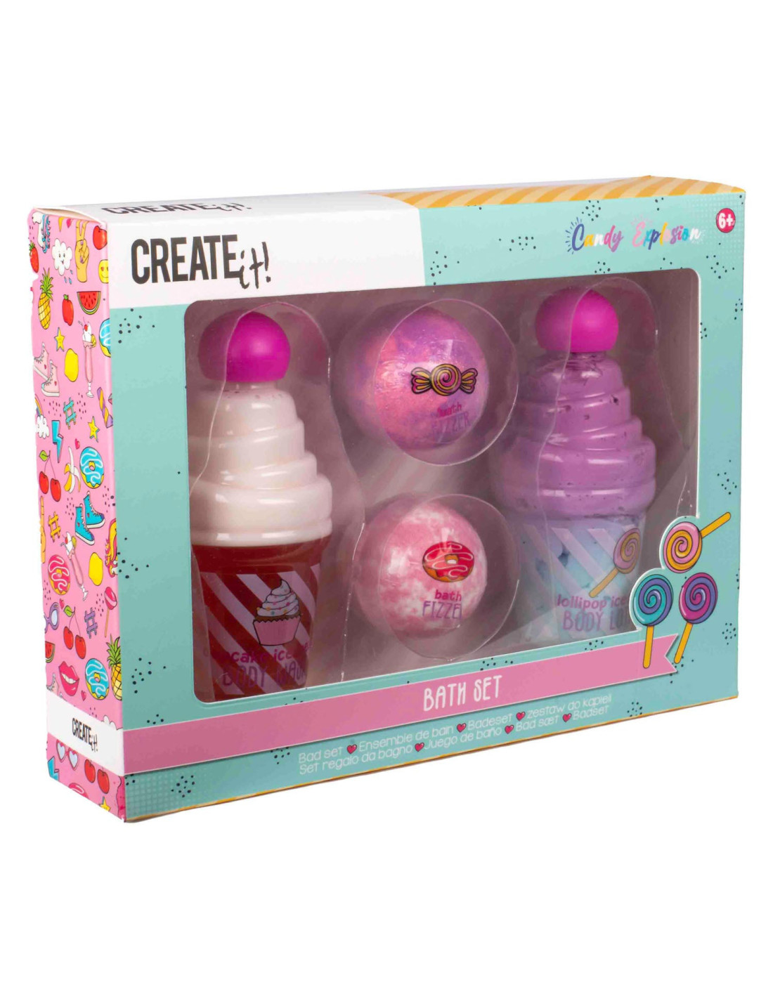 Badsetje in snoepjesvorm. Inhoud: 2 bruisballen, 1 bodylotion en 1 douchegel. Geschikt vanaf 6 jaar.