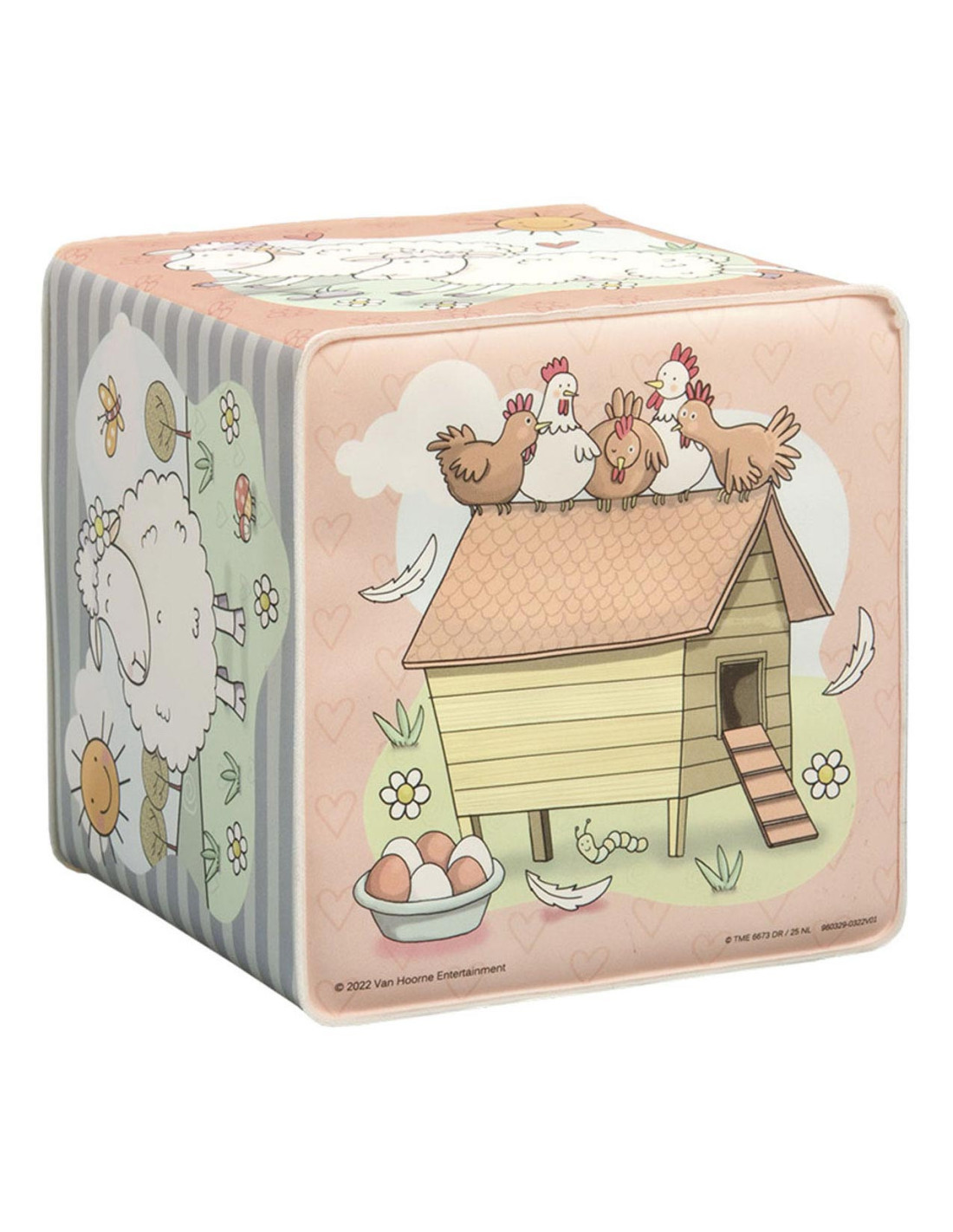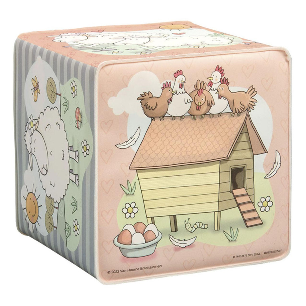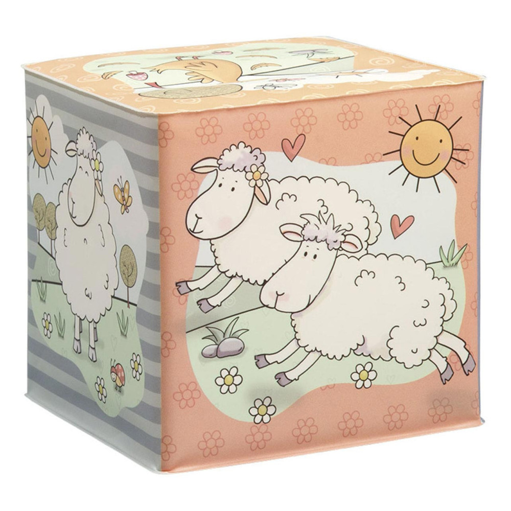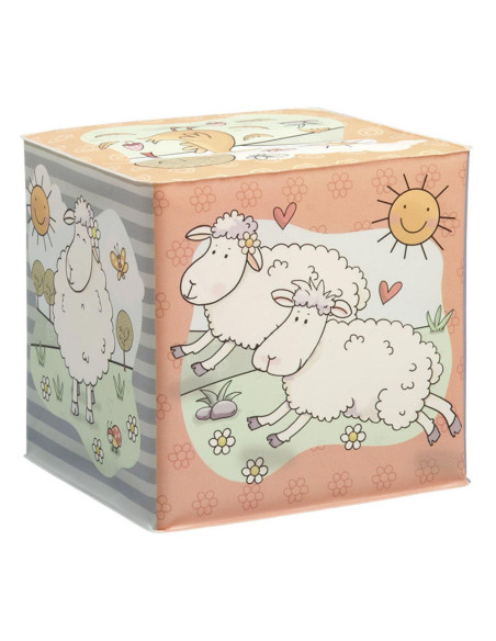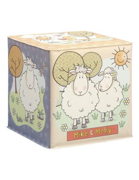 Waterbestendige badkubus van Mike & Molly, de schaapjes van Fien & Teun. Afmetingen: 8 x 8 x8 centimeter. Geschikt voor 0+.