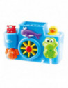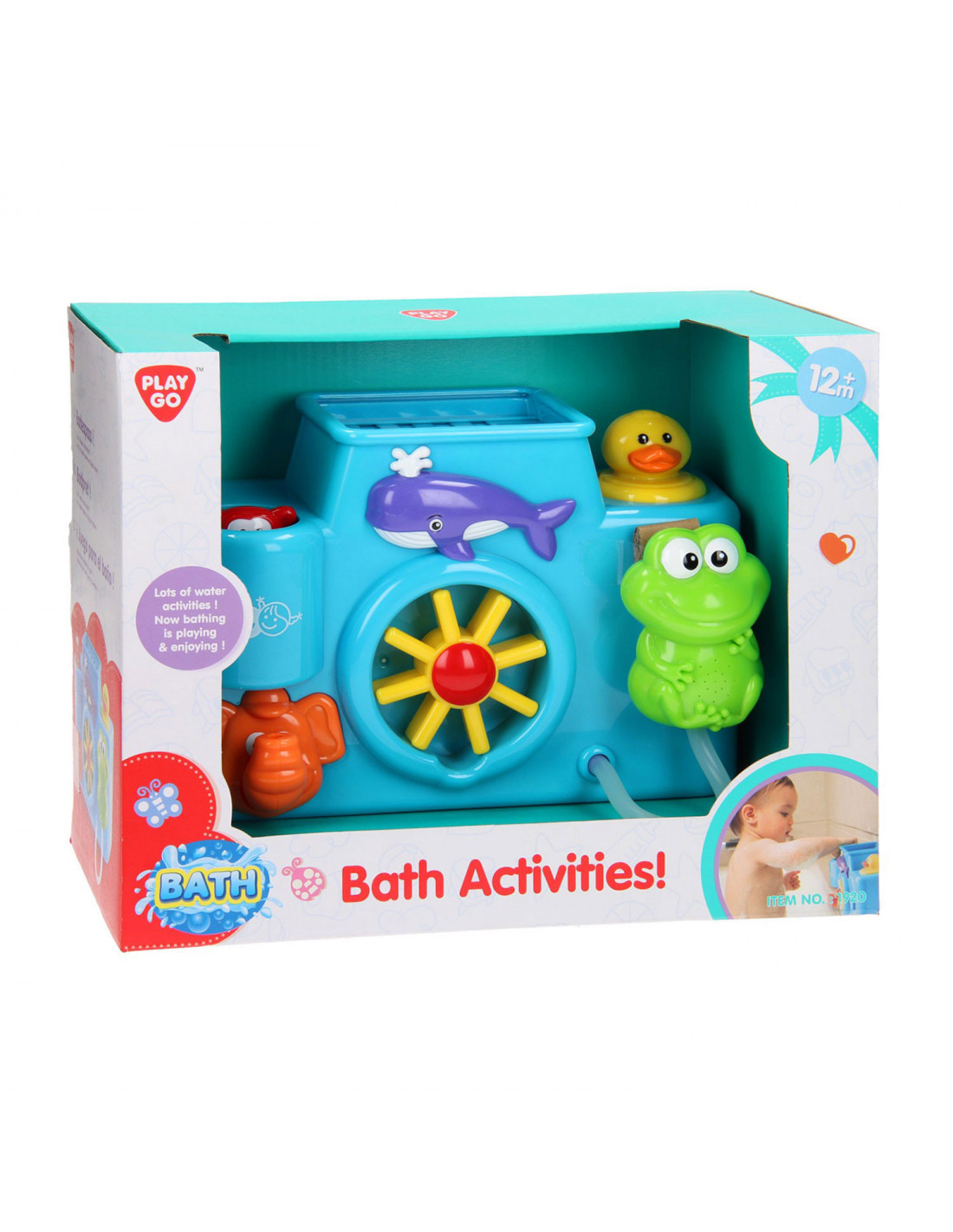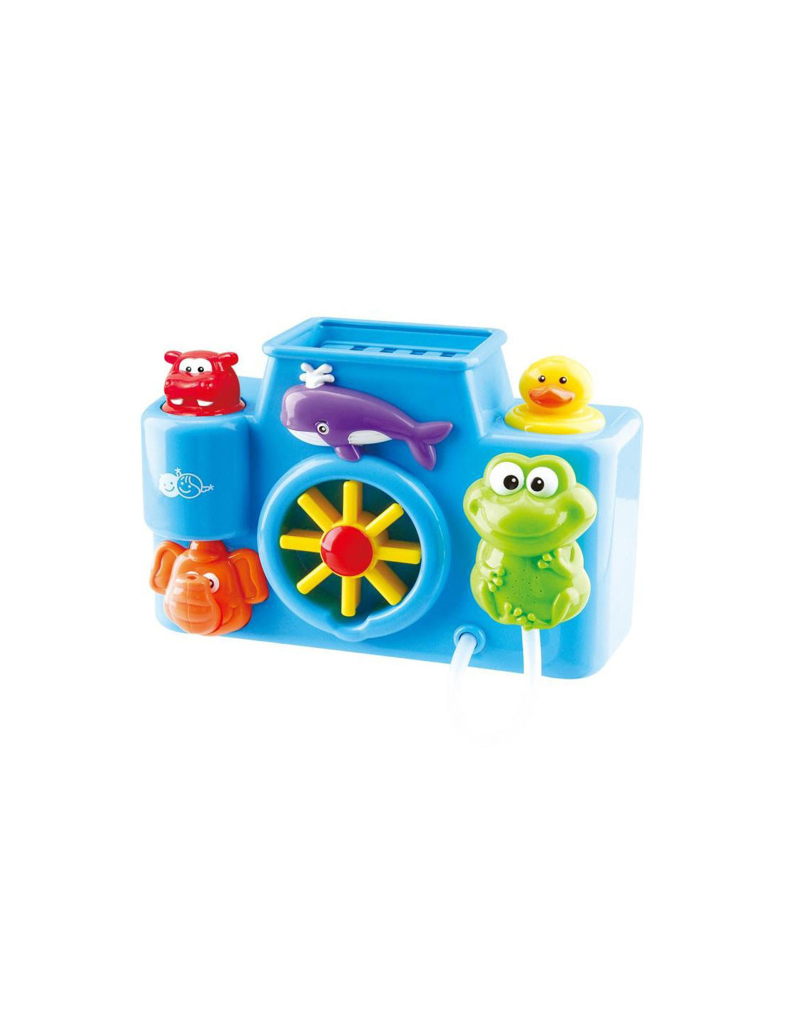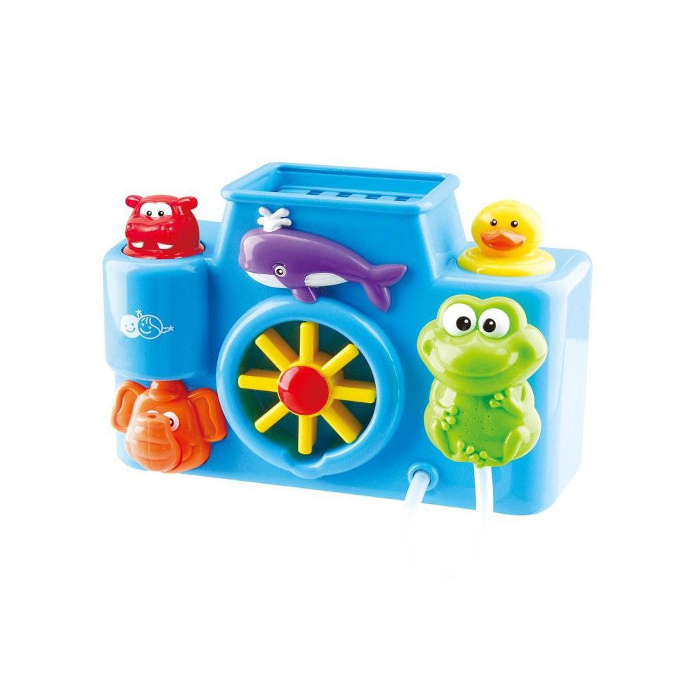 Maak van je bad een spetterend avontuur met deze vrolijke baby badset van Play. Vul de bovenzijde met water en zie hoe de dieren water spuwen en bewegen. Draai aan het rad, pomp water met de badeend en zie hoe de olifant water spuwt. Of haal de kikker van zijn plek en laat zijn buikje spetteren. Met de zuignappen bevestig je de badset eenvoudig aan de wand van het bad. De badset is gemaakt van stevig kunststof in vrolijke kleuren.