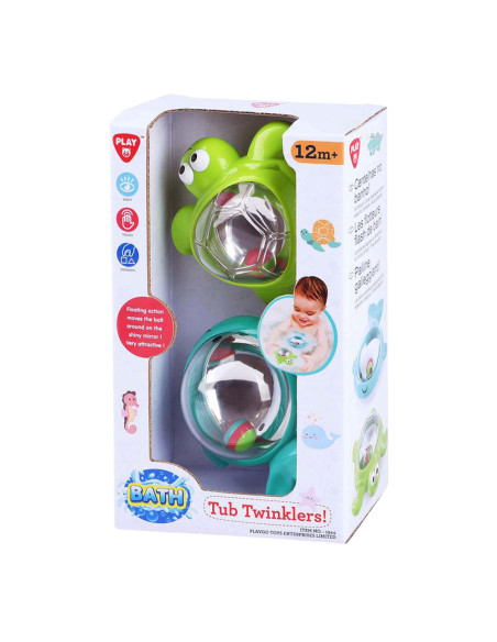 Drijvende walvis en schildpad voor in bad of in het zwembad. In de doorzichtige koepel zitten balletjes die bewegen. Geschikt voor kinderen vanaf 12 maanden.