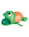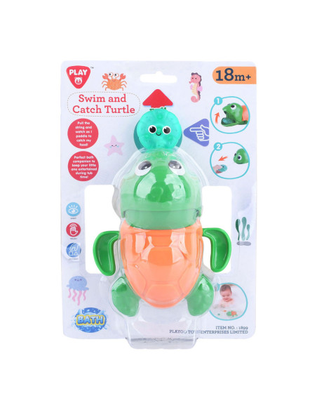 Een geweldig klein speeltje voor kinderen tijdens het badderen! Deze kleine groene schildpad kan de badgenoot van jouw kindje zijn en hem vermaken terwijl je hem wast. Wanneer je aan het touwtje van de schildpad trekt, stormt hij weg om zijn voedsel te vangen. Het voedsel is eigenlijk een groot rond wezen in het groen dat met een touwtje aan de bek van de schildpad is verbonden. Kinderen moeten het wezen eruit trekken, en het touw strekt zich uit, waardoor de schildpad eraan vast blijft zitten. Het is een groene schildpad met een oranje rug. Het kleine wezentje is lichter groen van kleur en heeft twee kleine oogjes. Het is gemaakt van hoogwaardig kunststof waar kinderen veilig mee kunnen spelen. Kinderen zullen genieten van het spelen met hun nieuwe kleine schildpad. Naast hun badkuip kunnen ze er ook mee spelen in andere kleine ruimtes met water. Het is een schattig speeltje om kinderen cadeau te doen bij alle gelegenheden en feesten. Swim & Catch Hungry Turtle wordt aanbevolen voor kinderen van 18 maanden en ouder.