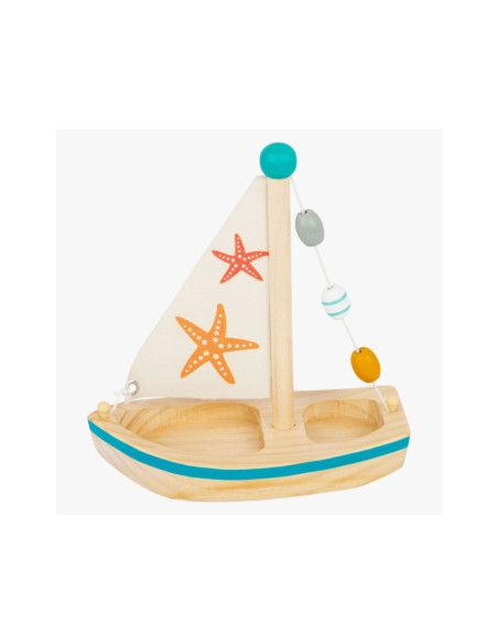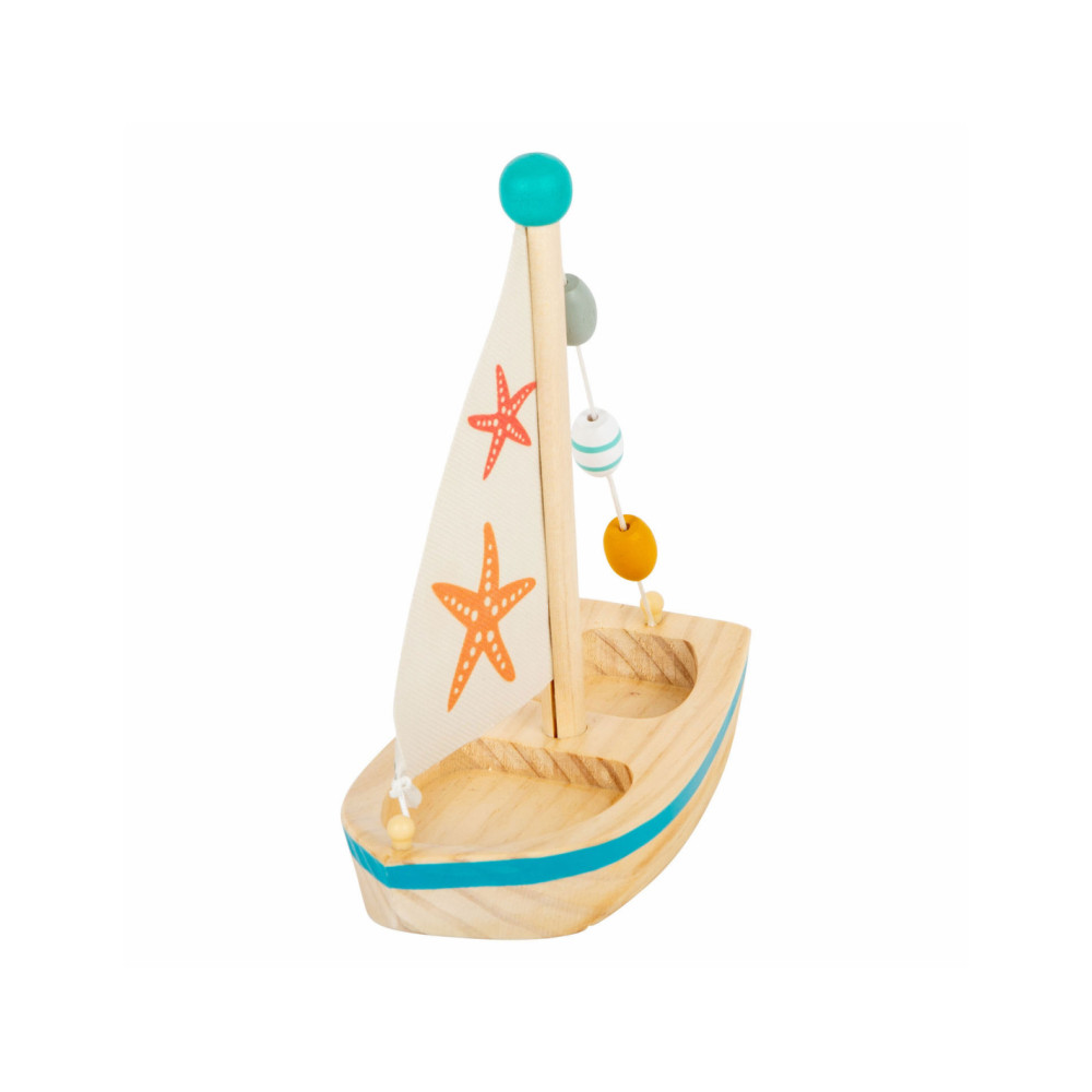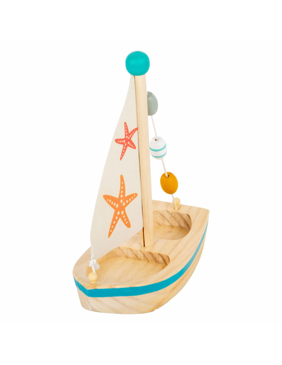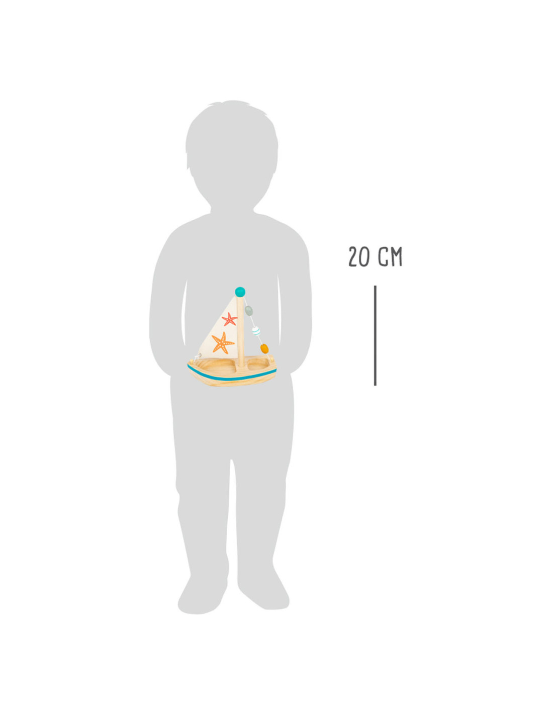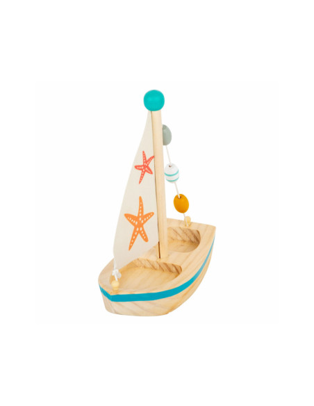 Alle zeekapiteins opgelet! Met deze houten zeilboot zetten kinderen koers naar een wereld vol waterpret. Als de jonge matrozen voor anker gaan en zeilen, staat niets een leuk rollenspel in de badkuip, het kinderbad of het zwembad nog in de weg! En voor nog meer speelplezier is er aan dek ruimte voor een bemanning van andere speelfiguren. Voor een langere levensduur van het product, haal je het uit het water en droog het grondig af na elk gebruik. Geschikt voor kinderen vanaf 24 maanden.