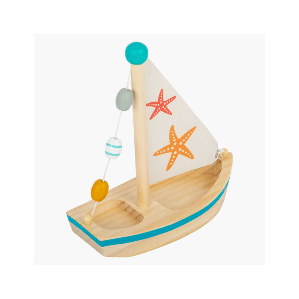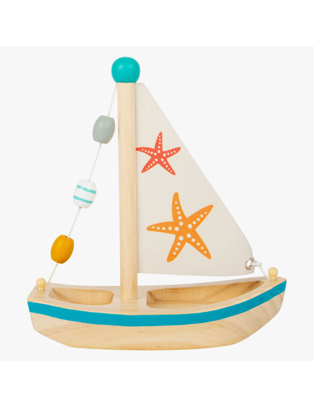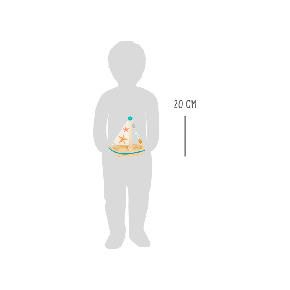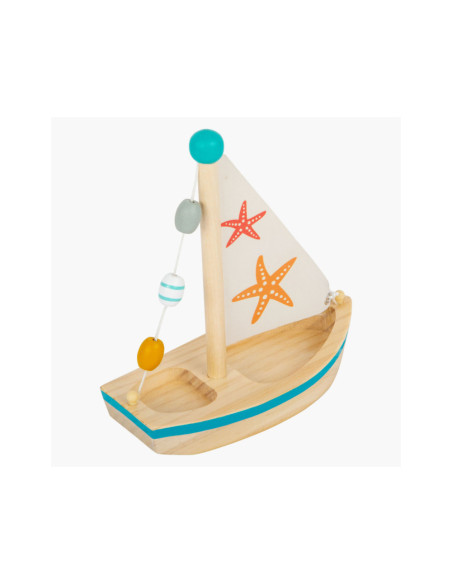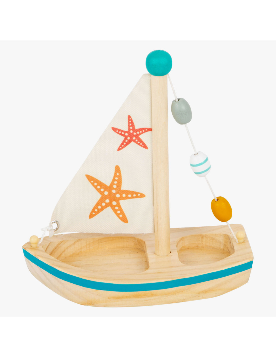 Alle zeekapiteins opgelet! Met deze houten zeilboot zetten kinderen koers naar een wereld vol waterpret. Als de jonge matrozen voor anker gaan en zeilen, staat niets een leuk rollenspel in de badkuip, het kinderbad of het zwembad nog in de weg! En voor nog meer speelplezier is er aan dek ruimte voor een bemanning van andere speelfiguren. Voor een langere levensduur van het product, haal je het uit het water en droog het grondig af na elk gebruik. Geschikt voor kinderen vanaf 24 maanden.