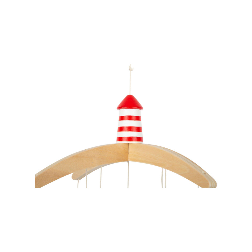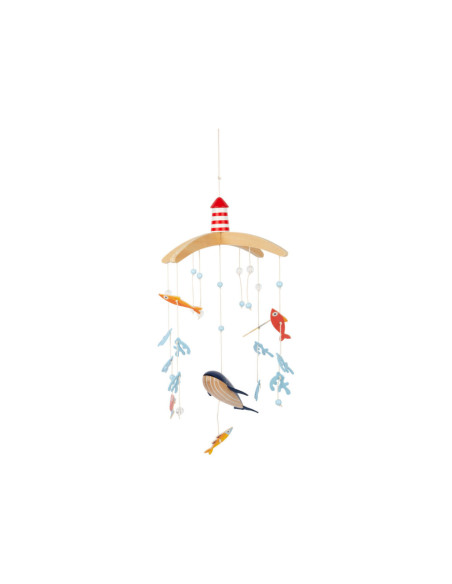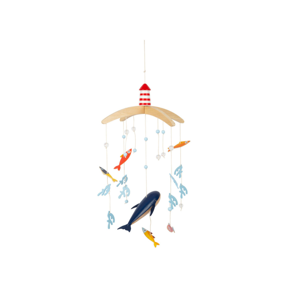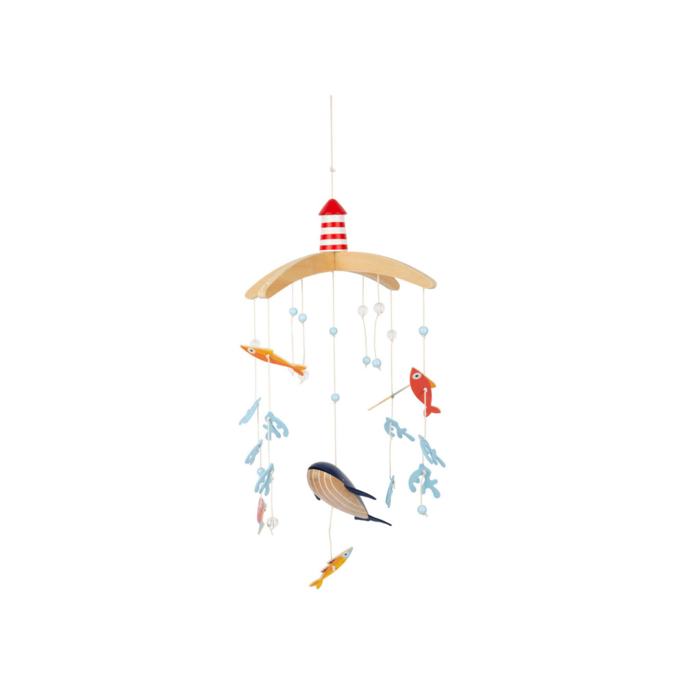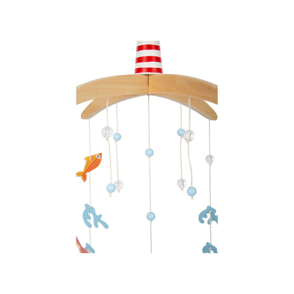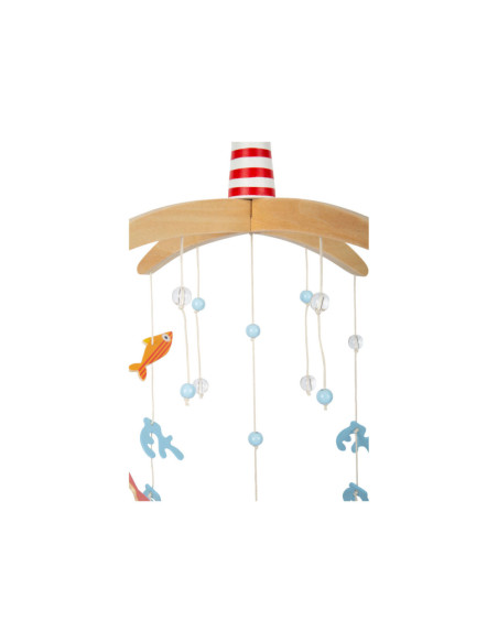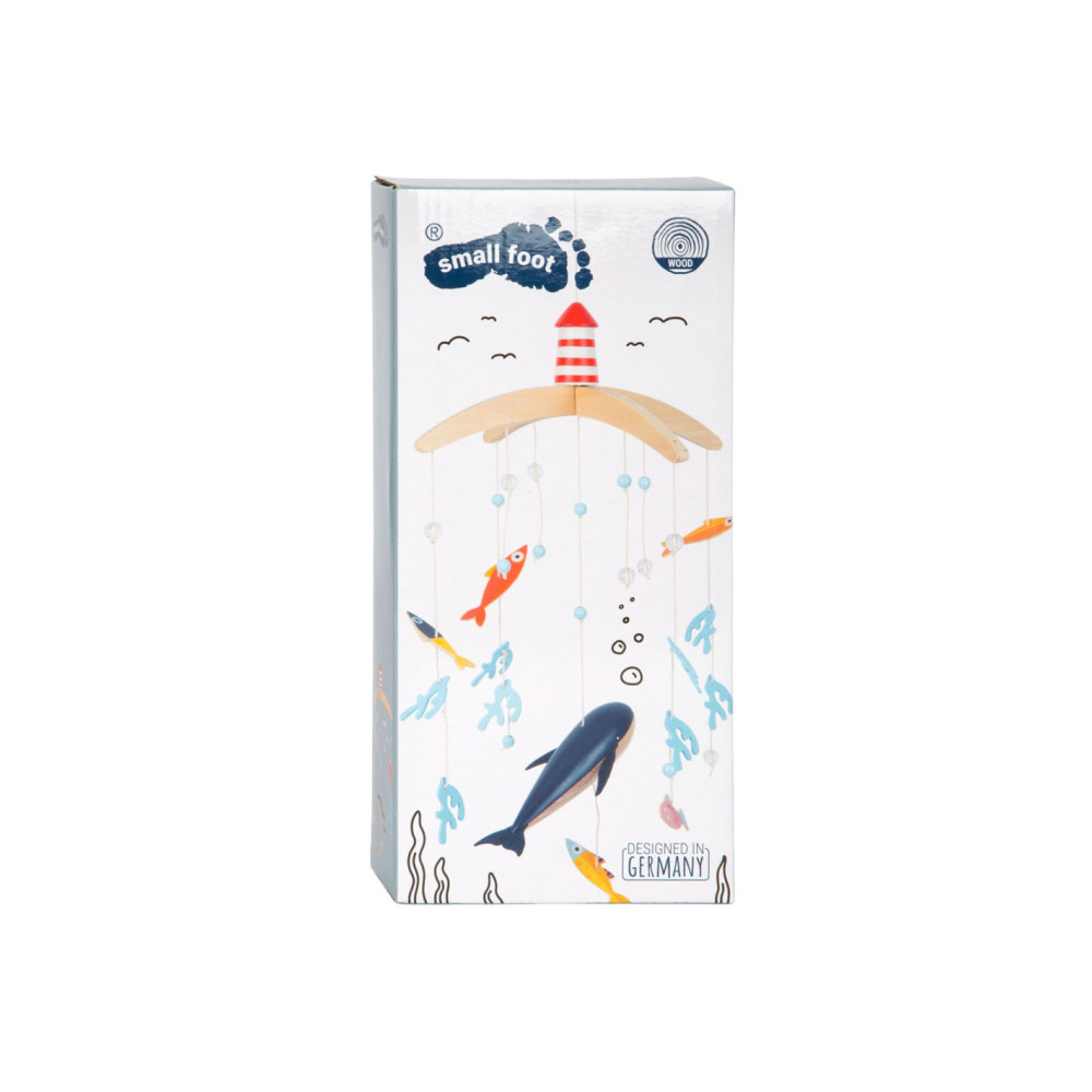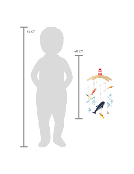 Vanuit het perspectief van kinderen zijn de driedimensionale mobiele elementen en sterk contrasterende kleuren goed zichtbaar. Als deze kinderkameraccessoire ronddraait, is het voor de jonge waarnemers bijzonder interessant om te zien hoe de vissen op een rustige manier in een cirkel zwemmen. Met de grote vuurtoren is deze mobiel een geweldige decoratieve blikvanger in de kinderkamer - en niet alleen voor de jonge, beginnende diepzeeduikers!