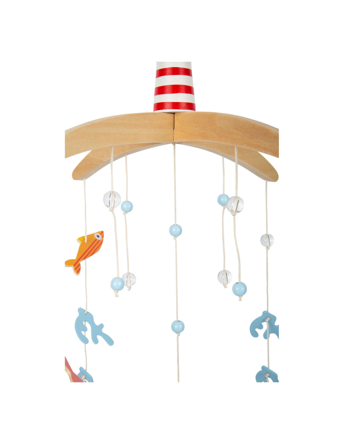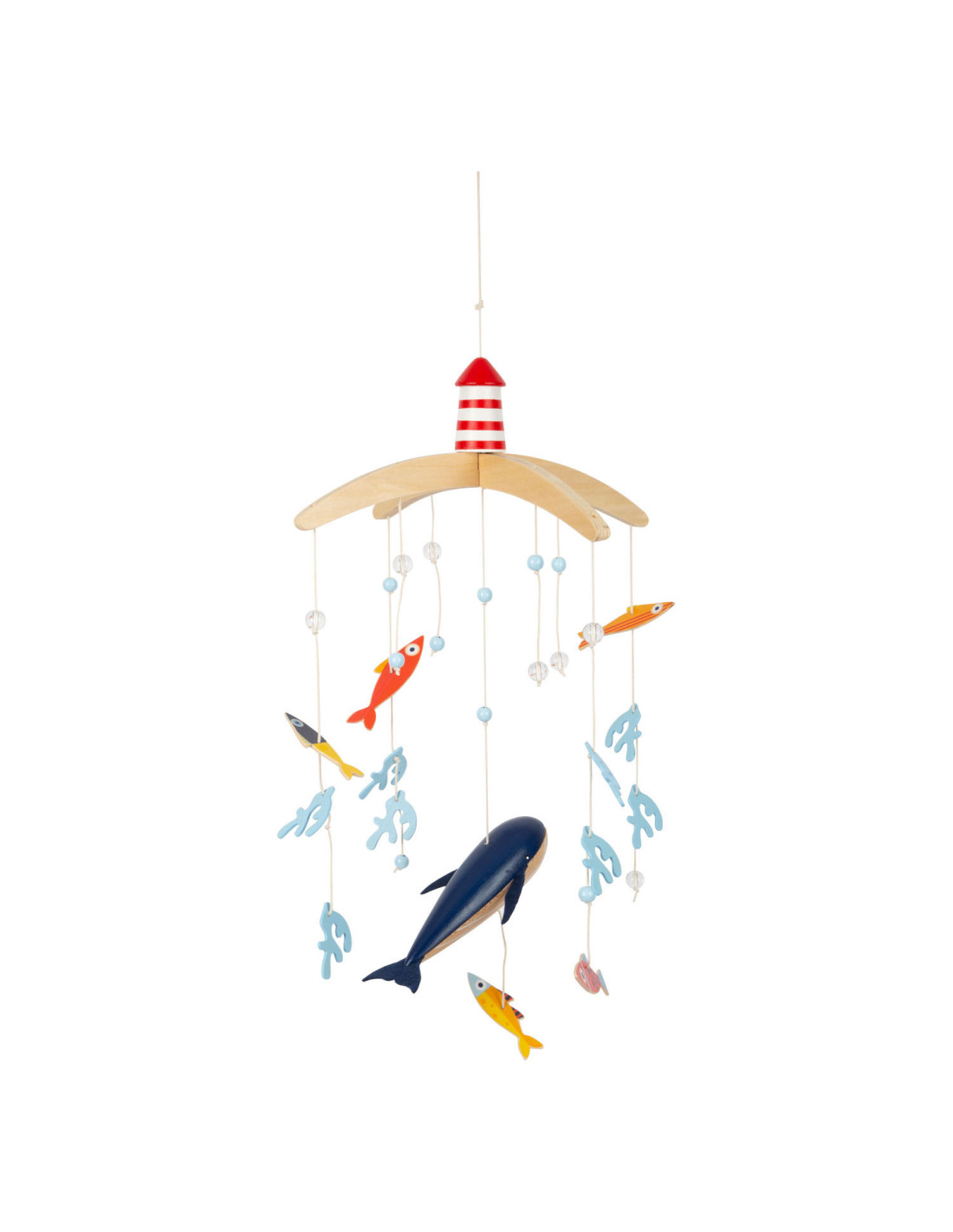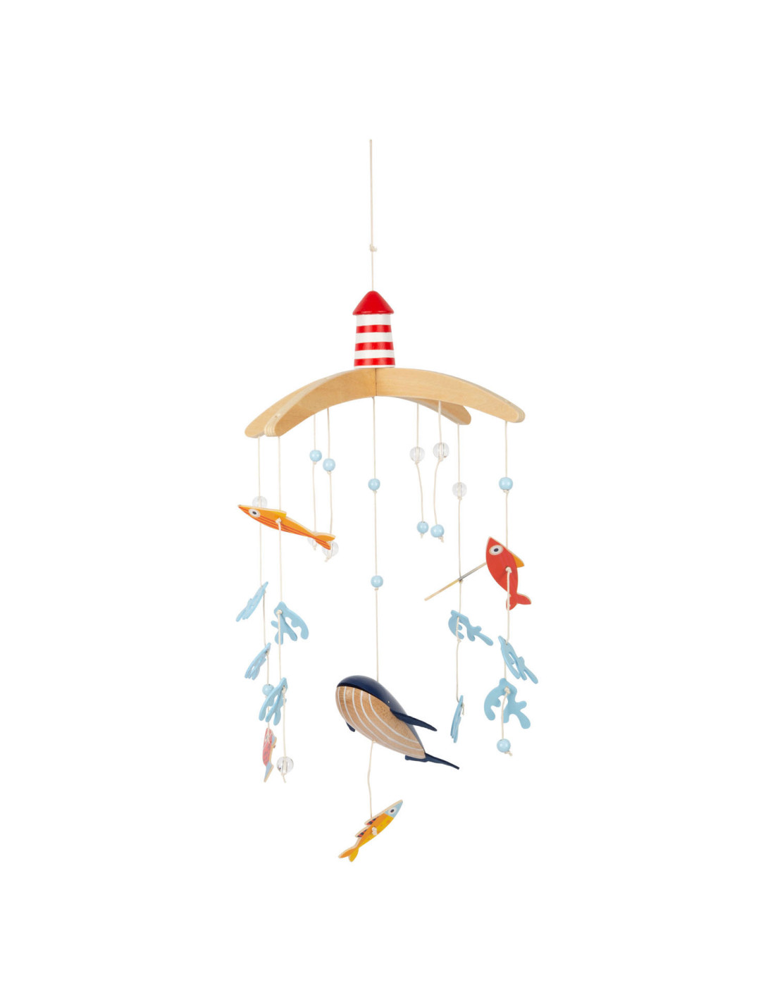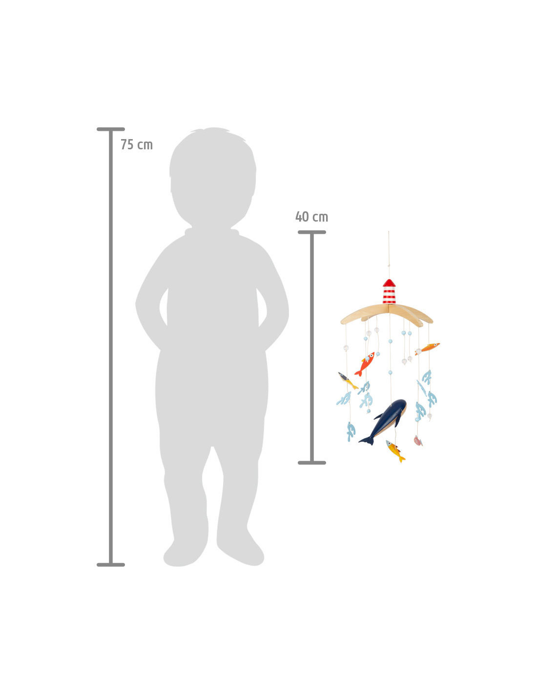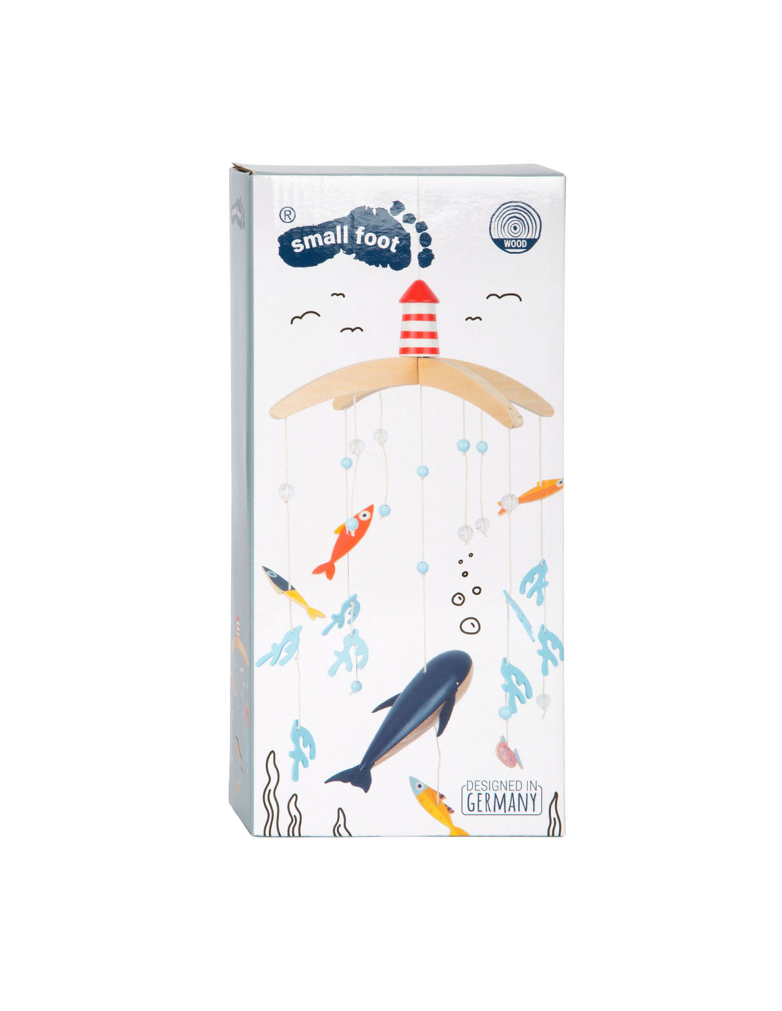 Vanuit het perspectief van kinderen zijn de driedimensionale mobiele elementen en sterk contrasterende kleuren goed zichtbaar. Als deze kinderkameraccessoire ronddraait, is het voor de jonge waarnemers bijzonder interessant om te zien hoe de vissen op een rustige manier in een cirkel zwemmen. Met de grote vuurtoren is deze mobiel een geweldige decoratieve blikvanger in de kinderkamer - en niet alleen voor de jonge, beginnende diepzeeduikers!