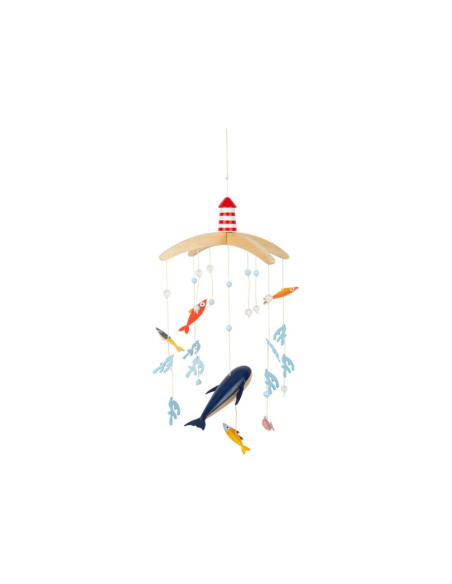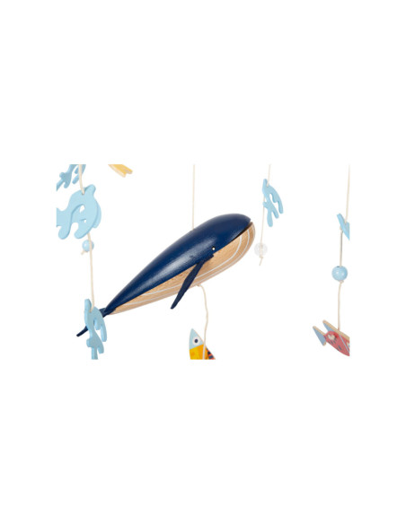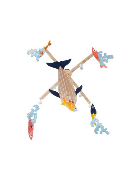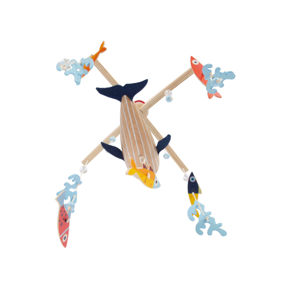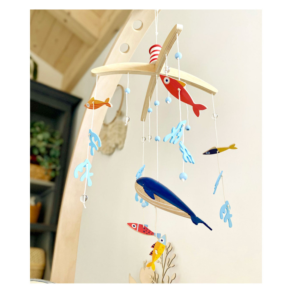 Een houten 3D-mobiel in zeethema, waarmee kinderen kunnen duiken in de spannende onderwaterwereld van de blauwe vinvis! Tussen de algen en luchtbellen zwemmen vissen in felle kleuren rond. De grote walvis zwemt rustig in het midden van de mobiel met zijn vilten vinnen en trekt de aandacht van iedereen. Wanneer het boven het babybed of de commode wordt gemonteerd, moedigt het baby's aan om verwonderd te kijken en weg te dromen!